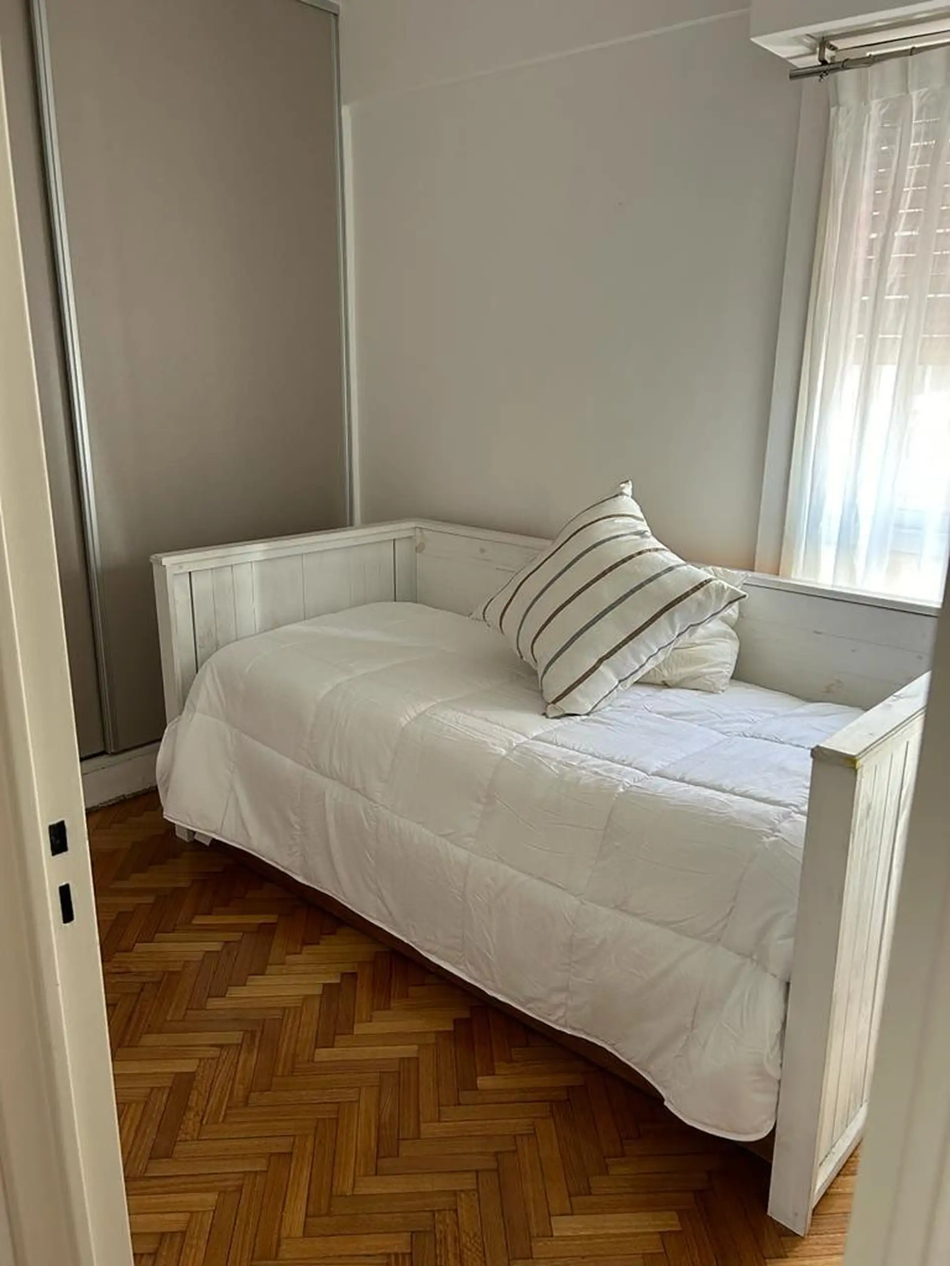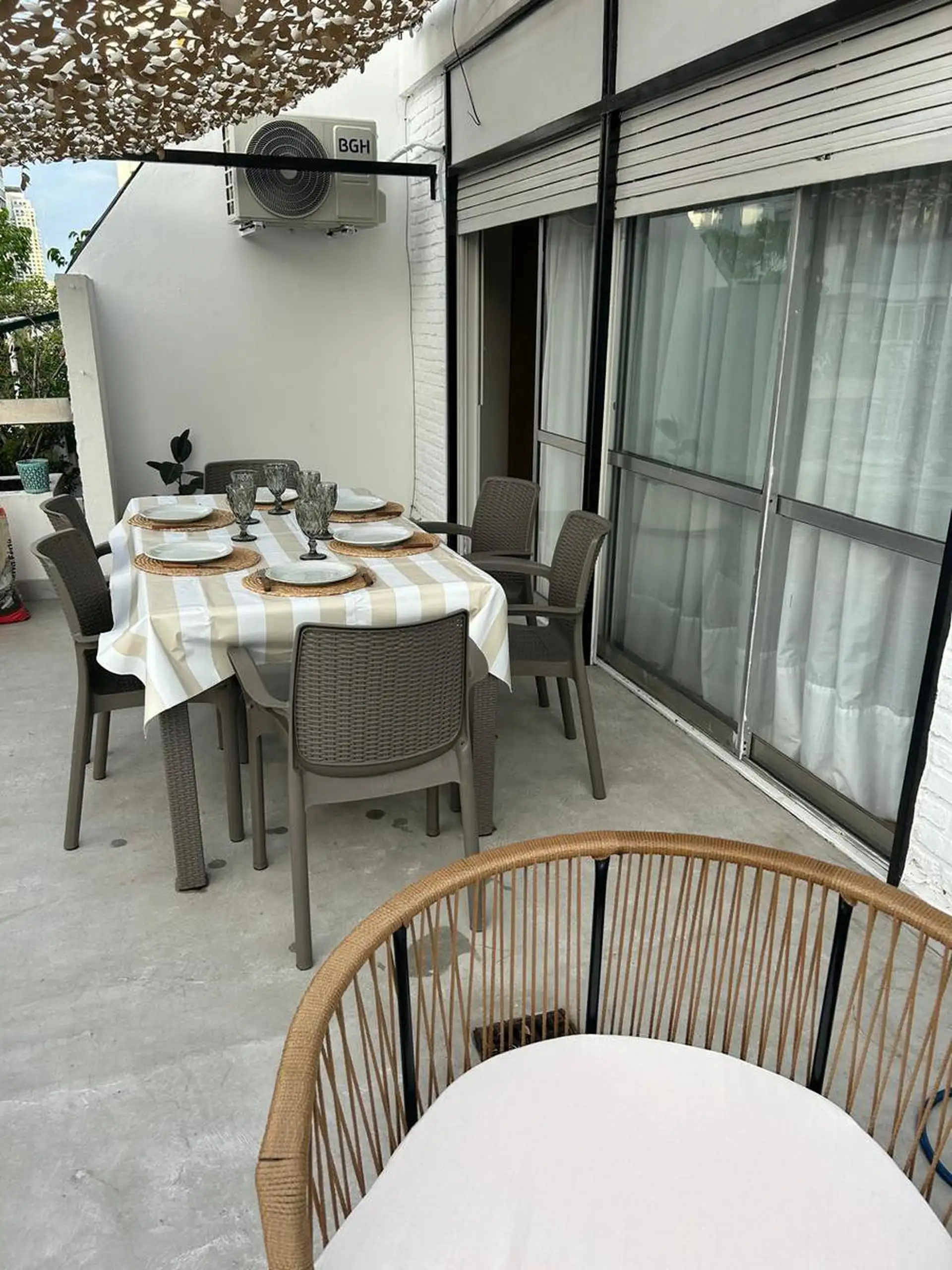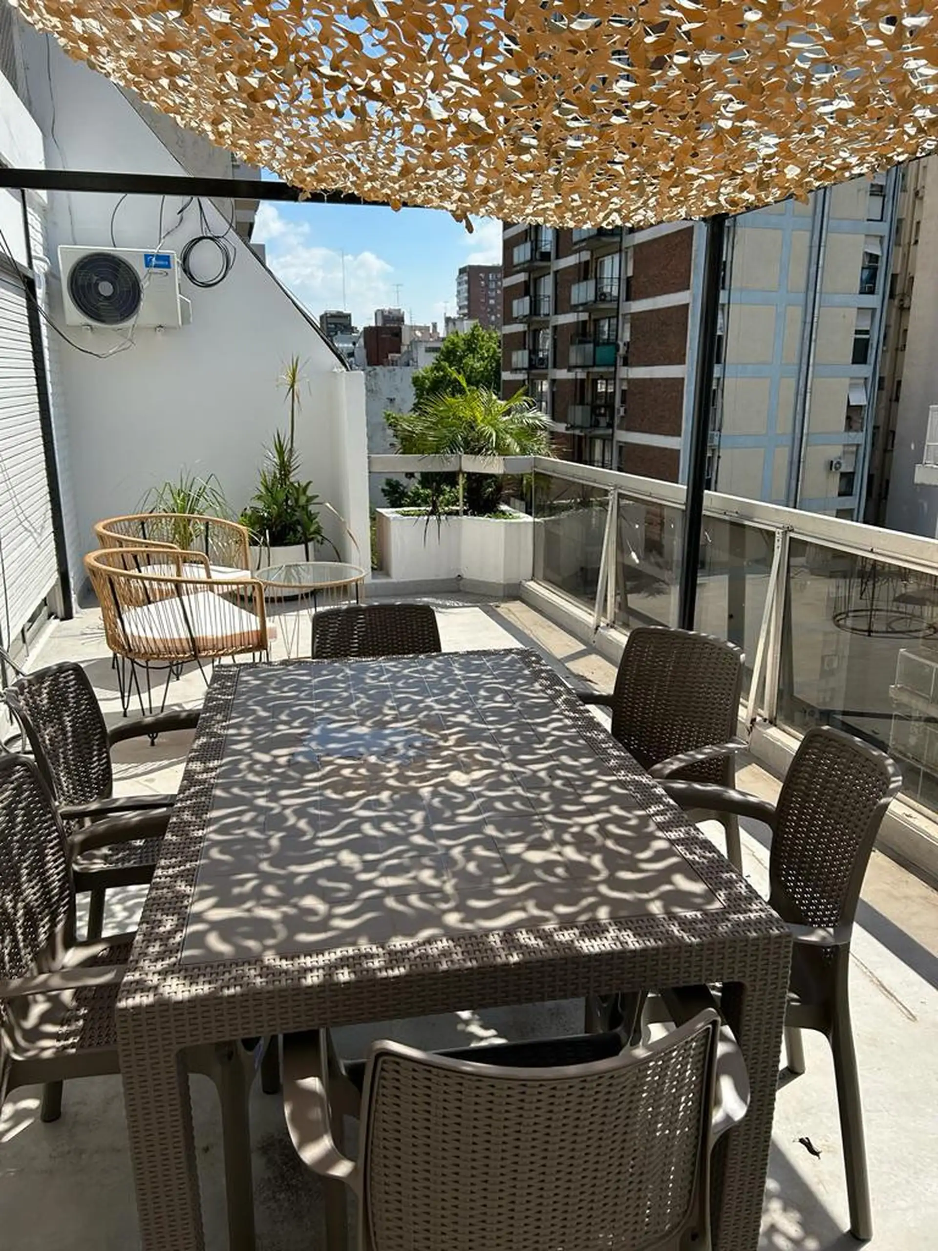 Apartamento de temporada com 5 ambientes, em andar alto, com varanda-terraço, em Palermo. São 130 m² cobertos e 30 m² descobertos, mobiliado e equipado. Possui 4 quartos (1 cama de casal, 2 camas de solteiro e 1 cama de solteiro adicional), sala com TV de 42" e ar-condicionado, cozinha com fogão de 4 bocas e forno, micro-ondas, cafeteira e geladeira, além de lavanderia com lavadora e tanque de mão. Há 1 lavabo e 2 banheiros completos, com aquecimento central da água quente, calefação, ventilador