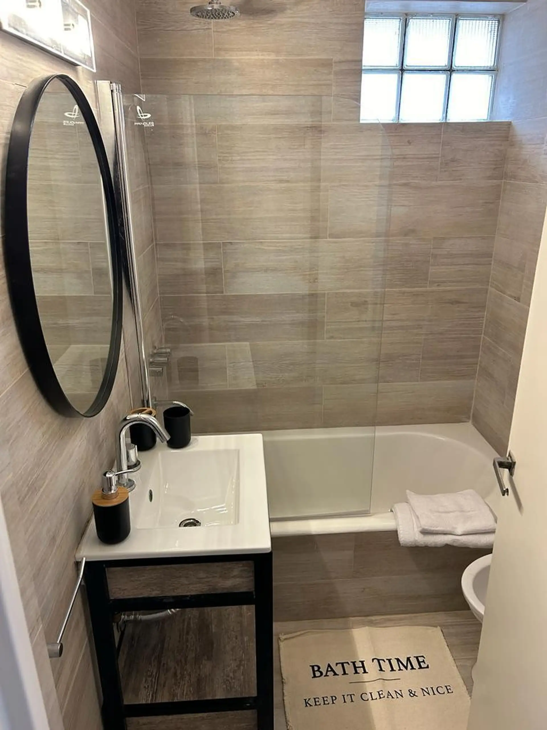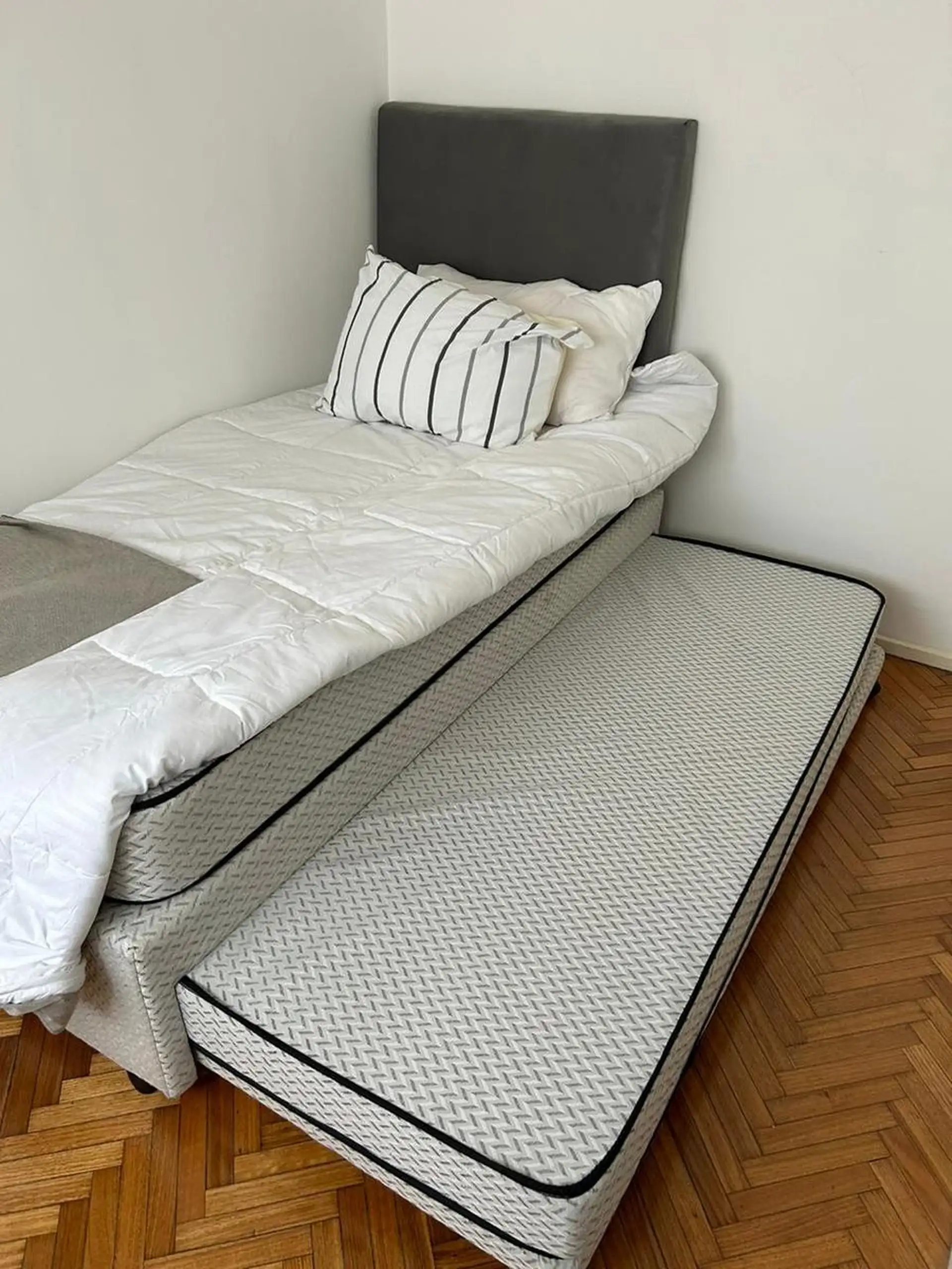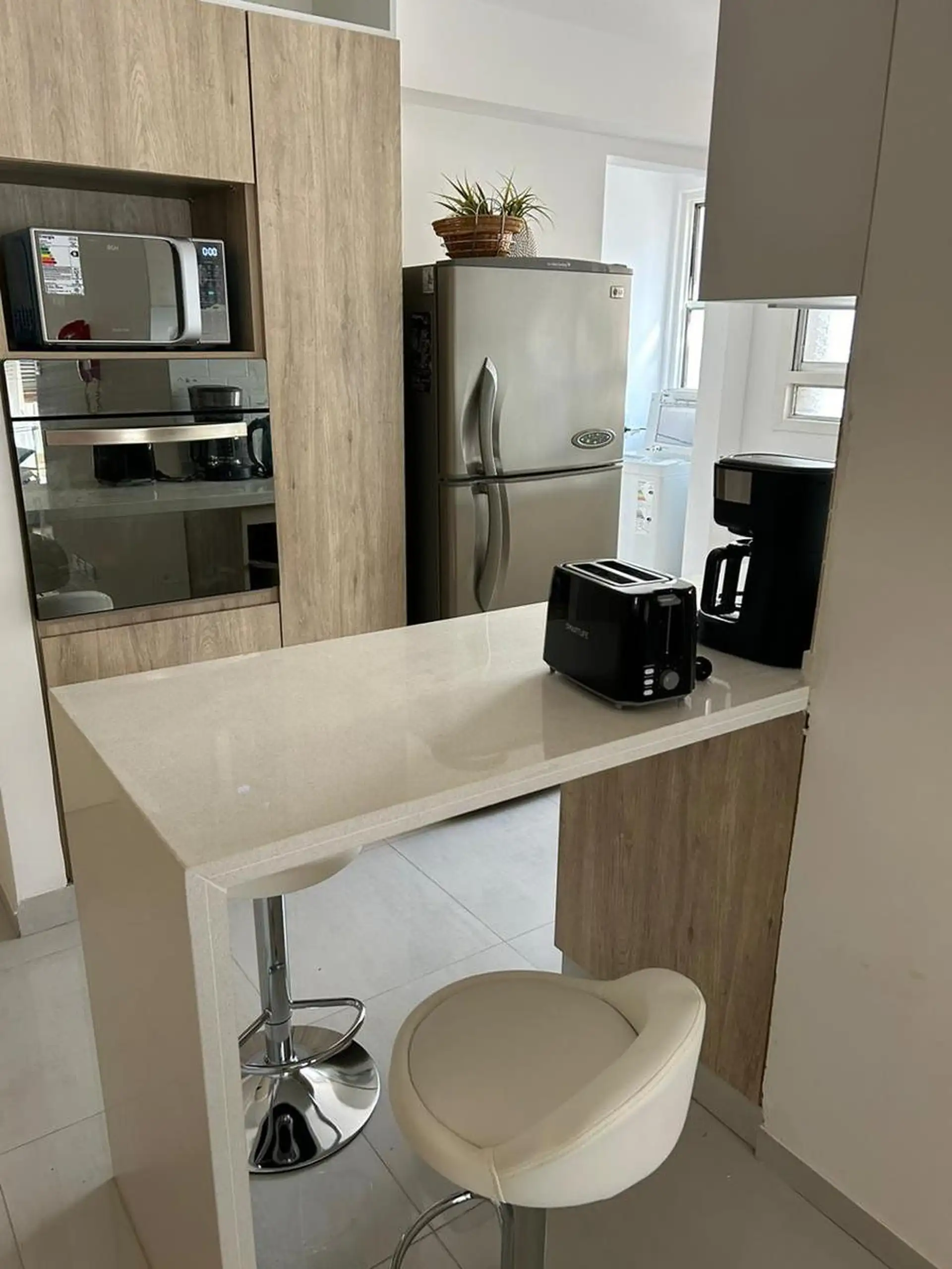 Apartamento de temporada com 5 ambientes, em andar alto, com varanda-terraço, em Palermo. São 130 m² cobertos e 30 m² descobertos, mobiliado e equipado. Possui 4 quartos (1 cama de casal, 2 camas de solteiro e 1 cama de solteiro adicional), sala com TV de 42" e ar-condicionado, cozinha com fogão de 4 bocas e forno, micro-ondas, cafeteira e geladeira, além de lavanderia com lavadora e tanque de mão. Há 1 lavabo e 2 banheiros completos, com aquecimento central da água quente, calefação, ventilador