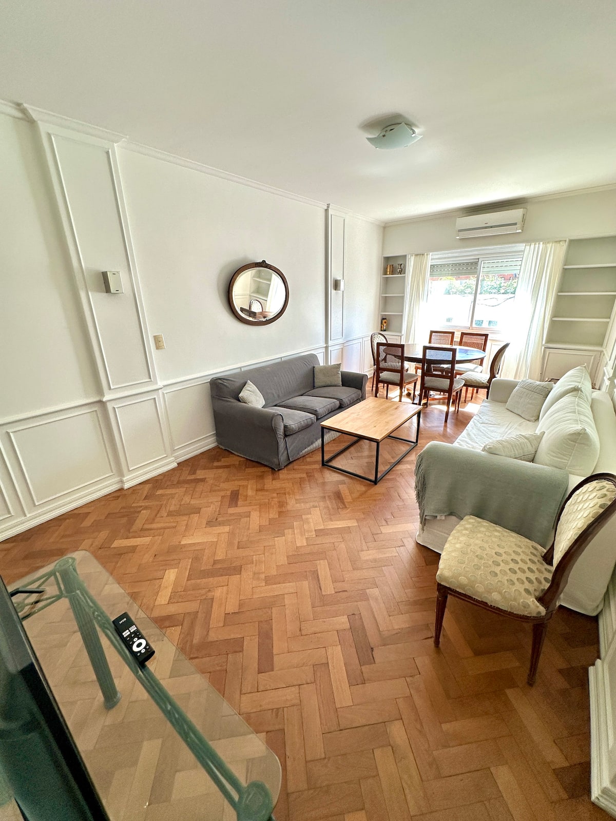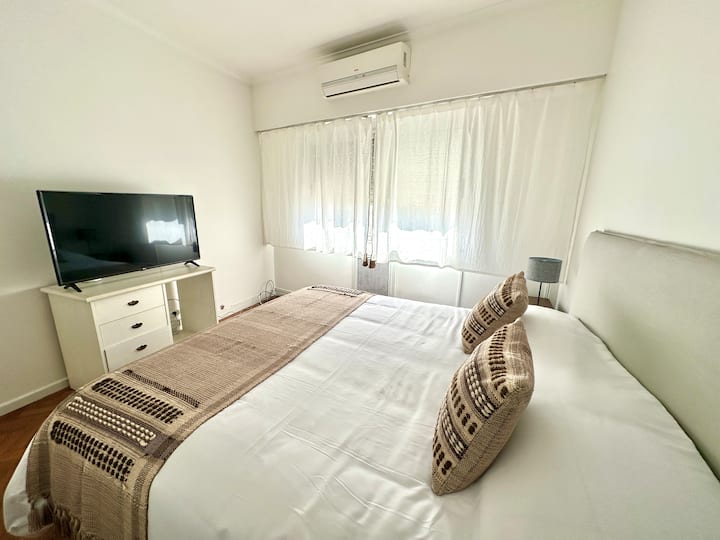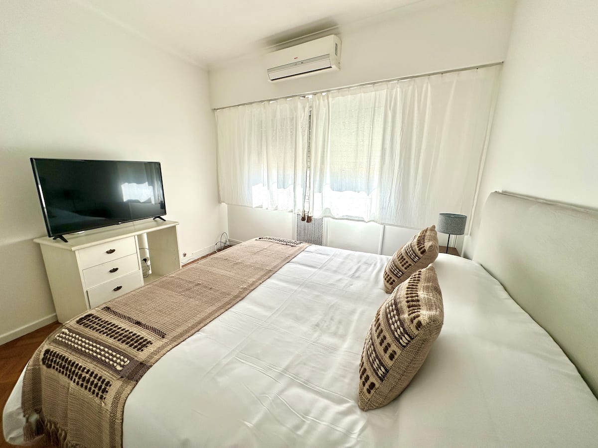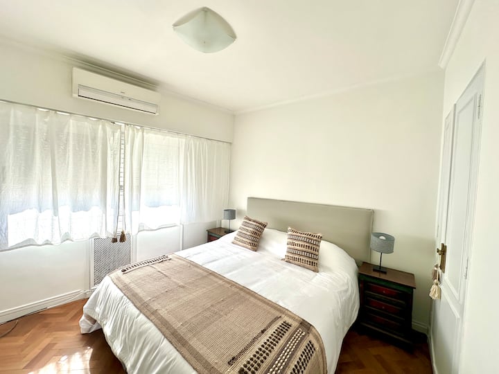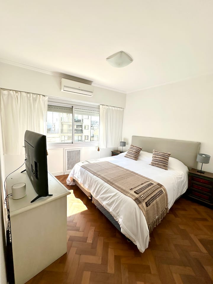 Apartamento em Recoleta, Av Alvear, com 4 quartos e 130 m². O imóvel tem área de cozinha com mesa de refeições, sala de estar, 3 banheiros (2 com chuveiro e 1 com banheira) e acesso a Wi-Fi. A cozinha inclui máquina de lavar, geladeira, micro-ondas, chaleira elétrica, cafeteira e torradeira; há mesas de trabalho em 3 quartos. Sala e quarto principal têm ar-condicionado e Smart TV; os outros dois quartos têm ventiladores. Está descrito como acomodando até 7 pessoas, com 1 cama king (2,0 x 2,0), 1