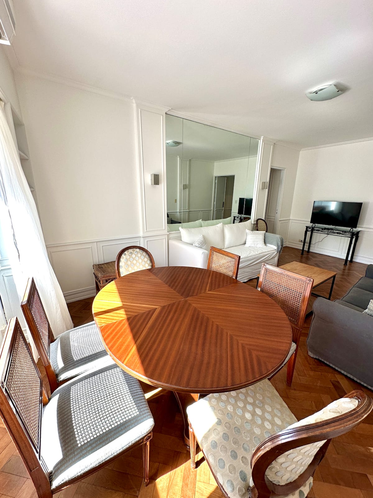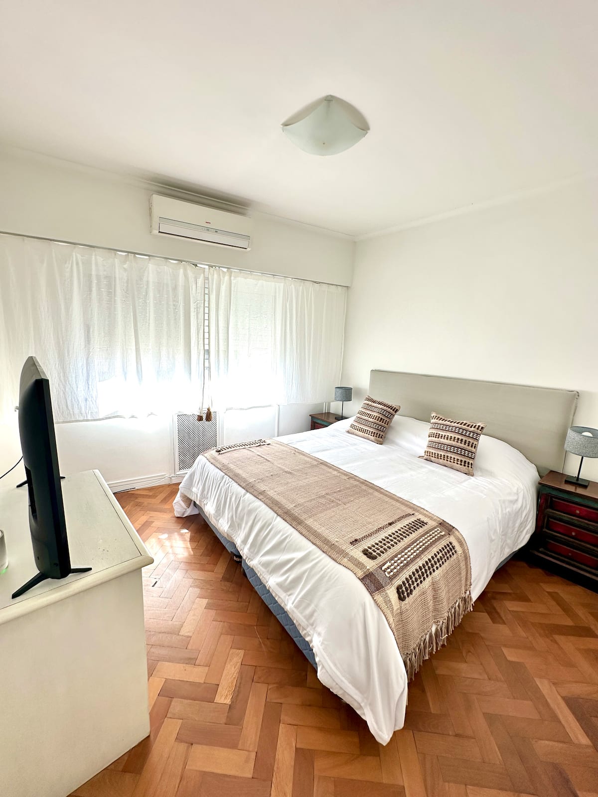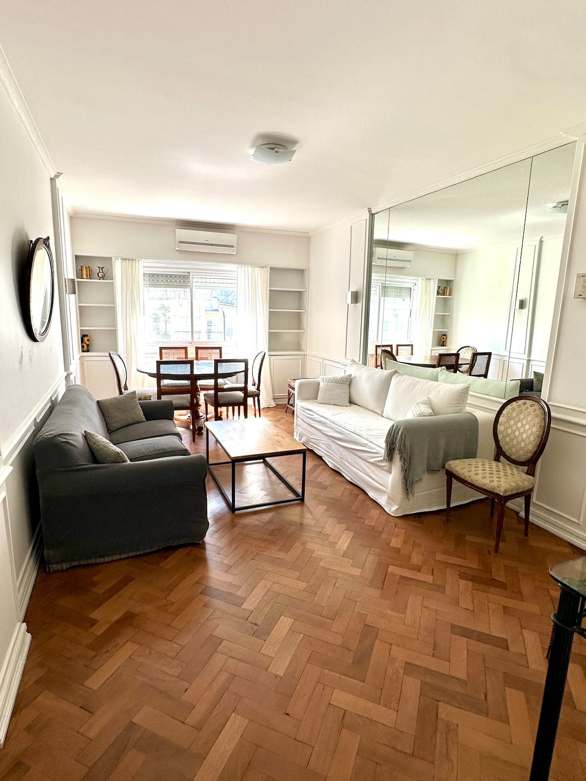 Apartamento em Recoleta, Av Alvear, com 4 quartos e 130 m². O imóvel tem área de cozinha com mesa de refeições, sala de estar, 3 banheiros (2 com chuveiro e 1 com banheira) e acesso a Wi-Fi. A cozinha inclui máquina de lavar, geladeira, micro-ondas, chaleira elétrica, cafeteira e torradeira; há mesas de trabalho em 3 quartos. Sala e quarto principal têm ar-condicionado e Smart TV; os outros dois quartos têm ventiladores. Está descrito como acomodando até 7 pessoas, com 1 cama king (2,0 x 2,0), 1