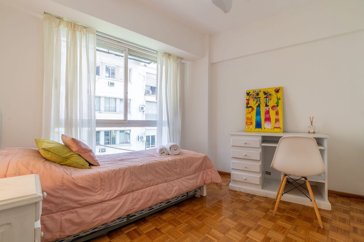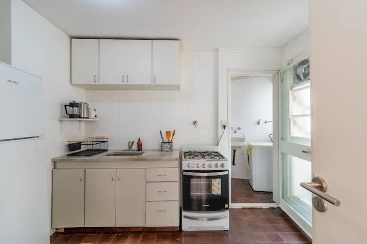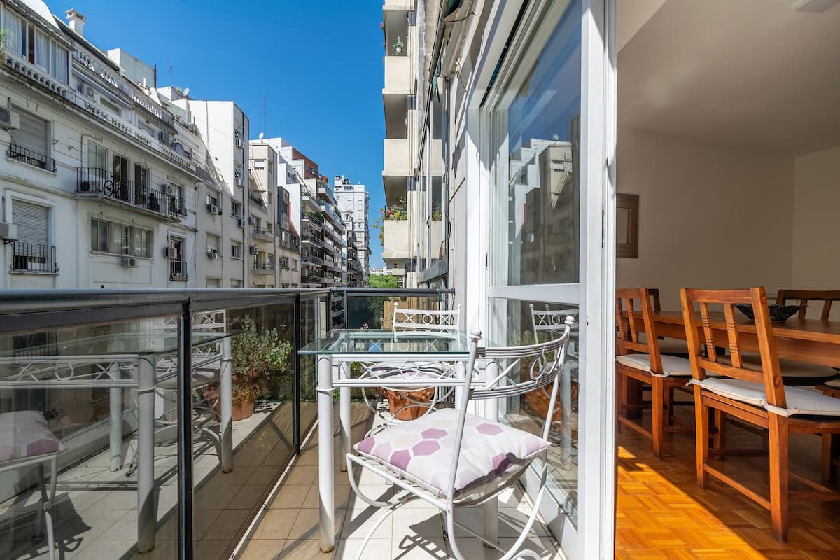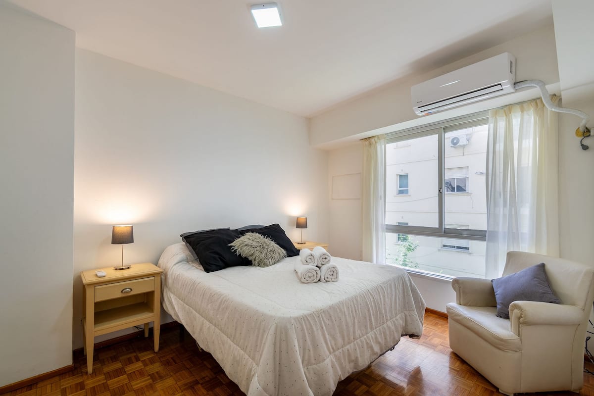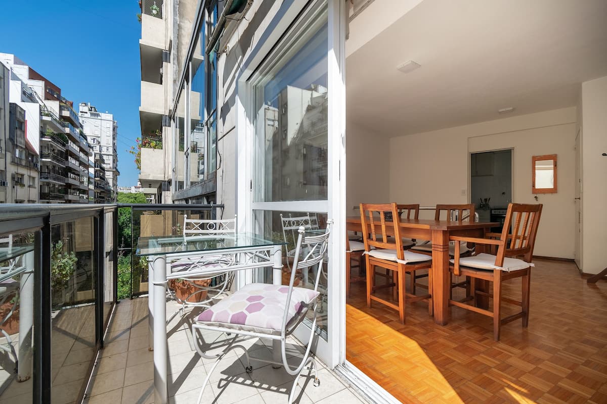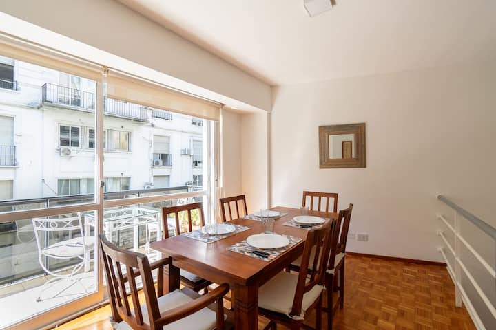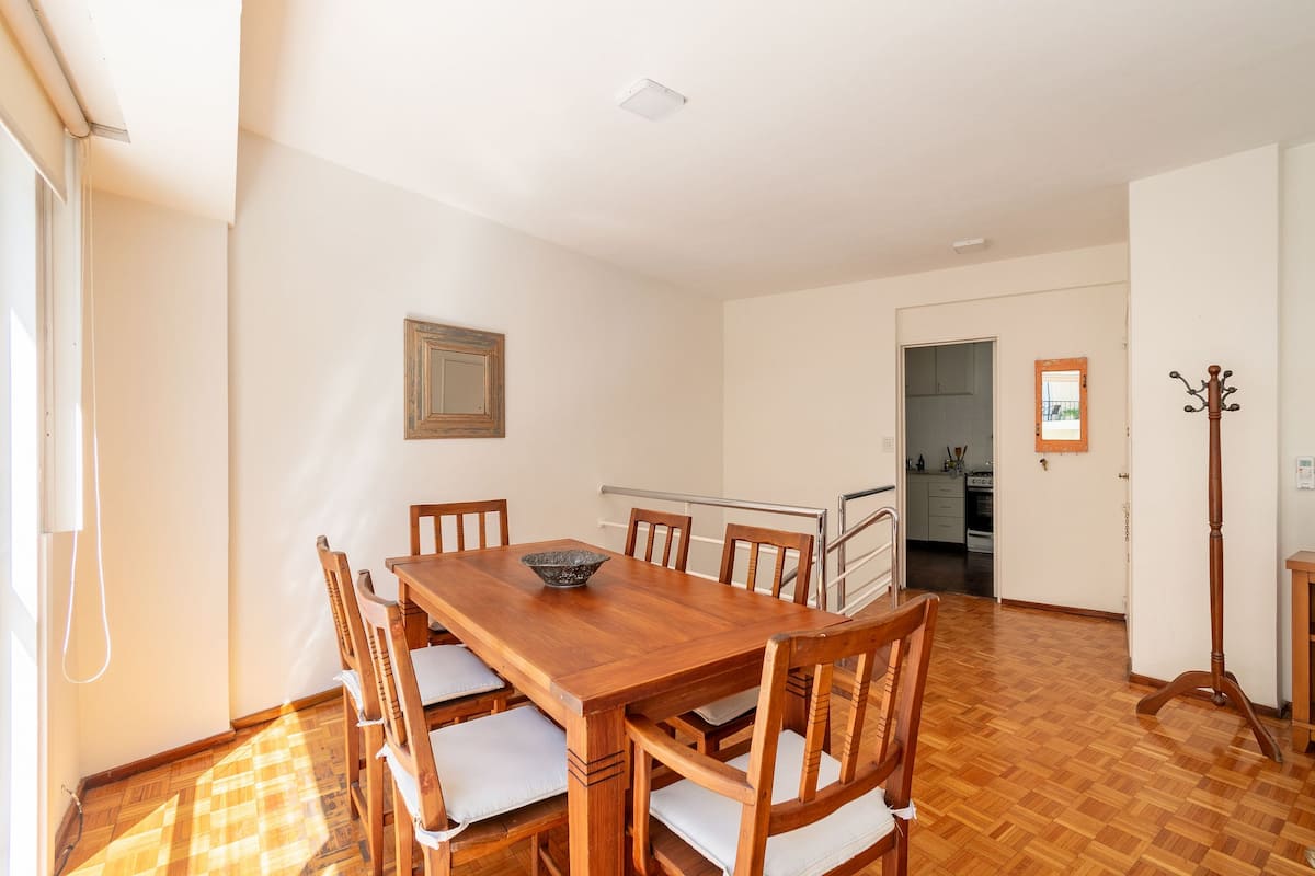 Apartamento duplex de dois andares em Recoleta, com 4 quartos. O imóvel é mobiliado e totalmente equipado, com Wi-Fi, TV e varanda, além de ar-condicionado no quarto e na sala. Conta com máquina de lavar roupa. No living e sala de jantar há sofá e mesa para 6 pessoas. Há 1 quarto com cama queen e 3 quartos com camas de solteiro (configurações de 1 e 2 camas). A cozinha tem área de lavanderia e há 1 banheiro.