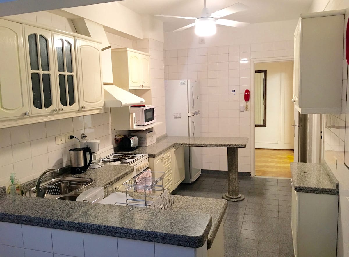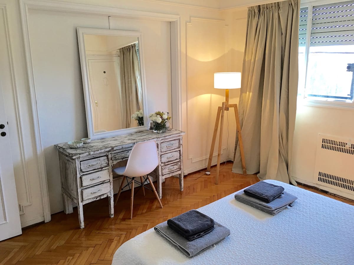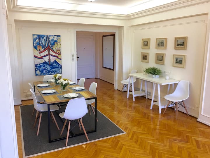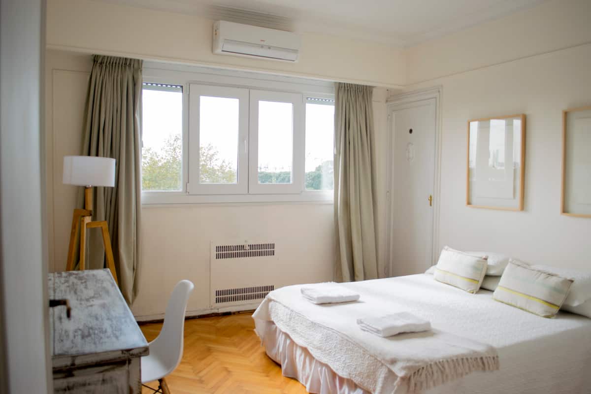 Apartamento em Recoleta com 4 quartos, 3 banheiros e capacidade para 8 hóspedes. O ar-condicionado (split quente/frio) está instalado na sala e em 2 quartos; nos outros 2 quartos há ventiladores. Há Wi-Fi, toalhas e roupa de cama. A acomodação menciona janela com vista para o Parque Thays.