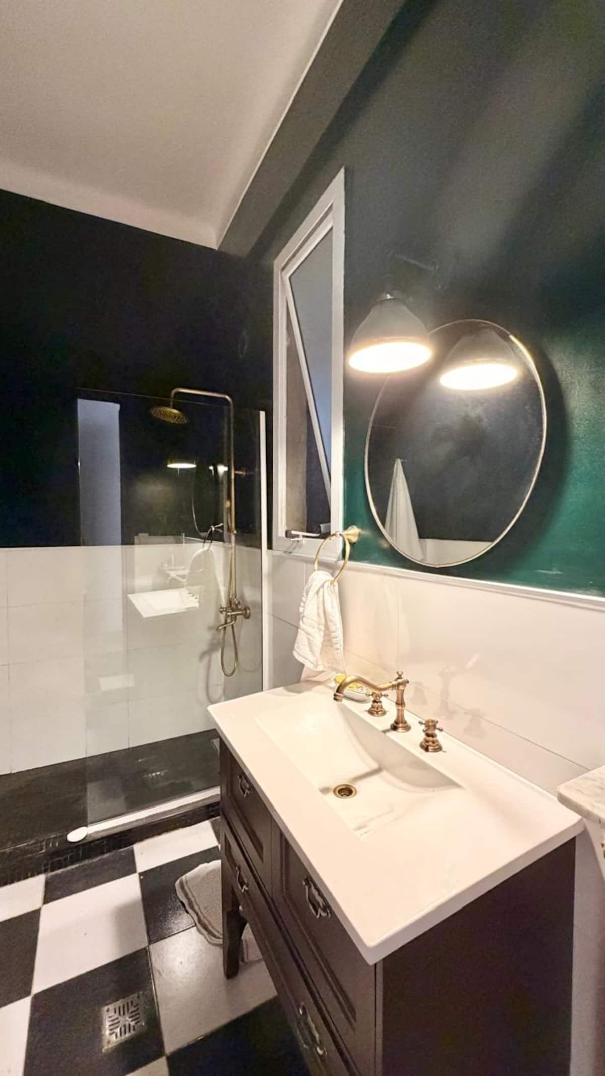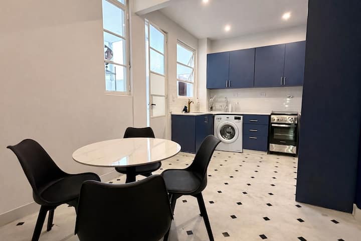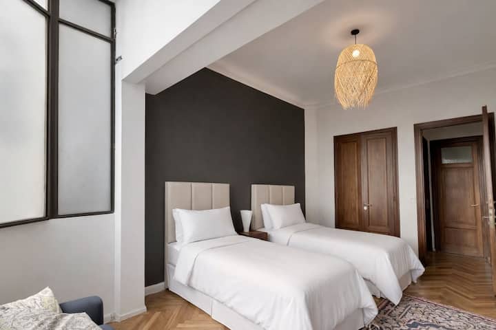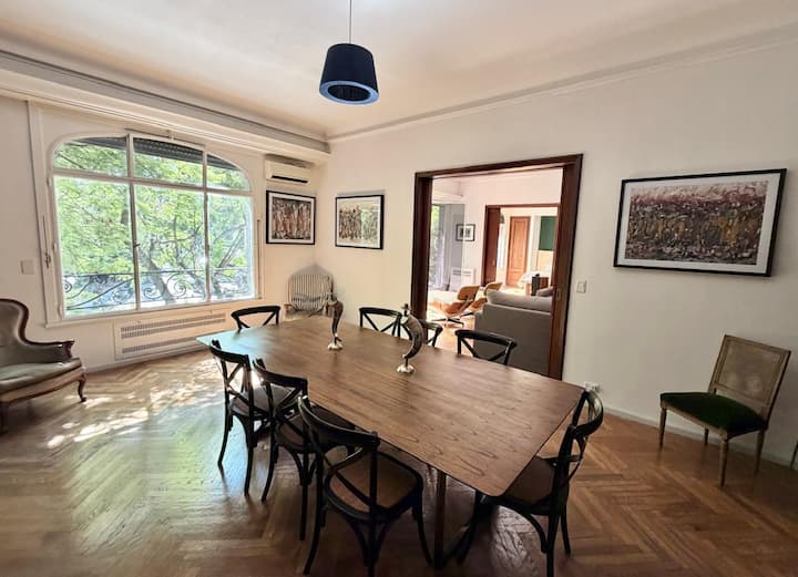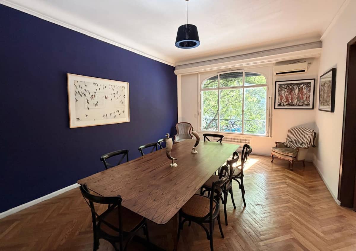 Apartamento de 220 m² em Retiro, com 4 dormitórios e pé-direito alto. Possui 3 banheiros completos, sala de estar com varanda com vista para a Plaza San Martín e a Calle Florida, e sala de jantar com mesa para 10 pessoas. A cozinha é separada, e o imóvel fica de frente para San Martín Park e o Palacio Paz.