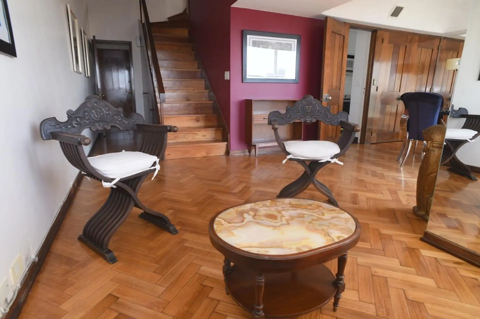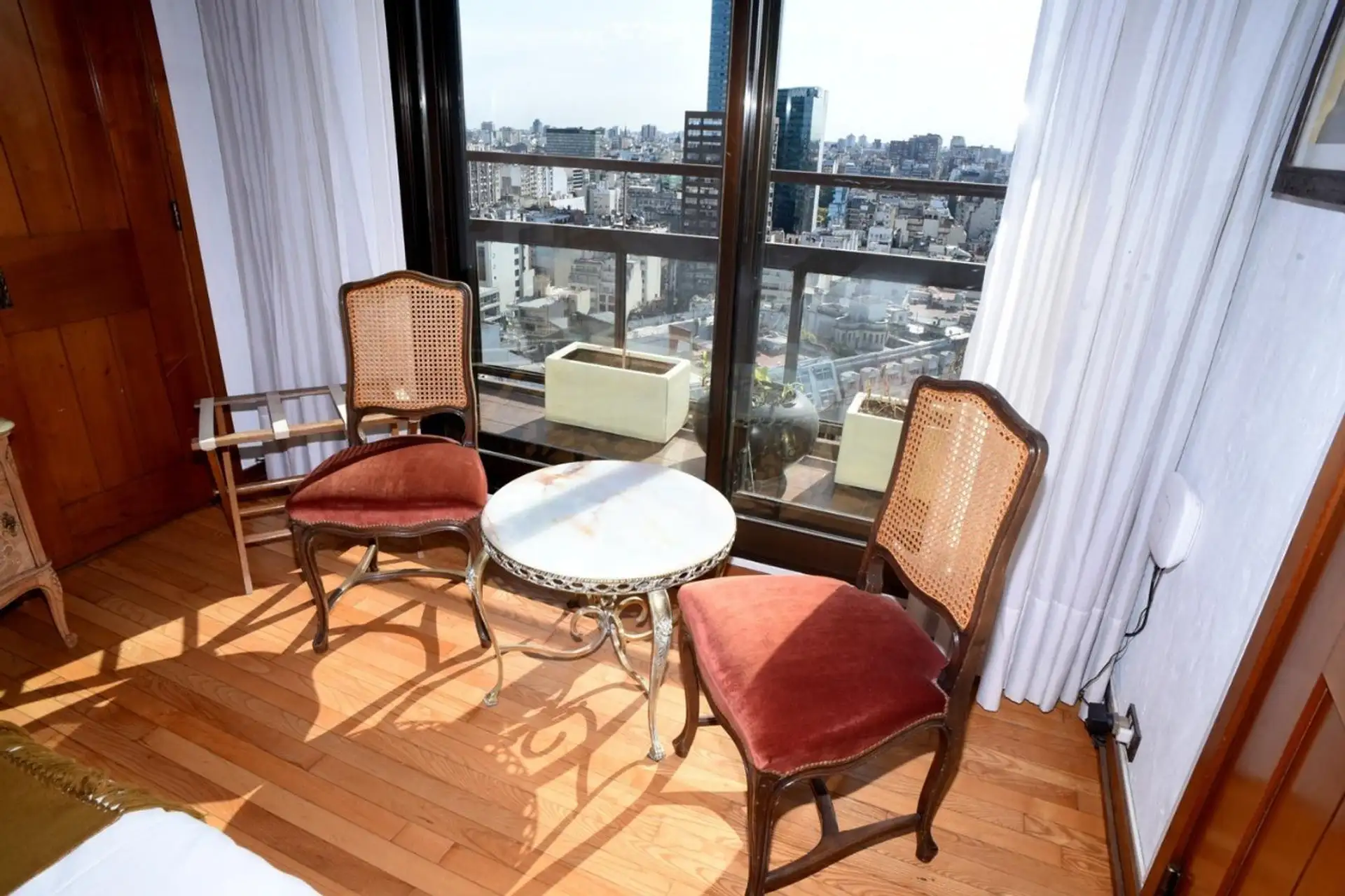Penthouse em apartamentos de 2 andares, nos pisos 22 e 23, em Retiro, de frente para a Plaza San Martín e próximo ao Hotel Plaza, na Calle Florida. São 250 m² com 4 dormitórios em suíte, dependências de serviço e dois living com sala de jantar. O imóvel tem terraço privativo de 50 m² com piscina privativa, mobiliado e equipado, com ar-condicionado. Há segurança com câmeras nos pisos e recepção de mensagens e encomendas 24 horas, além de vaga de garagem privativa. O preço mensal é de US$ 3000 (pa