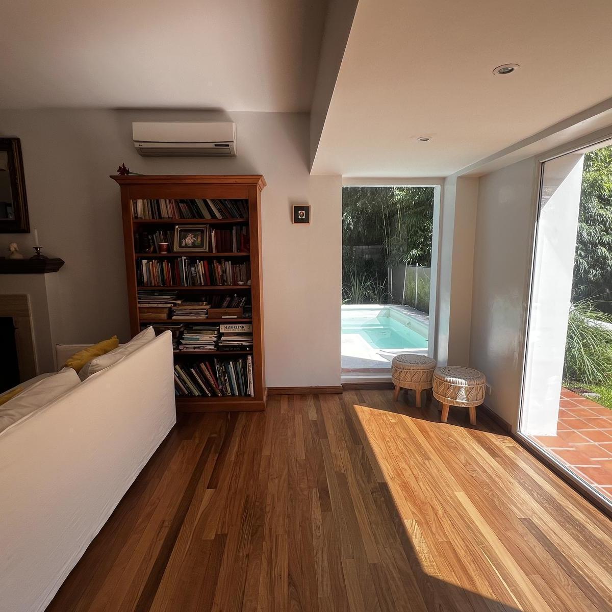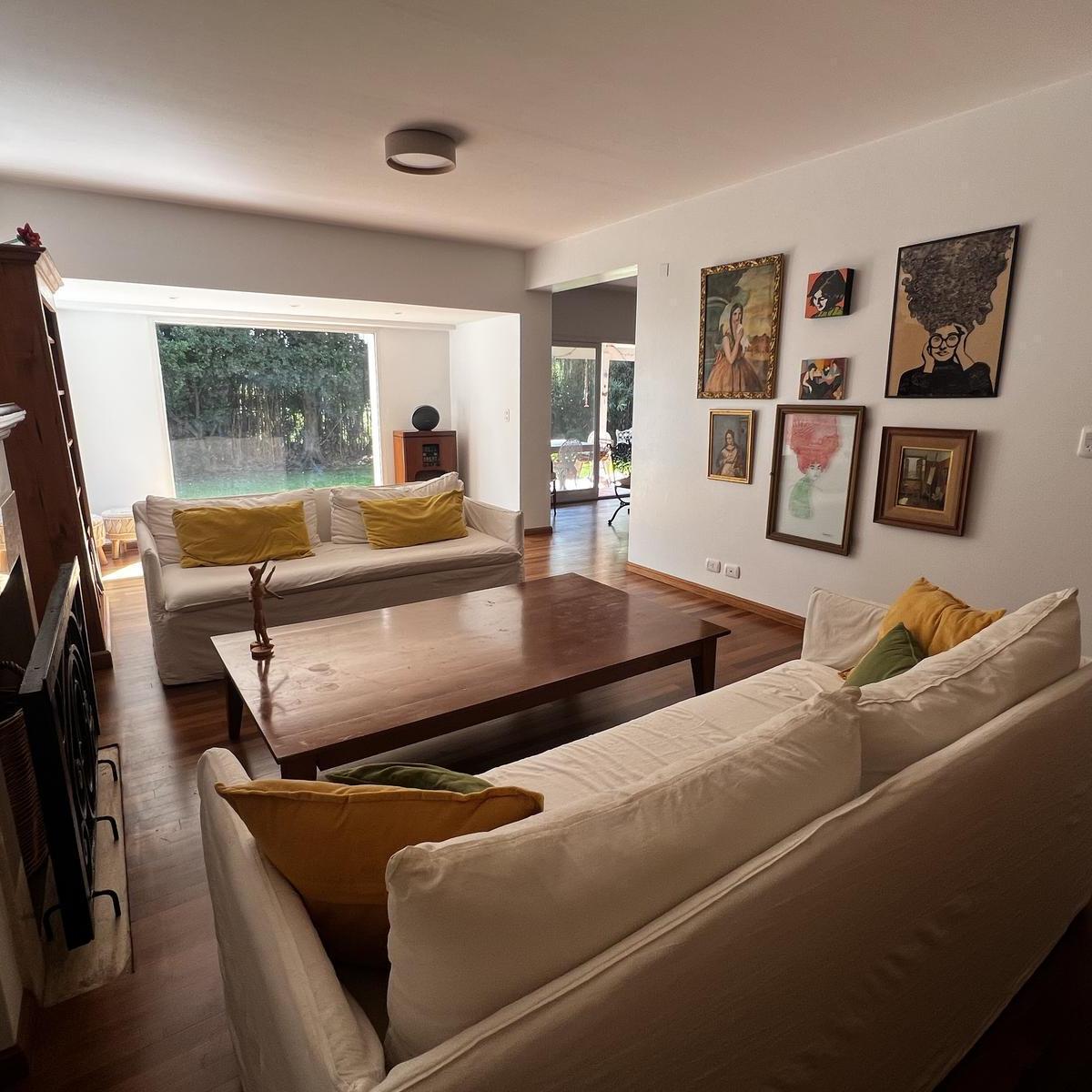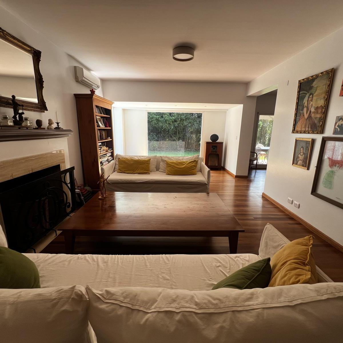 Casa para aluguel temporário com hall de entrada, living amplo com ar-condicionado e janelas voltadas para o jardim. Área de jantar independente com vista para a galeria, lavabo e cozinha com lavar-louças. Family/área de estar com saída para o jardim, lavanderia com lavadora e secadora e dependência com banheiro. No piso superior há 4 quartos, sendo a suíte principal com banheiro com chuveiro, jacuzzi independente, closet, ar-condicionado e janela para o jardim; a suíte júnior com placar e banhe