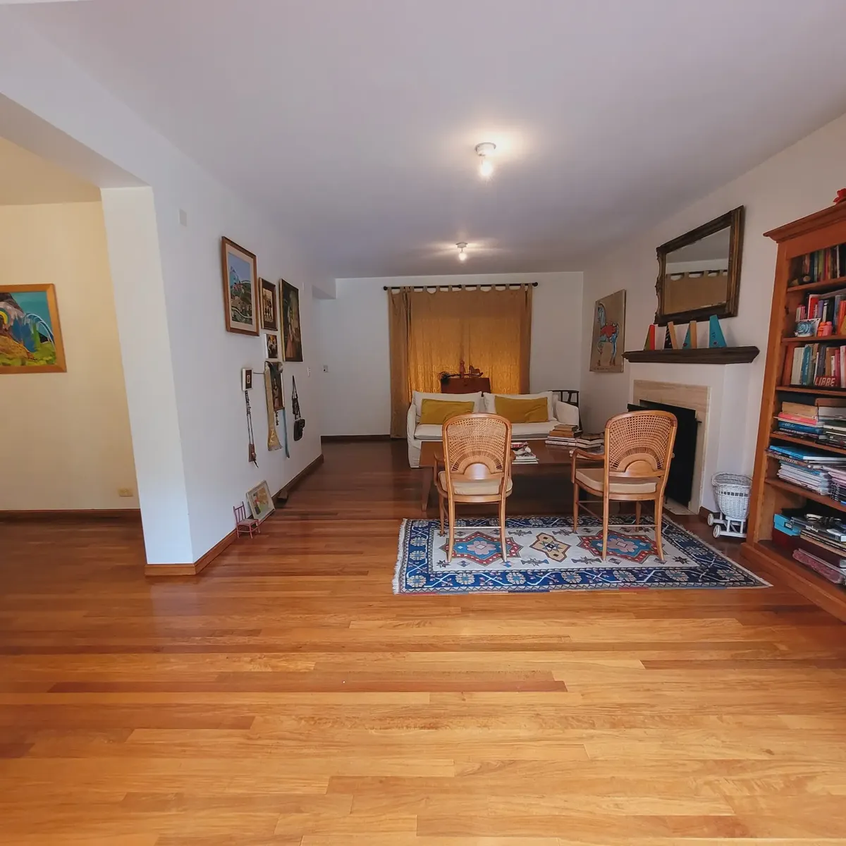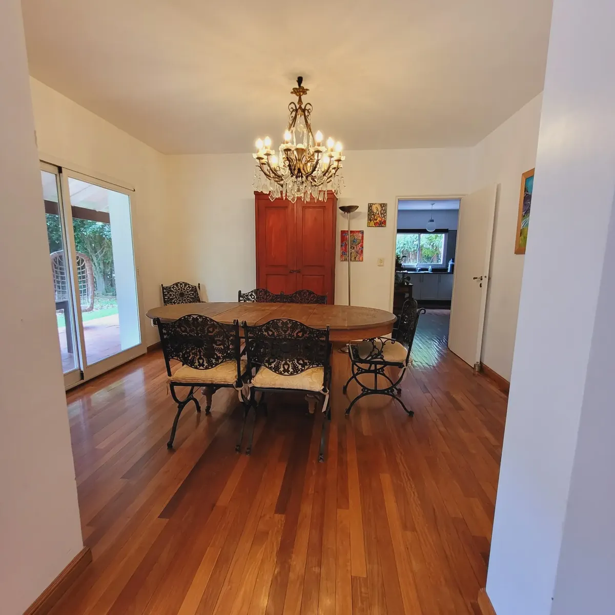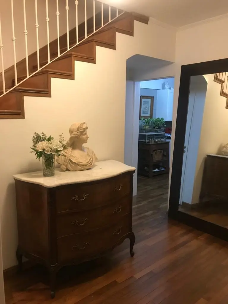 Casa em bairro fechado em San Fernando, mobiliada para estadia temporária, com 4 dormitórios e ambientes distribuídos em dois pavimentos. No térreo há hall de recepção, sala com lareira a lenha e janelas amplas, sala de estar com TV ou escritório, lavabo, cozinha ampla e dependência de serviço com banheiro. No piso superior há 4 dormitórios, sendo o principal em suíte com closet, outro em suíte e 2 dormitórios com banheiros completos, além de mezanino de 50 m² com janelas e acesso por elevador.