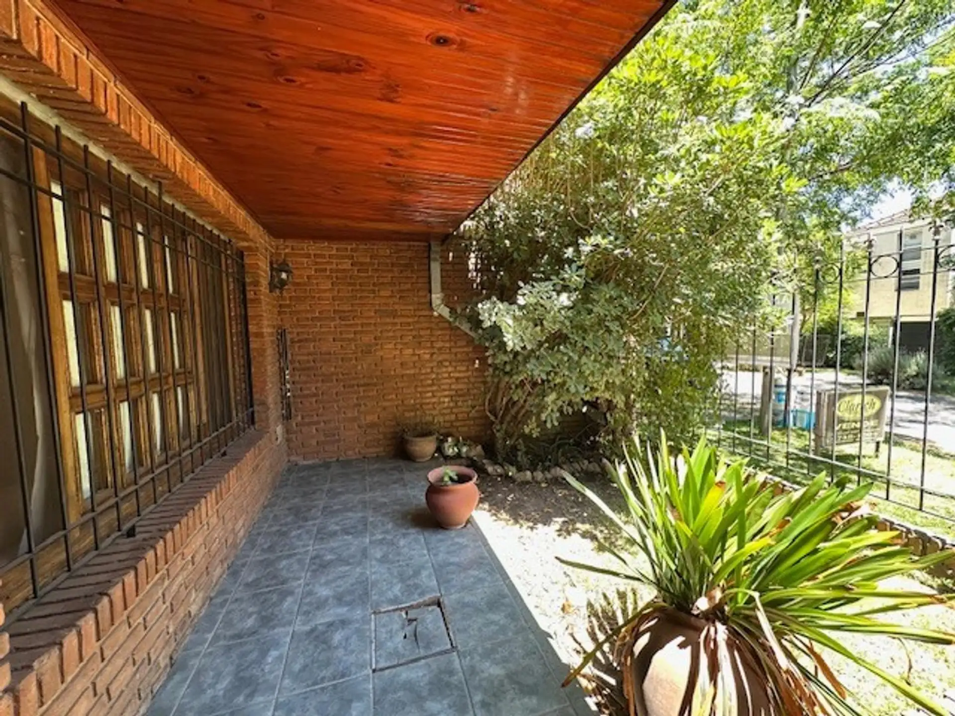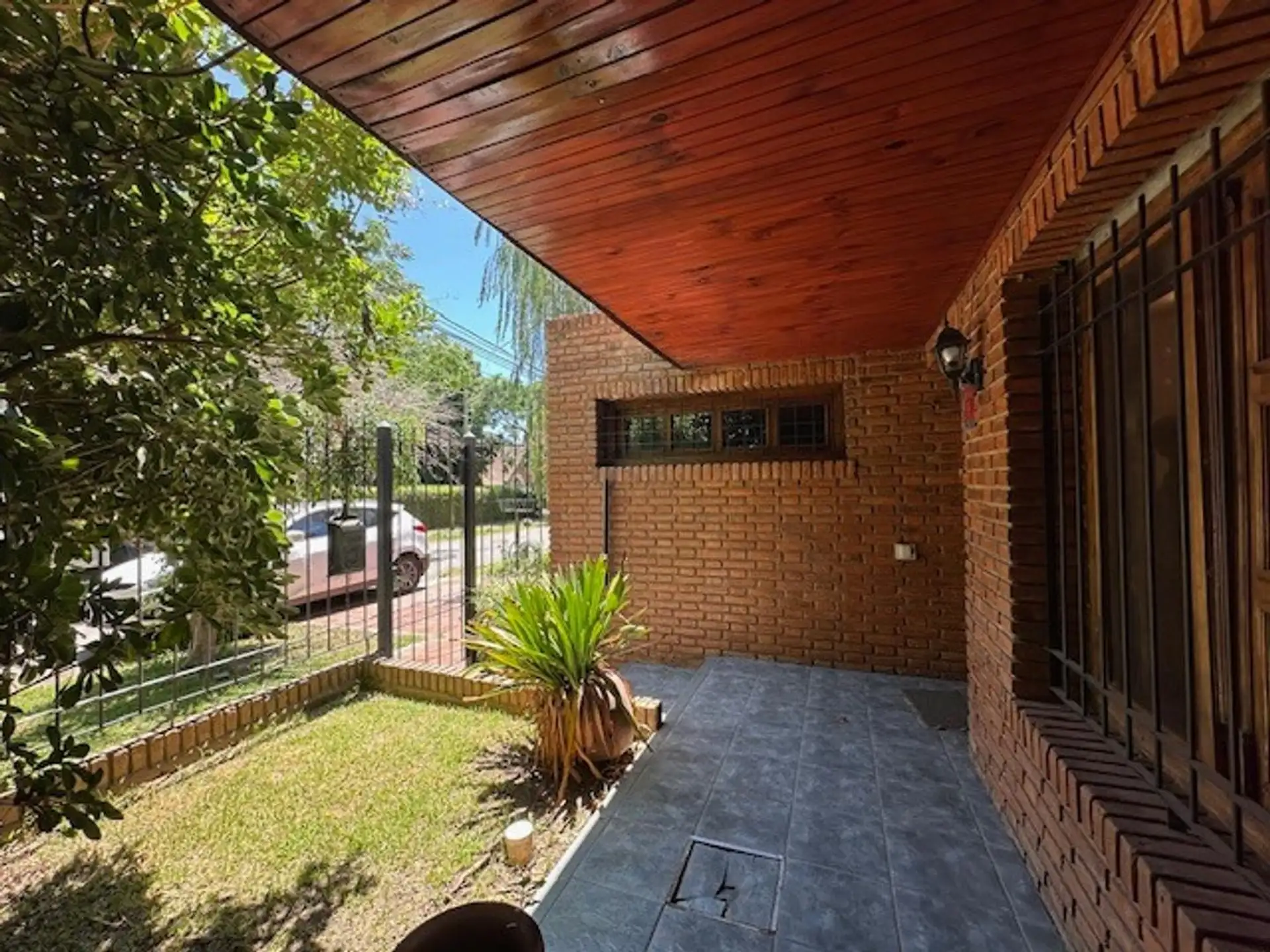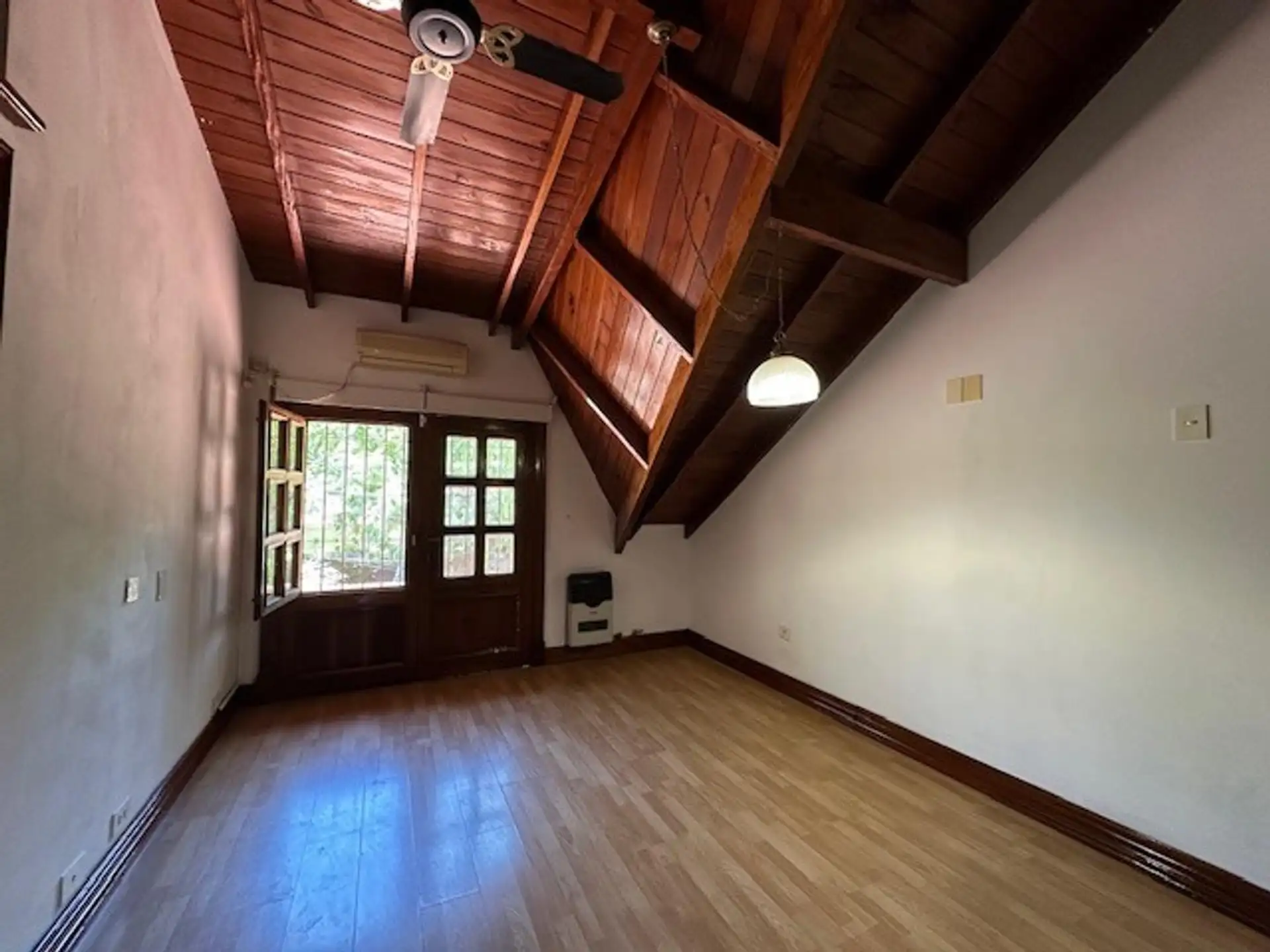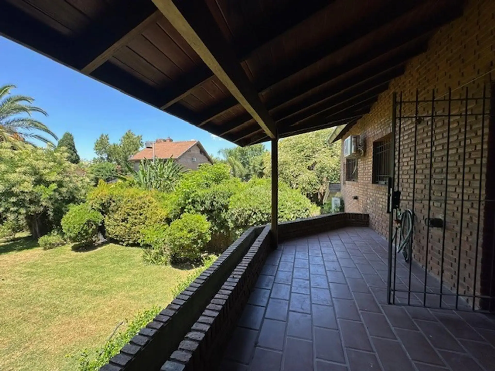 Chalé de 5 ambientes para aluguel em Don Torcuato, com 4 dormitórios (sendo 1 suíte no andar superior) e 271 m² cobertos. Casa com porch de entrada, sala em desnível (com possibilidade de instalação de salamandra), lavabo, sala de jantar, cozinha com comedor diário e área de lavanderia, além de vaga coberta para 2 autos e acesso por escada ao andar superior. Na área externa há galeria com área de churrasco, galpão, parque e sistema de irrigação por aspersão. Construção com cerca de 34 anos; lote