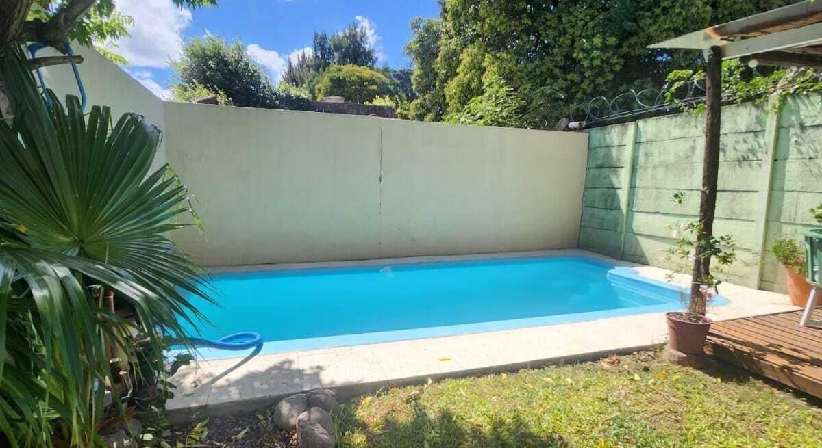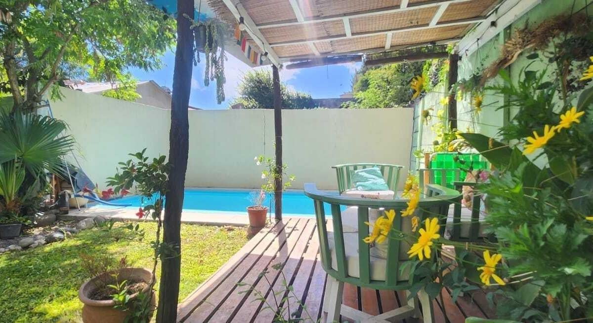 Casa em Benavidez, Tigre, com 4 dormitórios distribuídos em 2 plantas. No térreo há living-comedor, banheiro completo, cozinha independente e área de serviço (lavadero). No piso superior ficam 3 dormitórios, mais 1 quarto com closet, além de mais 1 banheiro completo. Externamente tem portão automático, garagem semicoberta, galeria com área de churrasco (parrilla), jardim com pérgola e piscina.