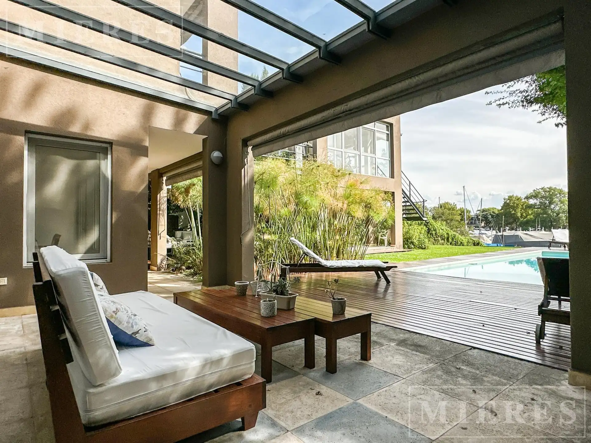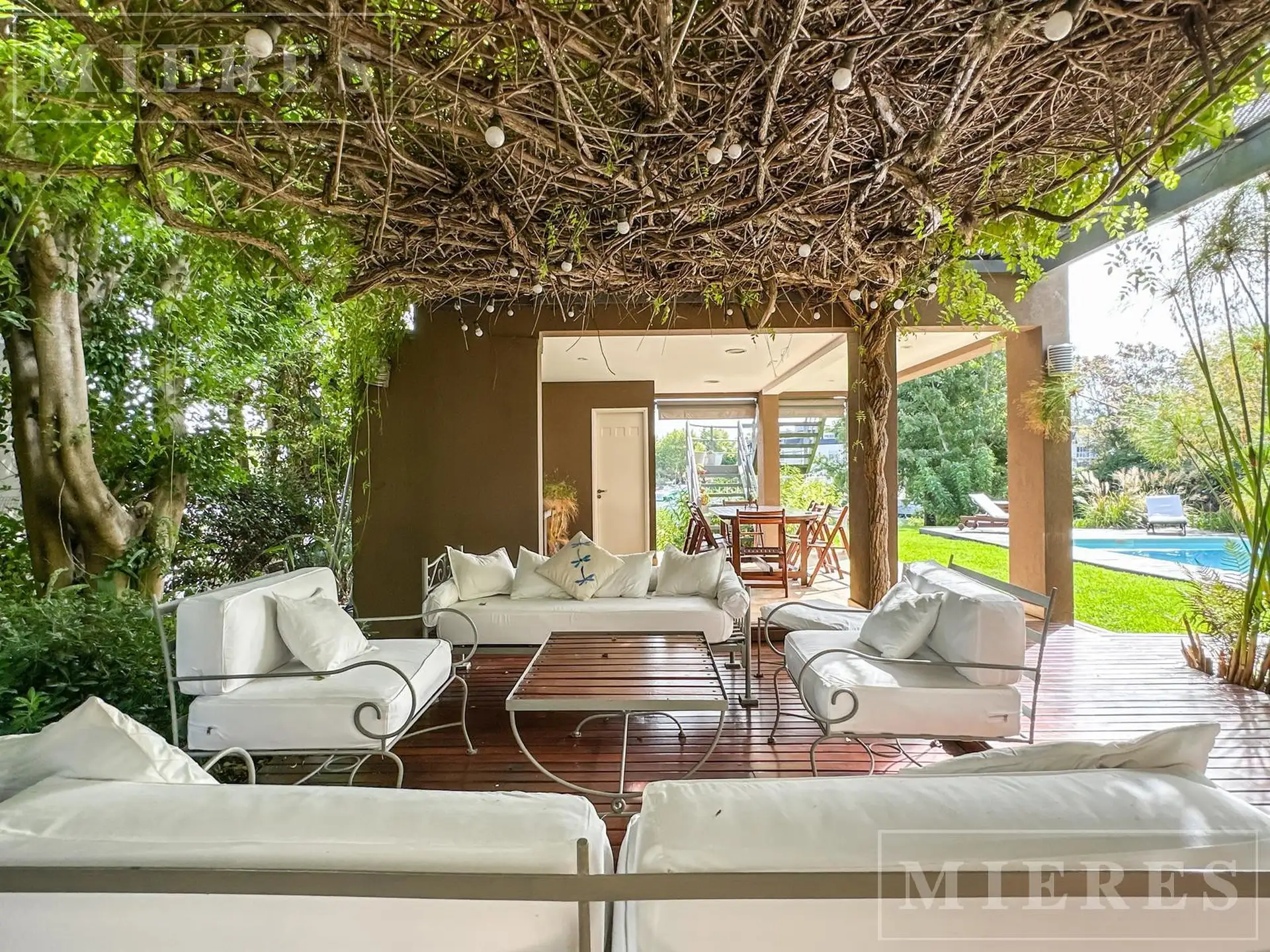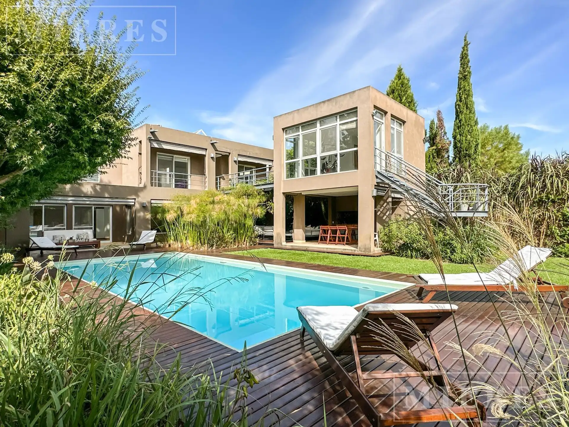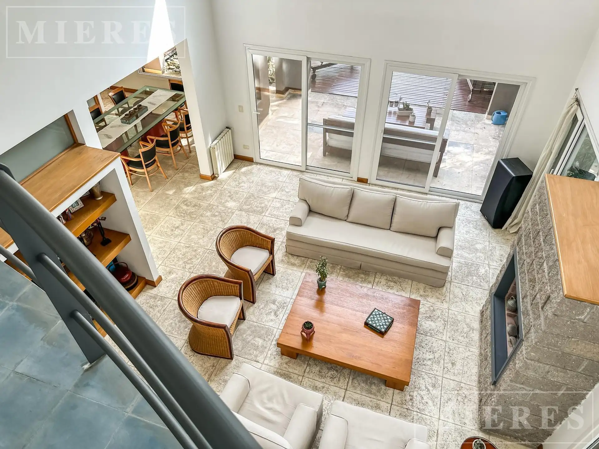 Casa para aluguel anual em Santa María de Tigre, edificada em lote de 1000 m², com 360 m² cobertos e 60 m² semicobertos. No térreo: hall, living em pé-direito duplo com lareira e vista para o rio, lavabo, sala de jantar, cozinha com área de refeições e saída para a galeria, quarto de TV, lavanderia ampla e banheiro de serviço. No andar superior: 1 suíte júnior, 2 dormitórios com 1 banheiro, área de escritório com varanda voltada para o living, suíte principal com closet, banheiro completo, varan