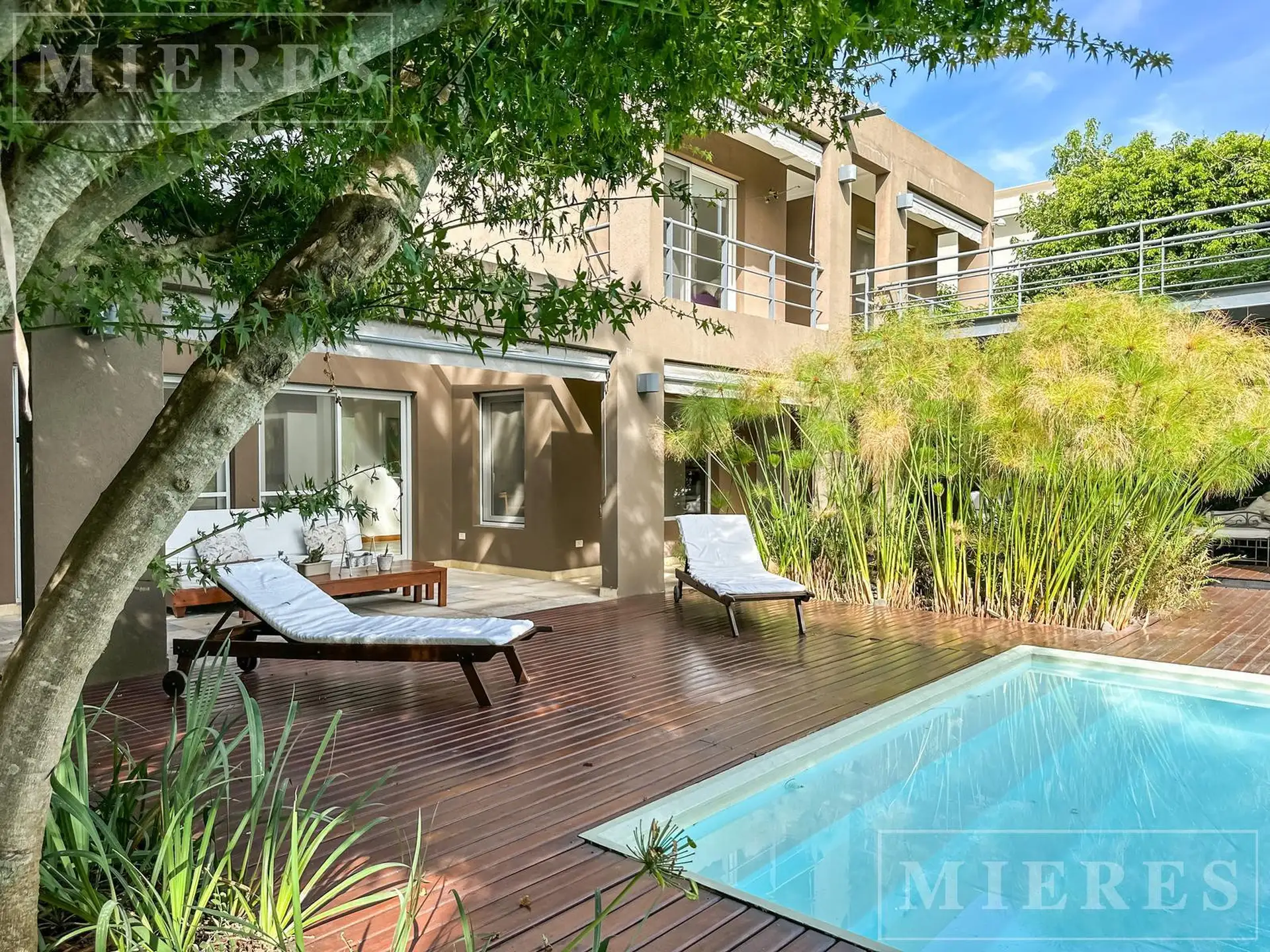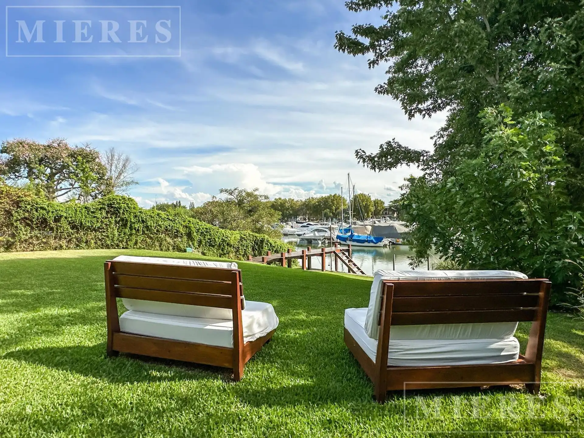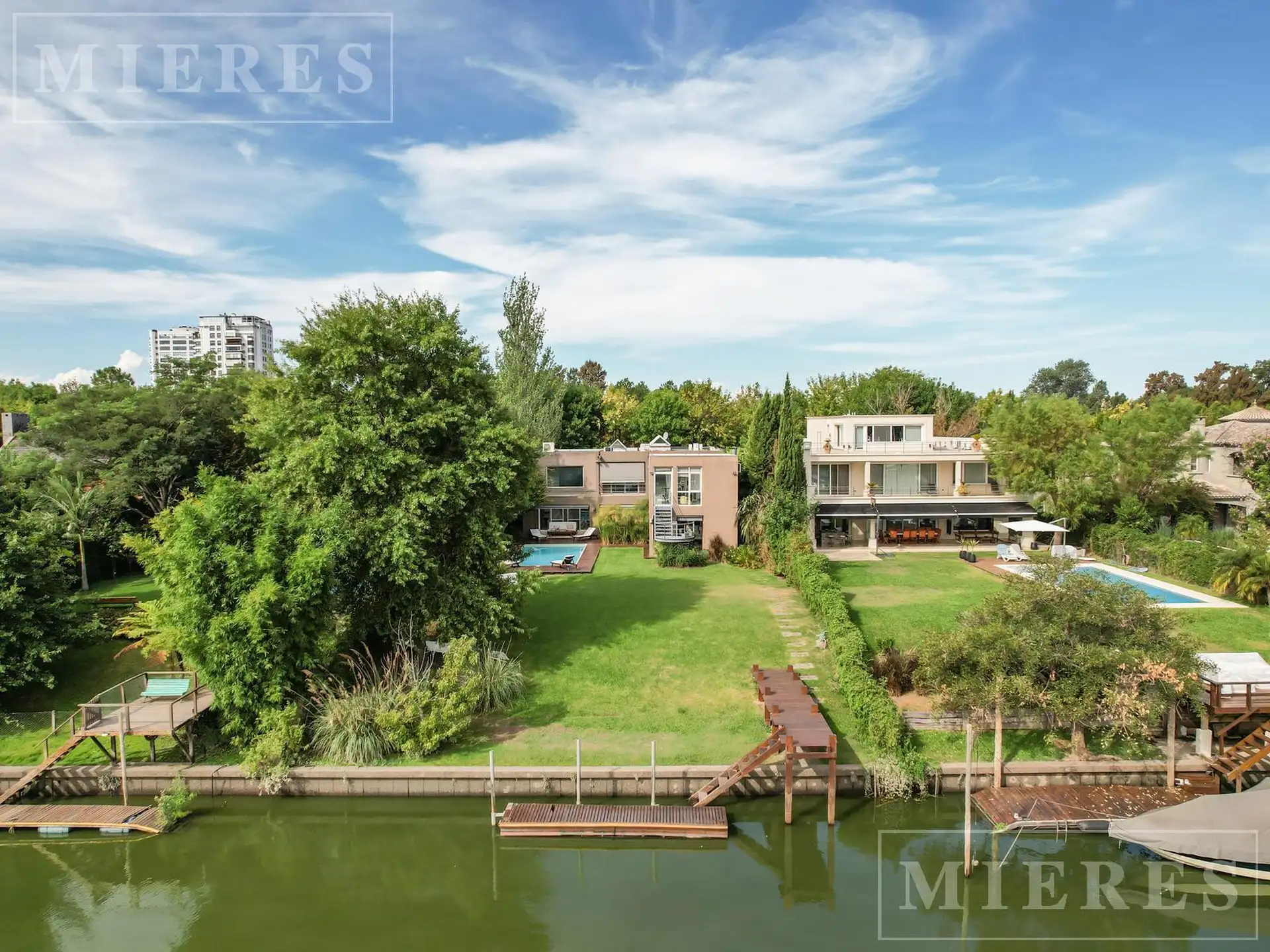Casa para aluguel anual em Santa María de Tigre, edificada em lote de 1000 m², com 360 m² cobertos e 60 m² semicobertos. No térreo: hall, living em pé-direito duplo com lareira e vista para o rio, lavabo, sala de jantar, cozinha com área de refeições e saída para a galeria, quarto de TV, lavanderia ampla e banheiro de serviço. No andar superior: 1 suíte júnior, 2 dormitórios com 1 banheiro, área de escritório com varanda voltada para o living, suíte principal com closet, banheiro completo, varan