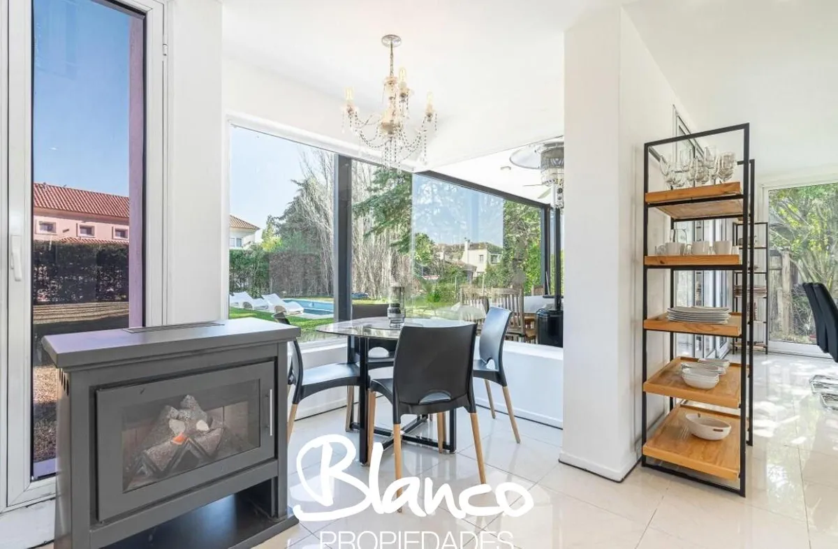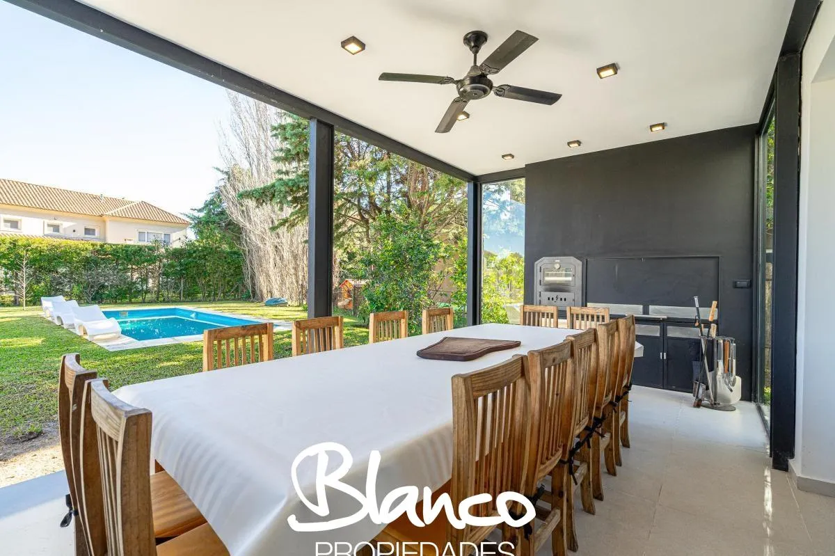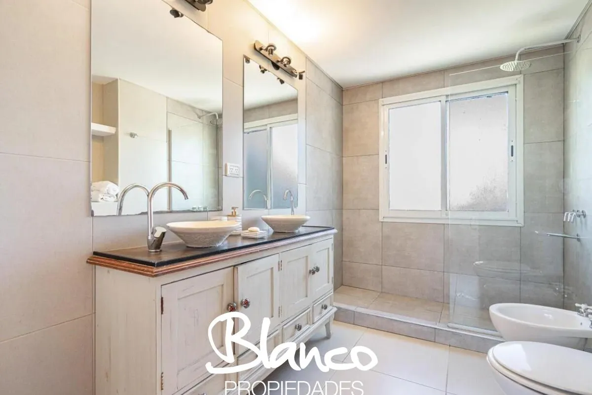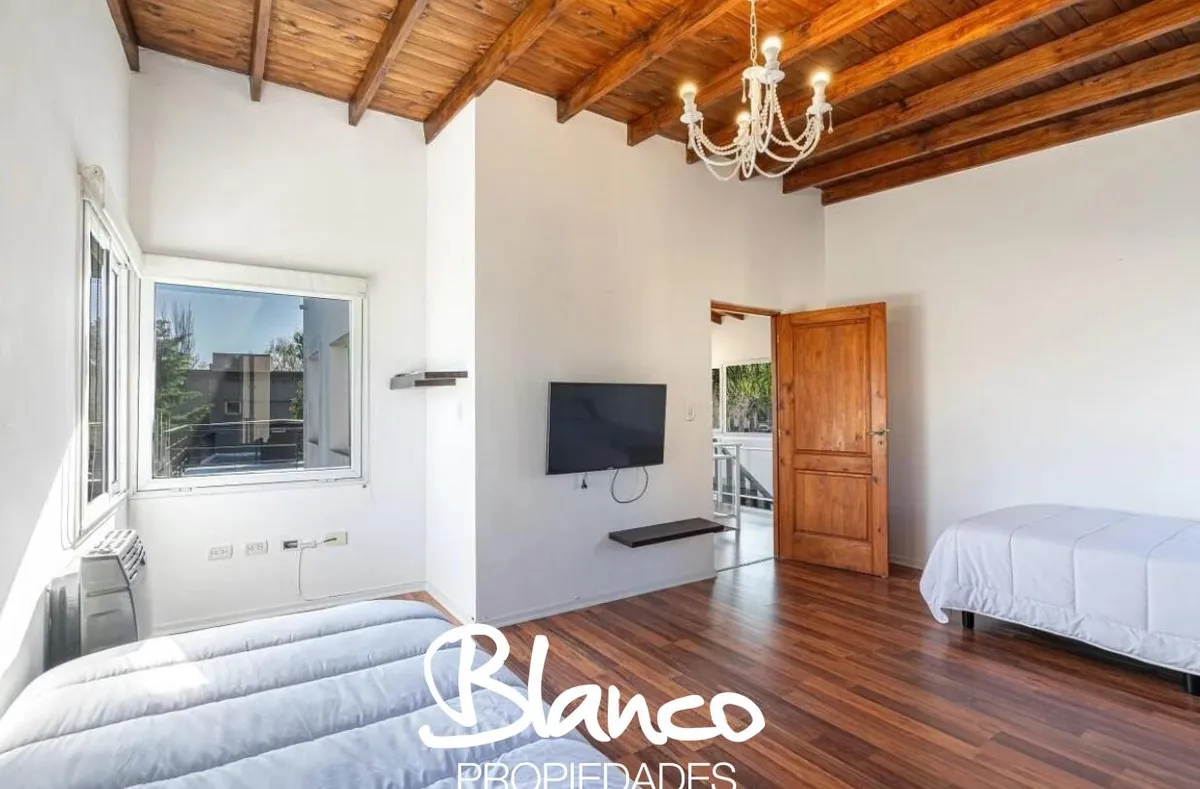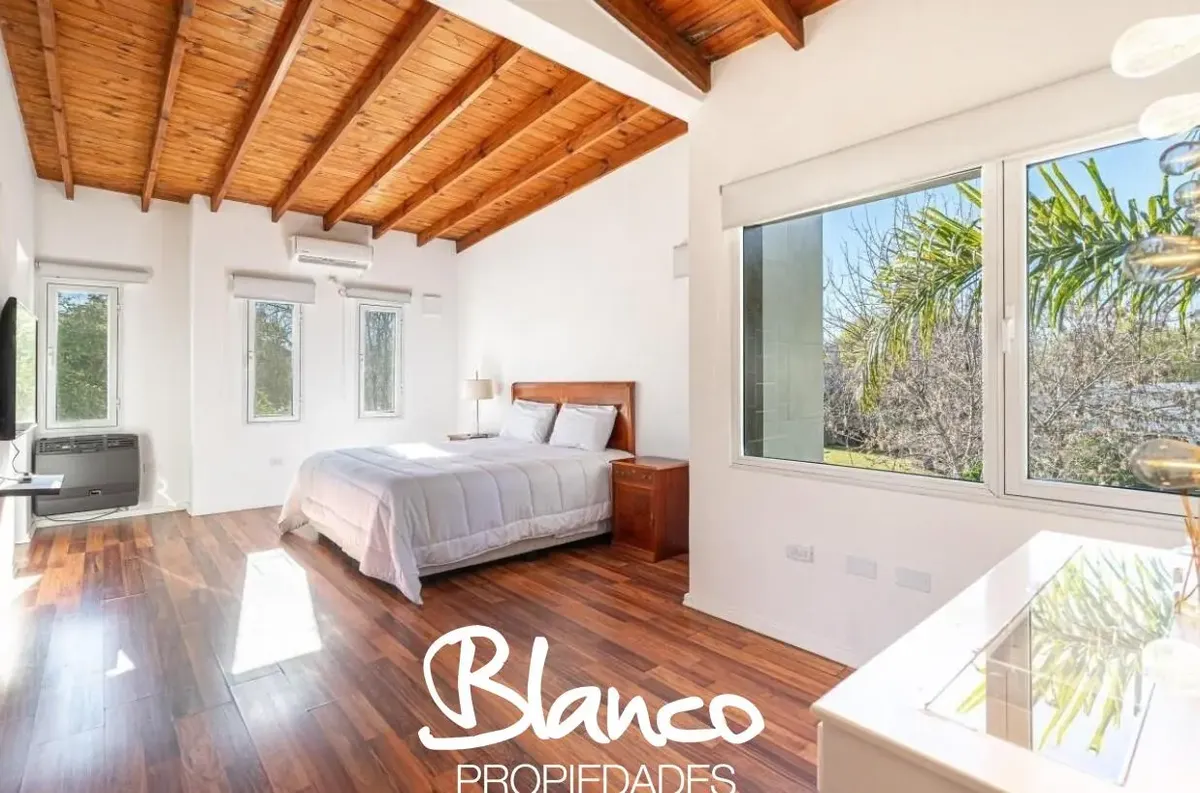 Casa em San Isidro Labrador, Villanueva, Tigre, construída em 2 plantas e totalmente equipada. No 1º andar há amplo living com janelas, cozinha com ilha e lavavajillas, banheiro completo e área de serviço com lavadora e secadora. No 2º andar, suíte principal com dois closets e acesso a terraço; mais 3 dormitórios com 2 banheiros. No exterior há galeria com área de churrasco e forno a lenha, piscina com solarium, jardim arborizado e garagem para 3 autos. Disponibilidade temporária 2025/2026: nove