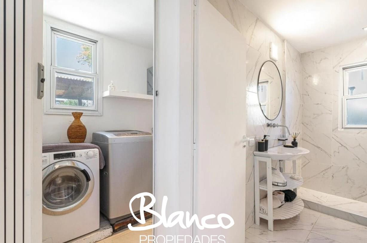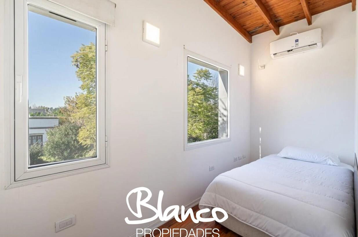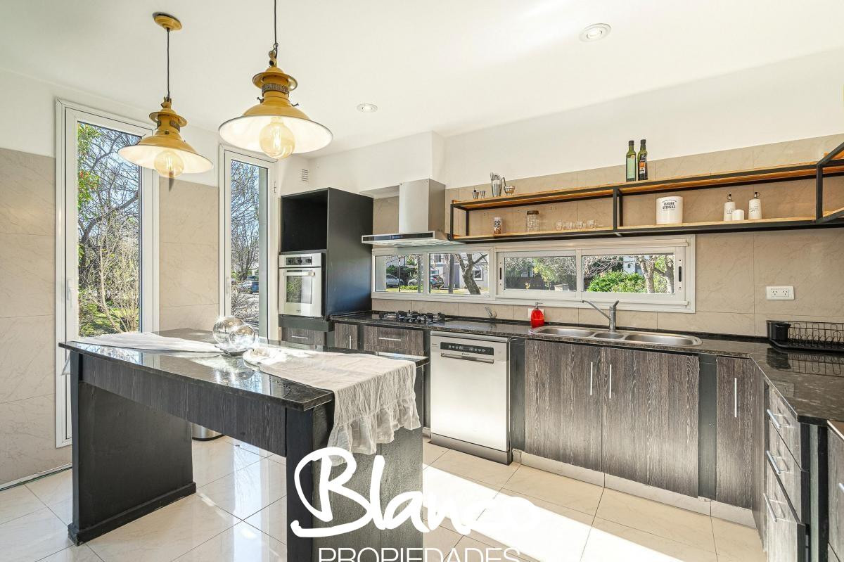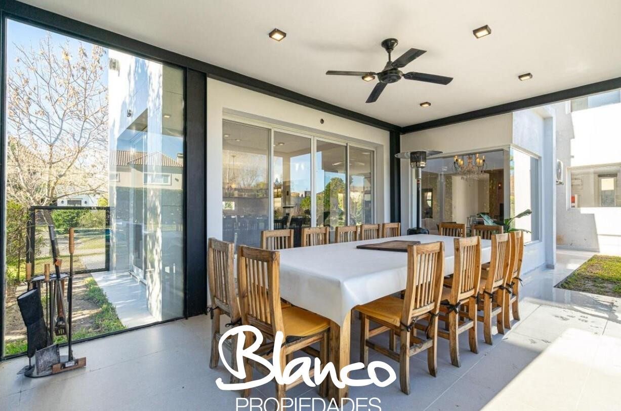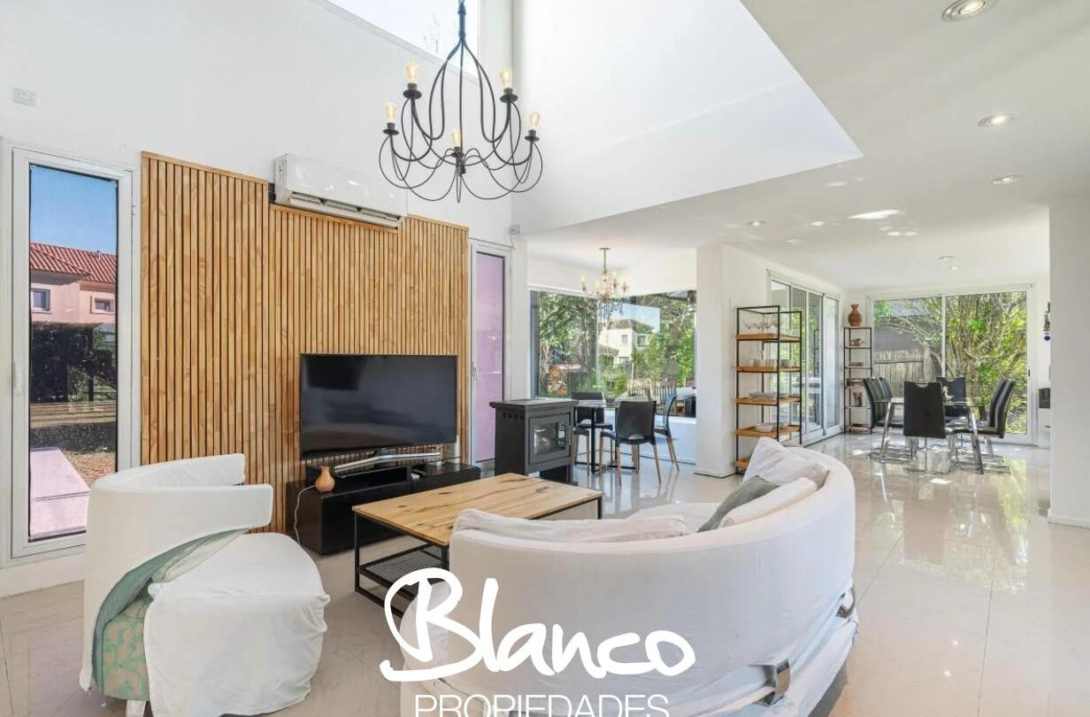 Casa térrea de 2 andares no Barrio Privado San Isidro Labrador, Villanueva, Tigre, totalmente equipada. No andar térreo há amplo living com janelas, cozinha com ilha e lava-louças, banheiro completo e área de lavanderia com lavadora e secadora; no andar superior, suíte com closet duplo e acesso a terraço, além de mais 3 dormitórios e 2 banheiros. Parte externa inclui galeria com área de churrasco e forno a lenha, piscina com solário, jardim arborizado e vaga para 3 carros. A publicação informa q