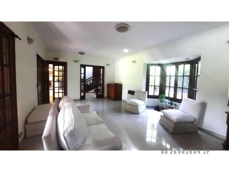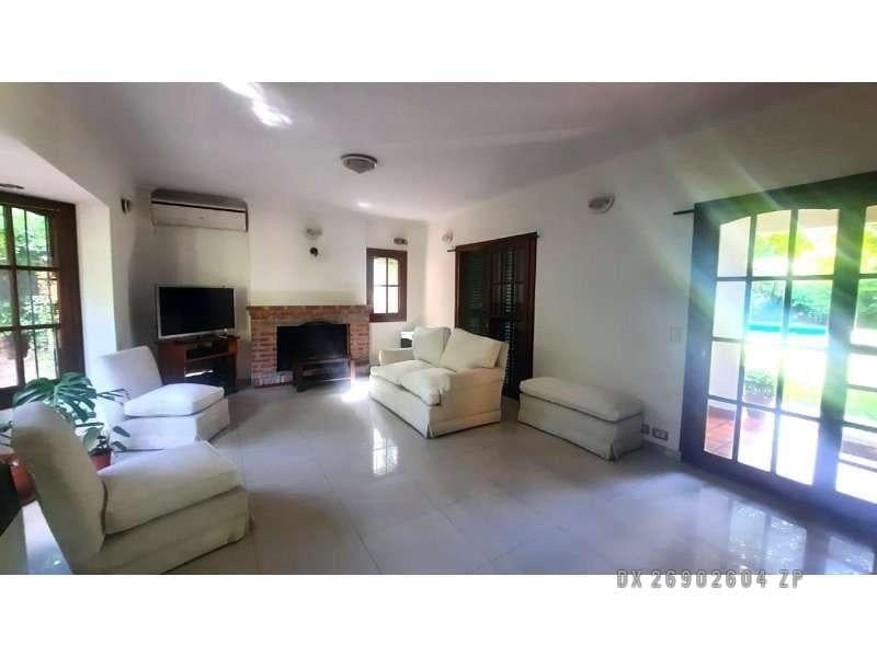 Casa de 2 andares em esquina, com 4 dormitórios, jardins e piscina, em Don Torcuato, Tigre. Aluguel de ARS 2.000.000 por mês, além de serviços e ABL; contrato de 2 anos com reajuste a cada 3 meses conforme IPC, com disponibilidade a partir de maio de 2026. No térreo: entrada principal, hall de recepção, lavabo, living com lareira e janelas com vista para o jardim, sala de jantar integrada, cozinha com área de refeições equipada, área de serviço com acesso pelo garage. No andar superior: hall com