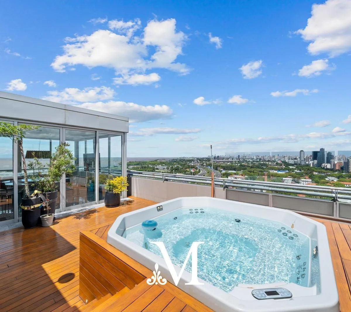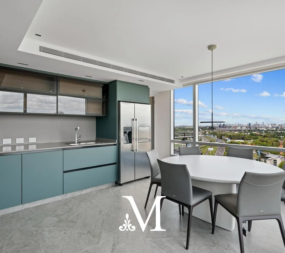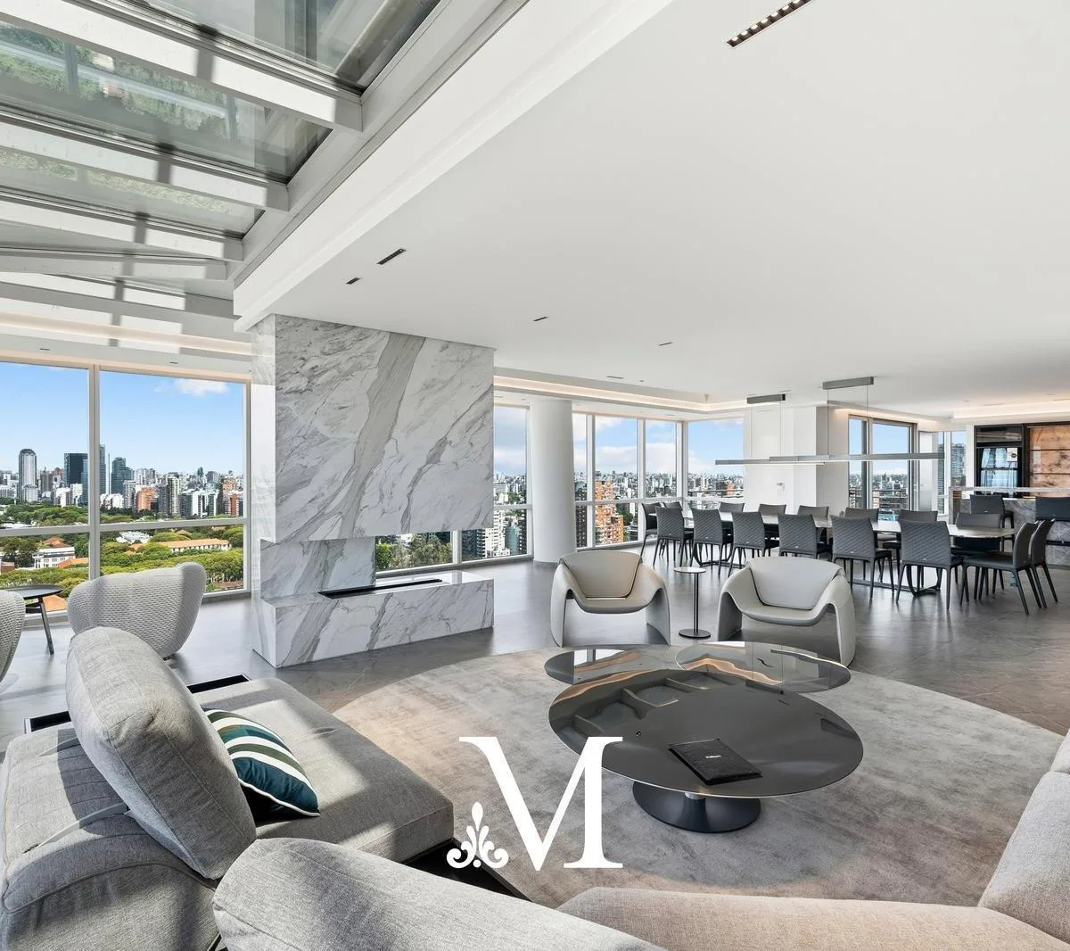 Penthouse triplex em Vicente López, com 568 m² totais, distribuído em três pavimentos conectados por elevador privativo. O nível social (piso térreo) tem sala de estar e jantar com lareira, espaço para até 16 pessoas e cozinha principal com sala de refeições diárias e cozinha de apoio para serviço/eventos, além de varanda, lavabo e dependência com banheiro. No nível íntimo (piso superior), há 4 suítes com vistas abertas, incluindo suíte principal com hidromassagem e dois vãos de vaidade; todas a