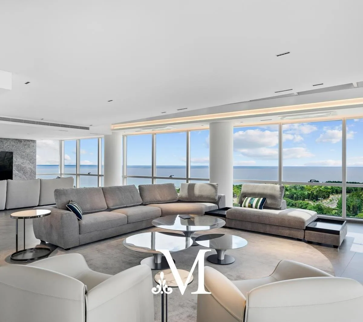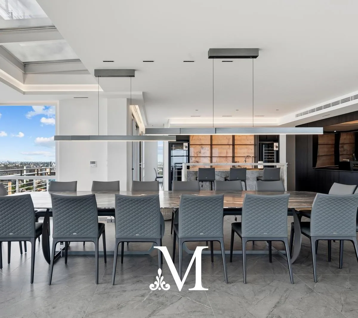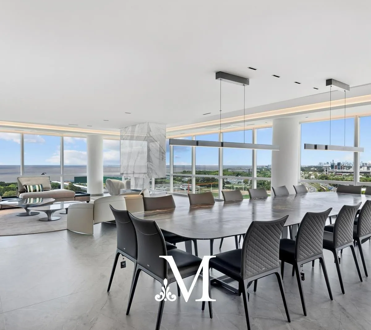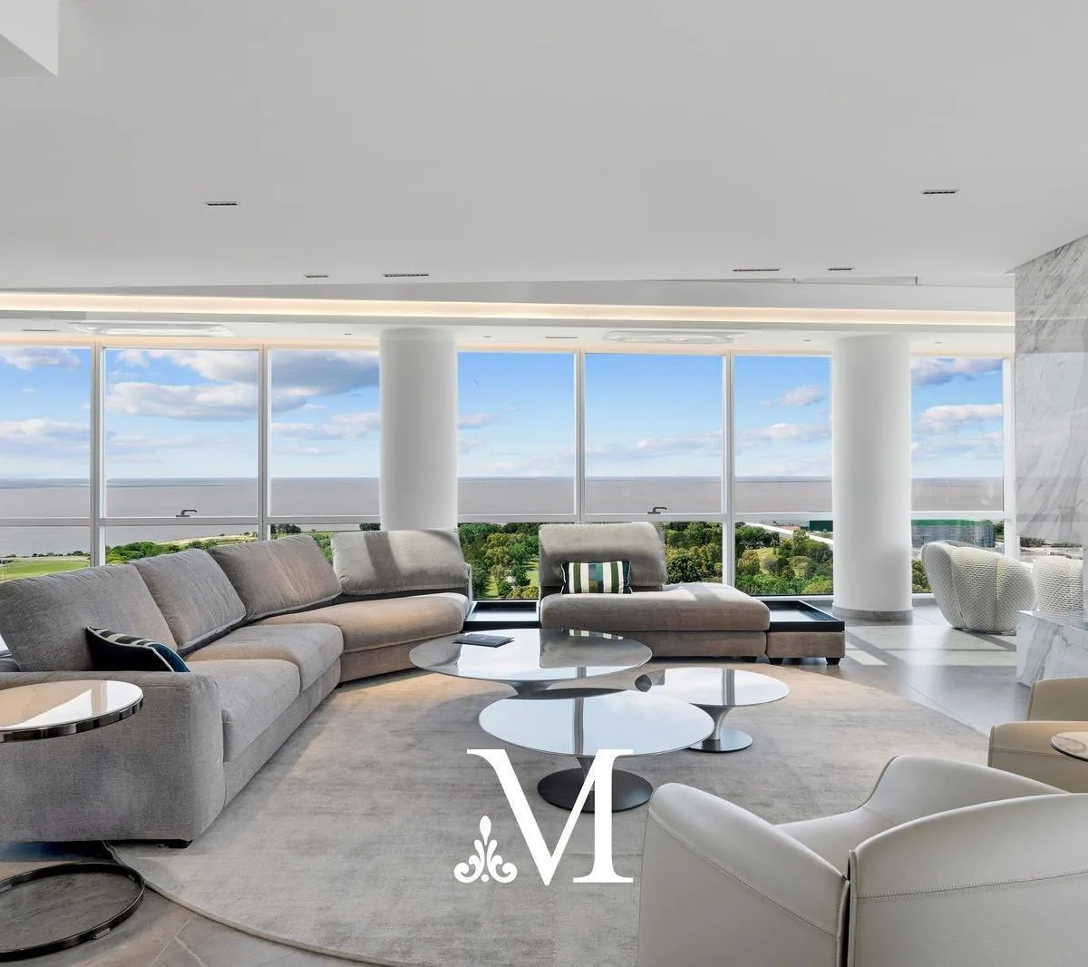 Penthouse triplex em Vicente López, com 568 m² totais, distribuído em três pavimentos conectados por elevador privativo. O nível social (piso térreo) tem sala de estar e jantar com lareira, espaço para até 16 pessoas e cozinha principal com sala de refeições diárias e cozinha de apoio para serviço/eventos, além de varanda, lavabo e dependência com banheiro. No nível íntimo (piso superior), há 4 suítes com vistas abertas, incluindo suíte principal com hidromassagem e dois vãos de vaidade; todas a
