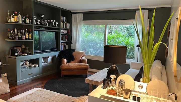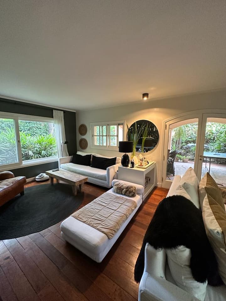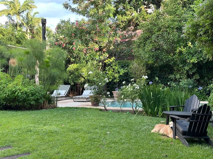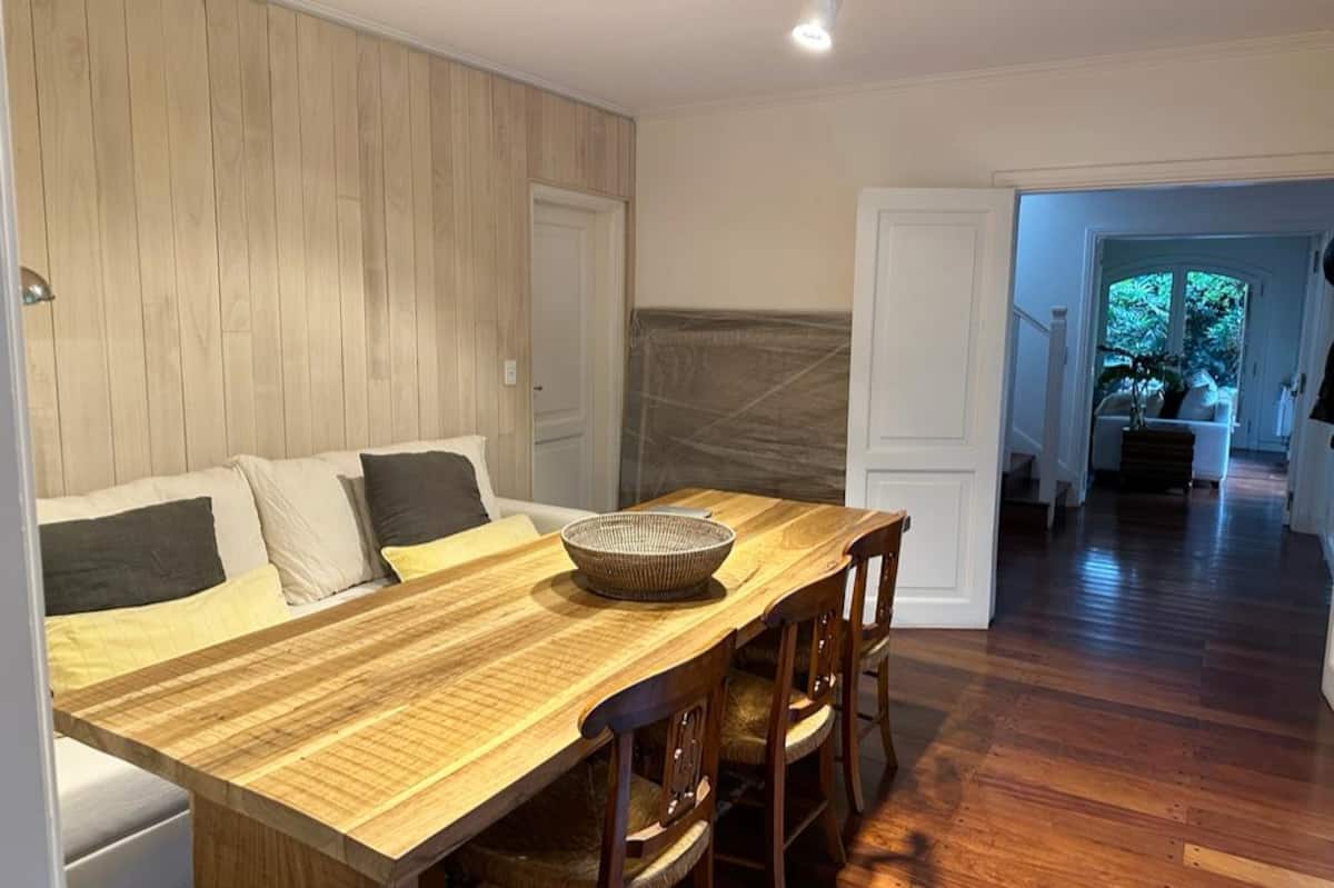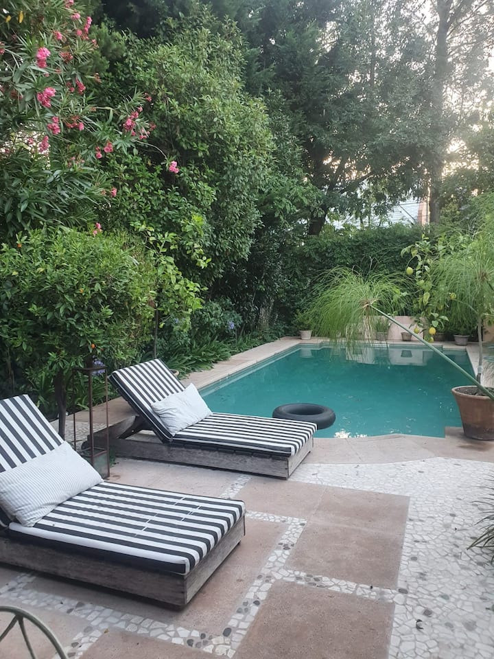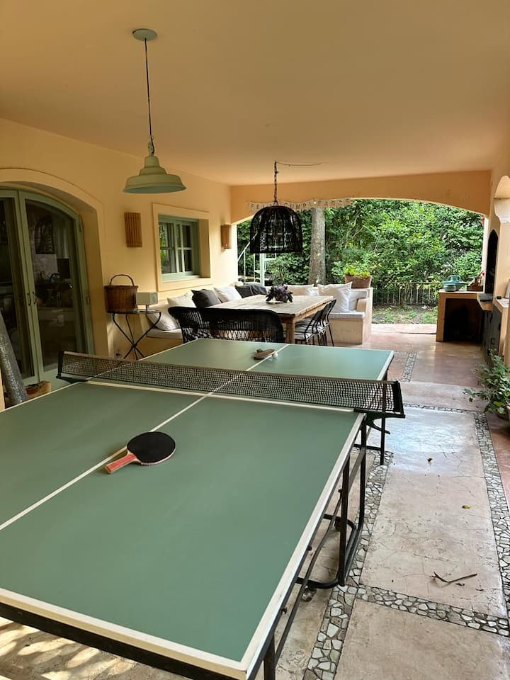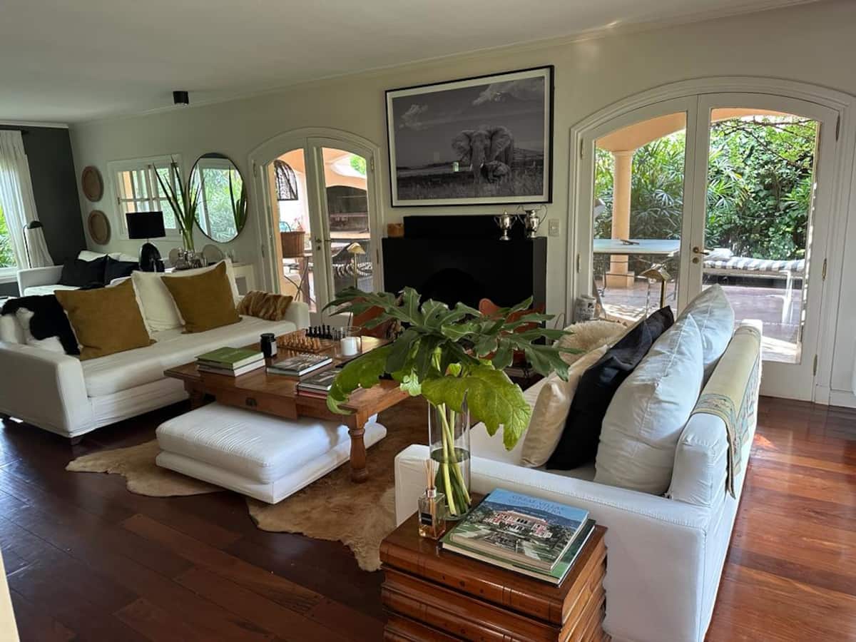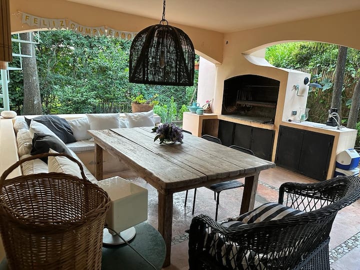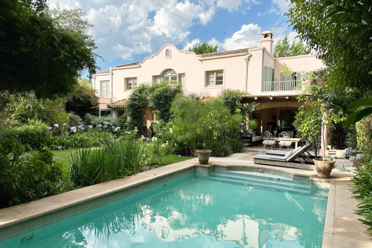 Casa térrea para temporada em Victoria, com jardim, galeria e piscina. Possui 4 quartos em suíte e quarto de dependência em suíte. Inclui cozinha com fogão, churrasqueira, além de mesa de air hockey (ping pong) e metegol. Há acesso ao Panamericana pelo Camino Real, condomínio fechado com segurança privada. A hospedagem é do imóvel inteiro; a locação é mensal. Recomendam-se serviços de limpeza da piscina, jardinagem e limpeza durante a locação.