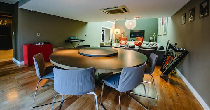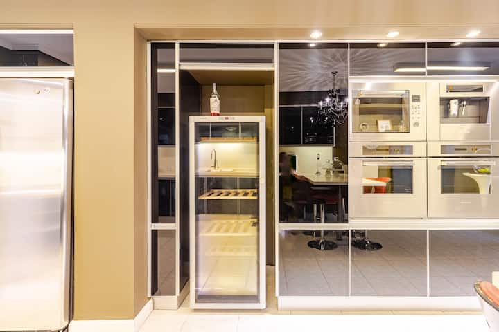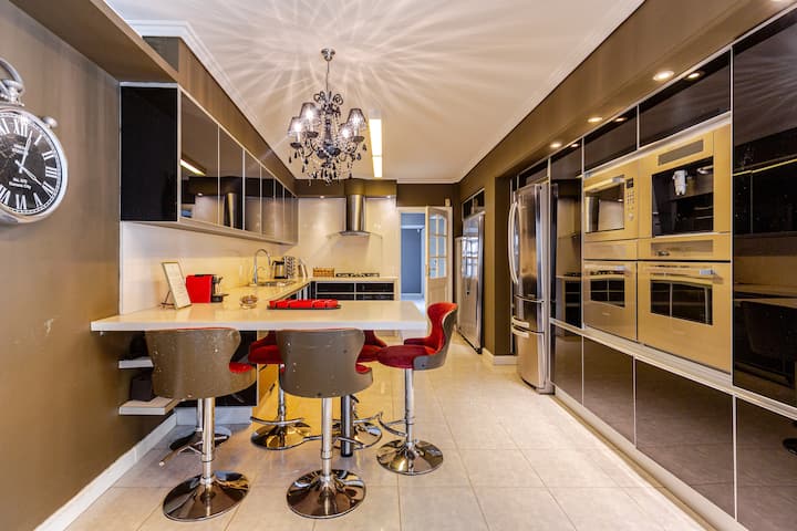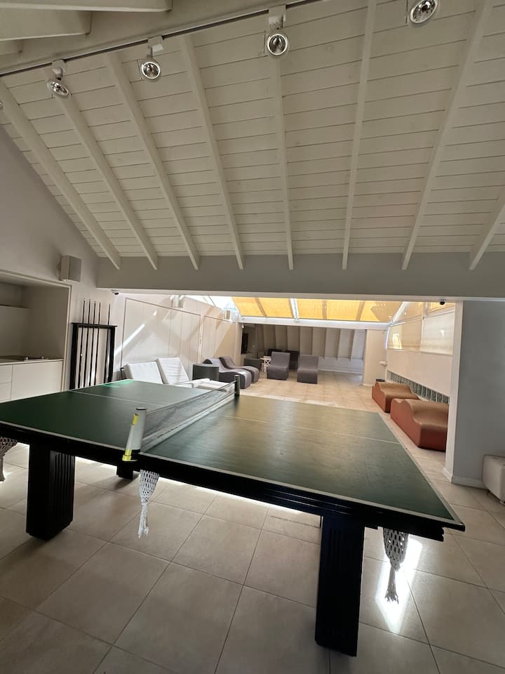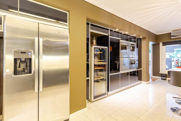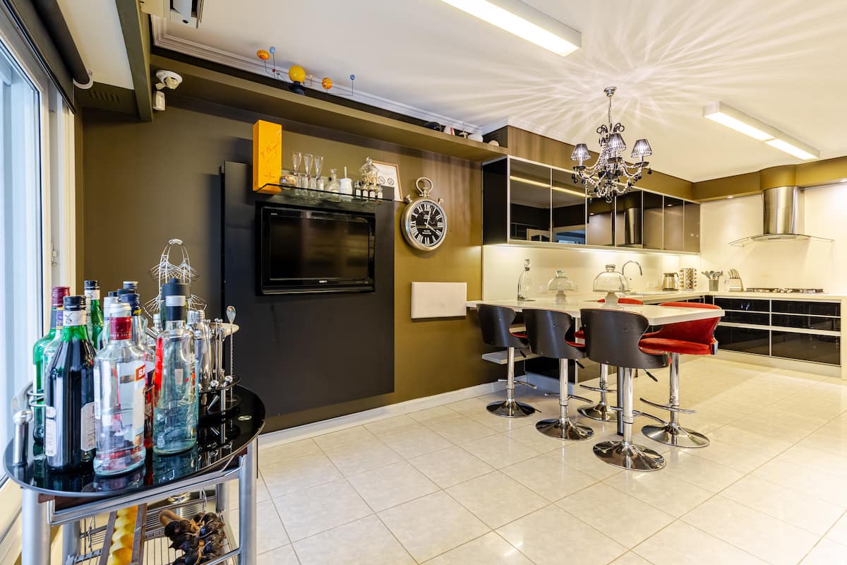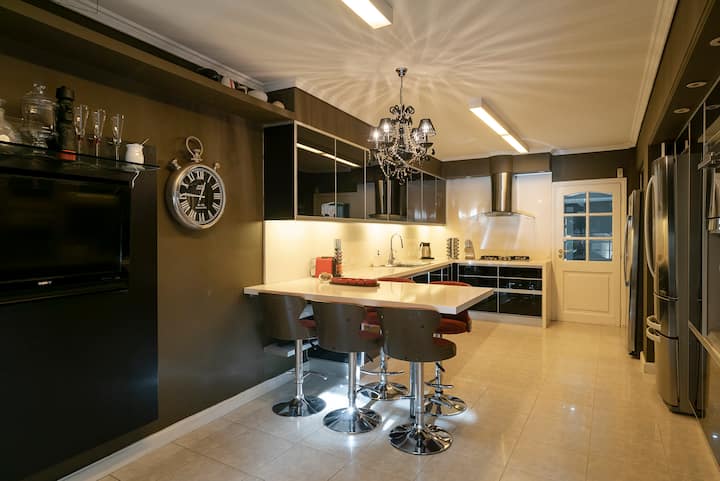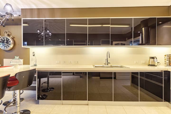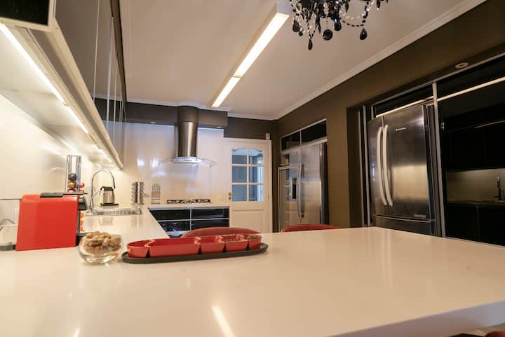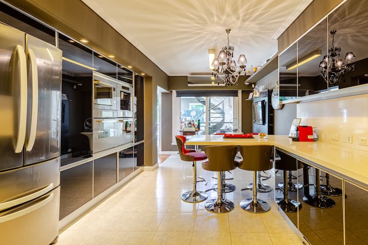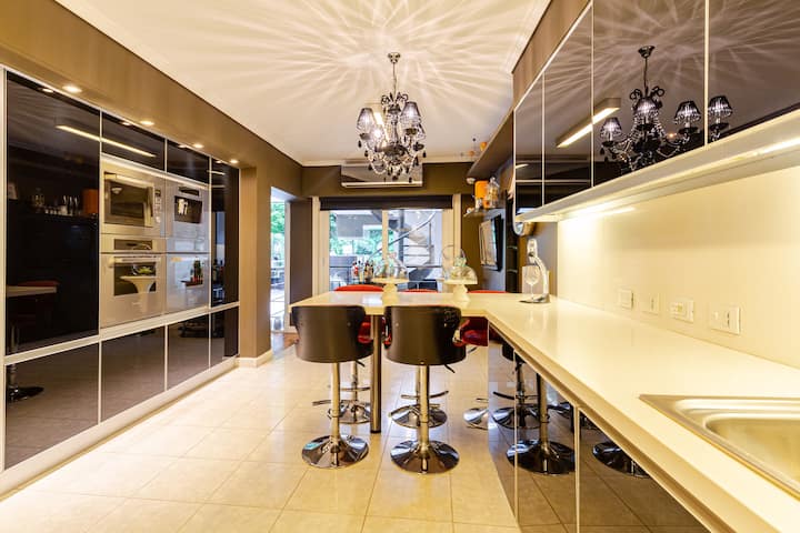 Apartamento em Villa Crespo com 4 quartos, com área superior a 1.000 m². Há piscina semicampista aquecida e solário, além de área externa com churrasqueira e espreguiçadeiras. O imóvel inclui cozinha gourmet com adega, máquina Nespresso, 2 fornos Ariston e micro-ondas, geladeira Ariston no frost, além de spa e área com sistema de som. A descrição menciona também área de lazer (playroom/attic) e quartos com camas king, sendo duas suítes com banheiro privativo e closets.