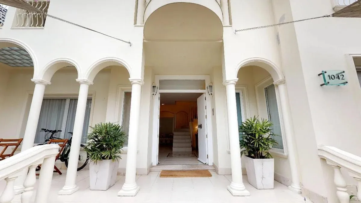 Casa de estilo com 5 dormitórios em vários níveis, com 590 m² de área total (560 m² cobertos e 30 m² semicobertos) e lote de 51 x 15. No andar térreo há hall de recepção, lavabo, living e jantar com vista para o jardim, escritório, cozinha ampla com copa e ilha central, family com acesso pela cozinha e pela sala, e saída para galeria com área externa para refeições. O jardim tem quincho semicoberto e piscina climatizada com fonte, além de área de lavanderia independente. No 2º piso há hall com a