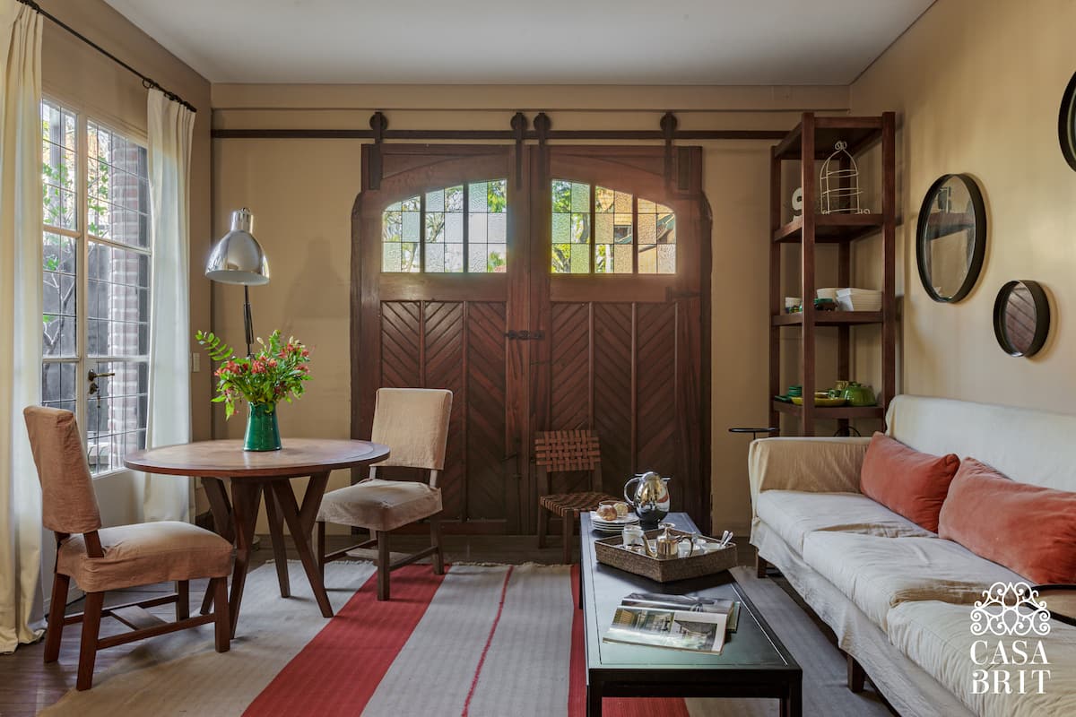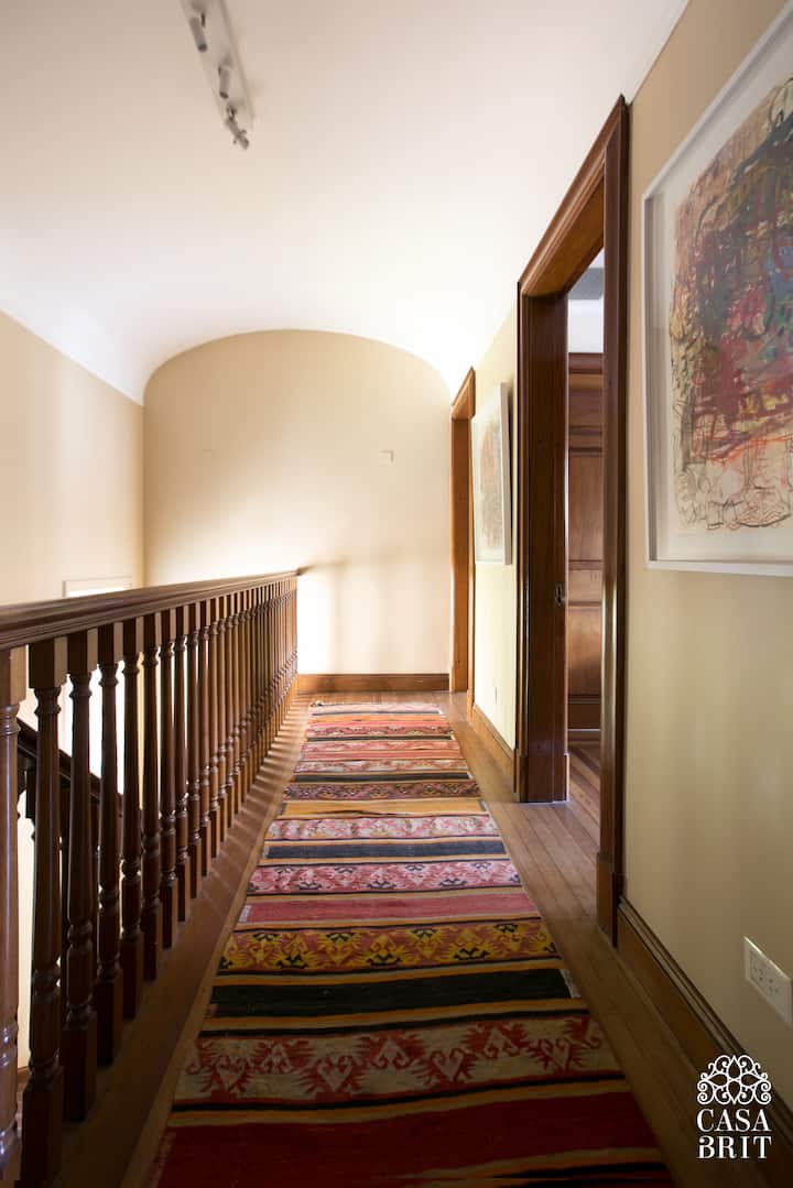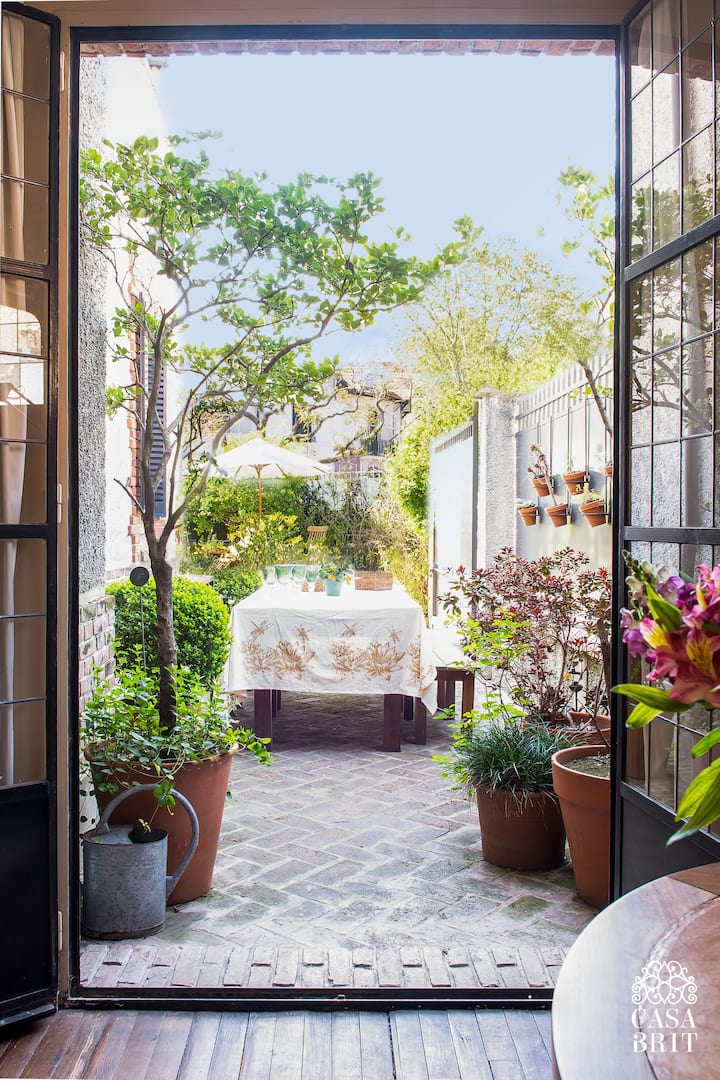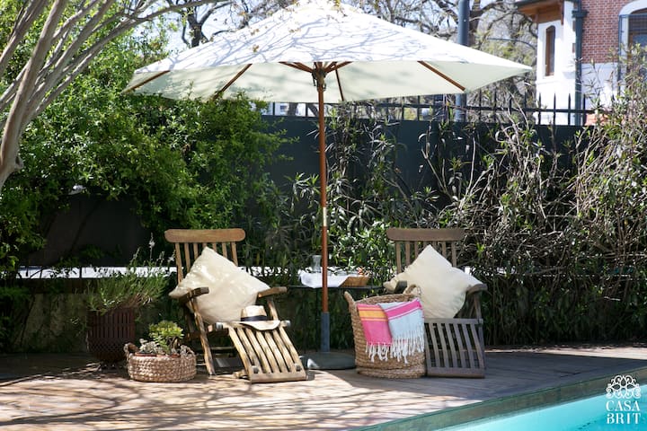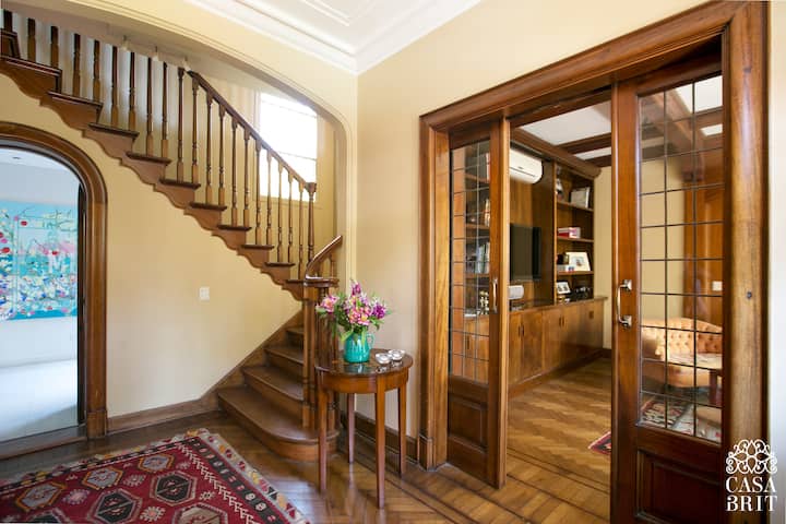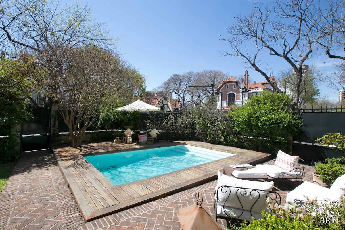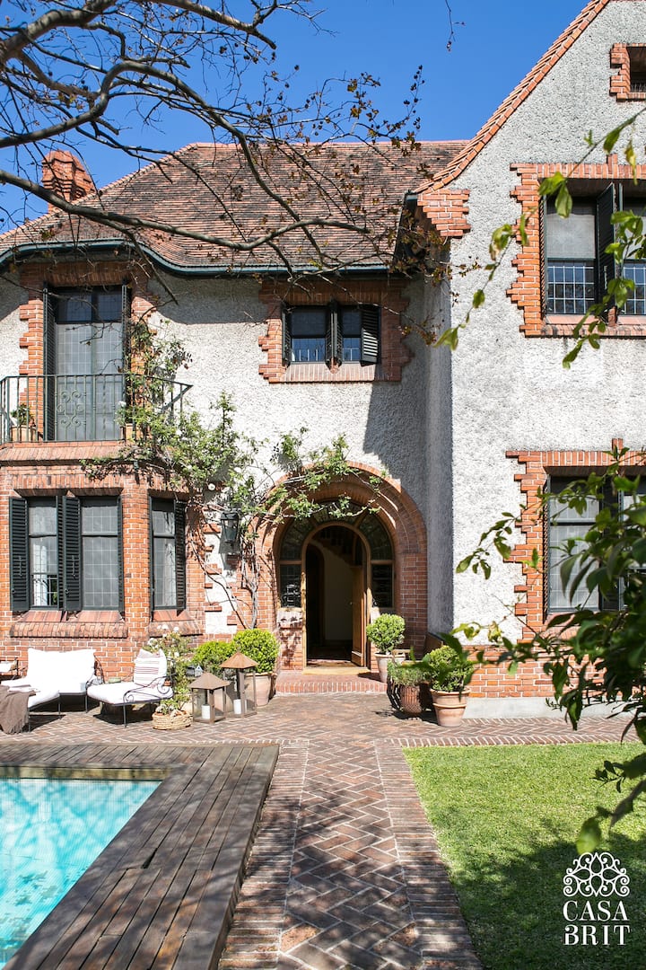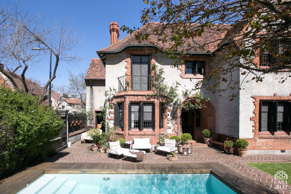 Casa “Casa Brit” em Belgrano R, construída em 1928 e totalmente reformada. São 5 dormitórios, 4 deles com banheiros privativos completos. A casa tem cozinha ampla, sala de jantar para 12 a 14 pessoas, sala de TV e de projeção, além de pátio e jardim com área de piscina.