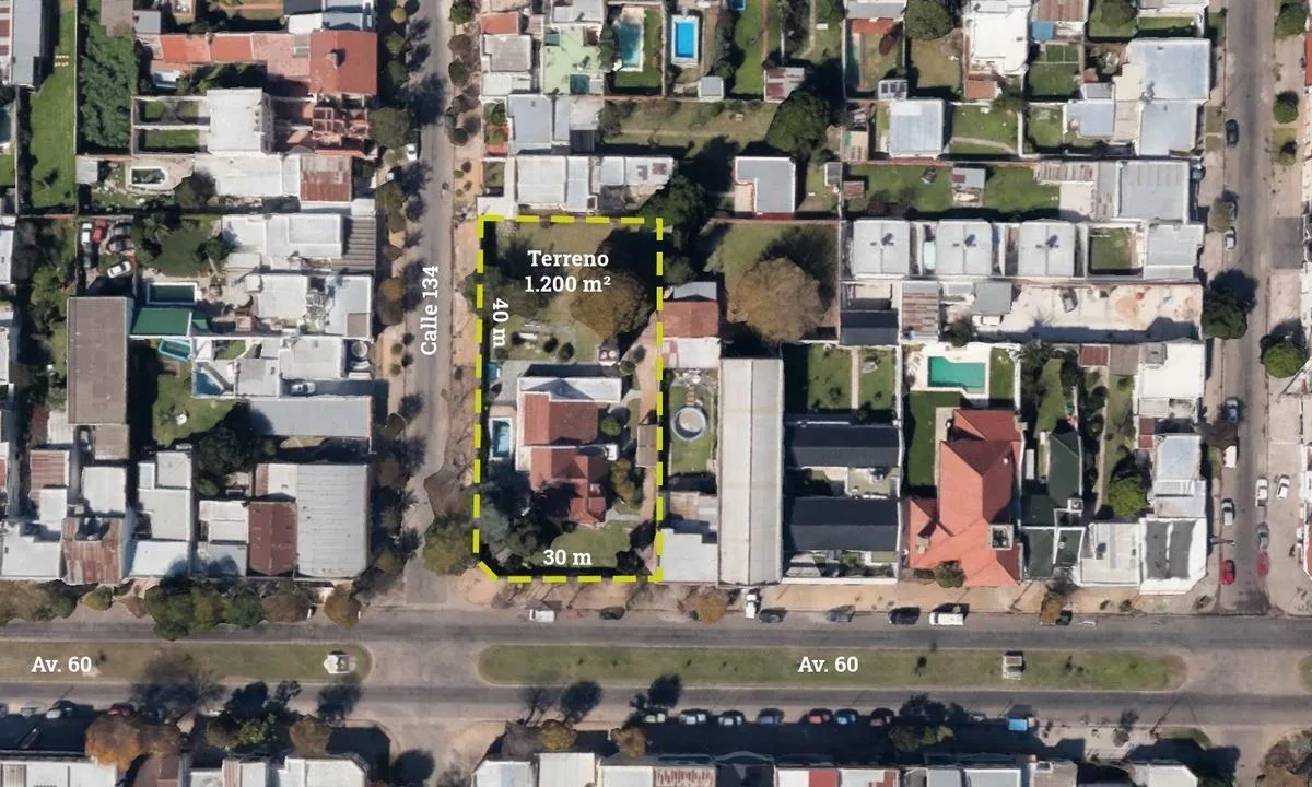 Casa em La Plata em terreno de 1200 m² (30 x 40), na esquina da Av 60 com Av 134, com frente para avenida. Distribuída em 2 níveis, com 5 dormitórios, sendo 2 suítes, cozinha separada, living-comedor, escritório e comedor diário. Possui 3 banheiros, área de lavanderia, dependências de serviço e garagem a céu aberto para vários carros. Há jardim, pátio e piscina.