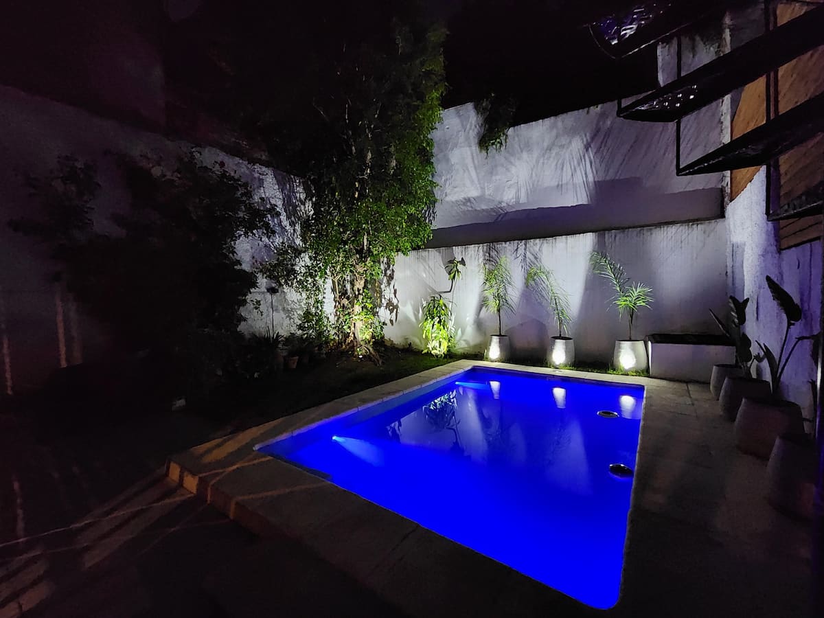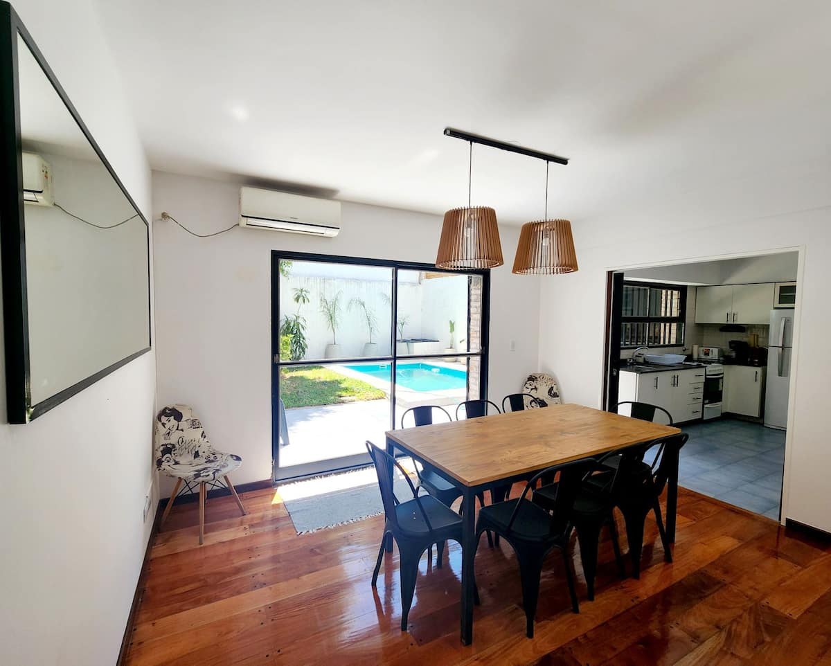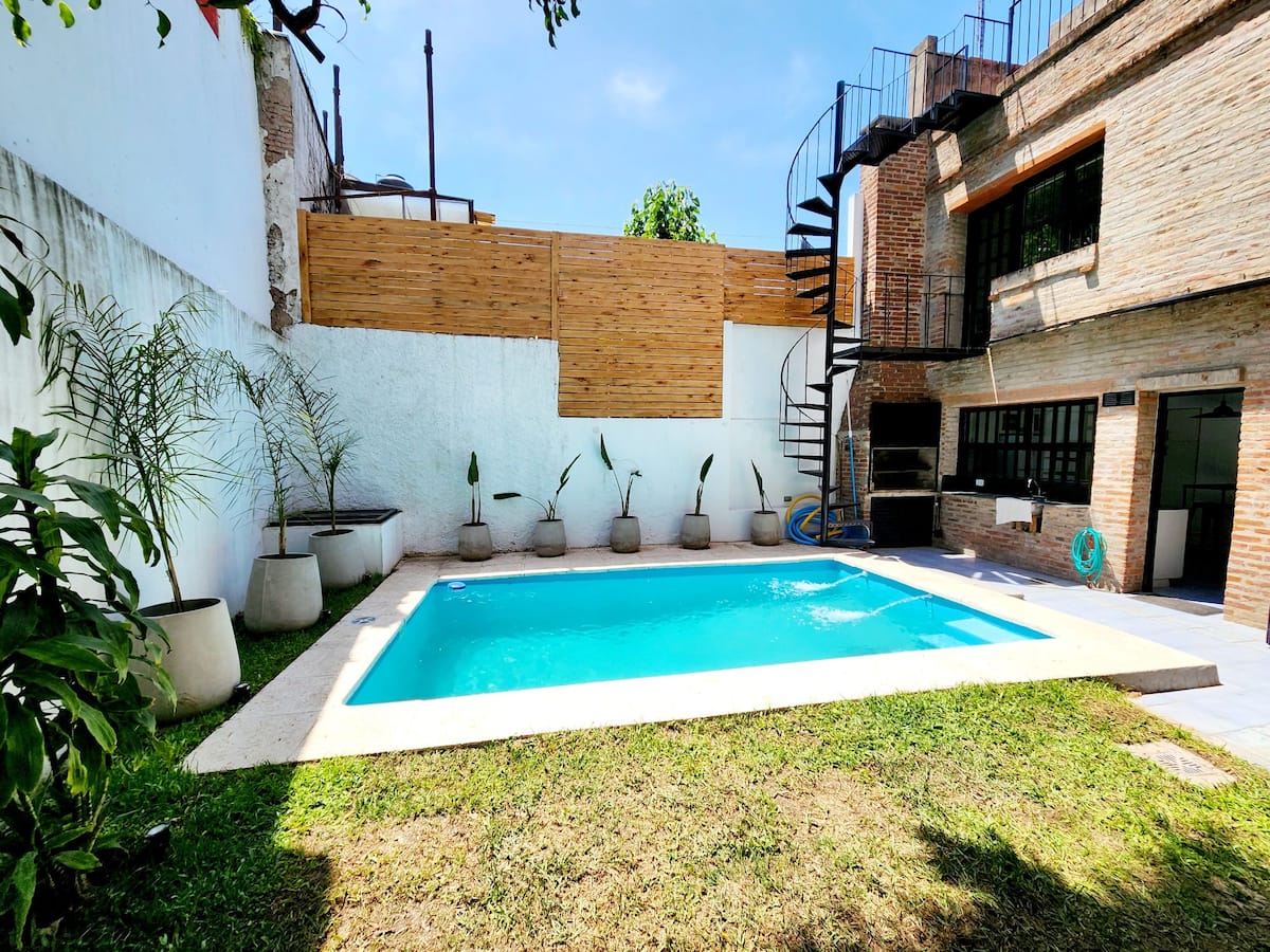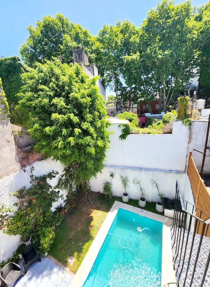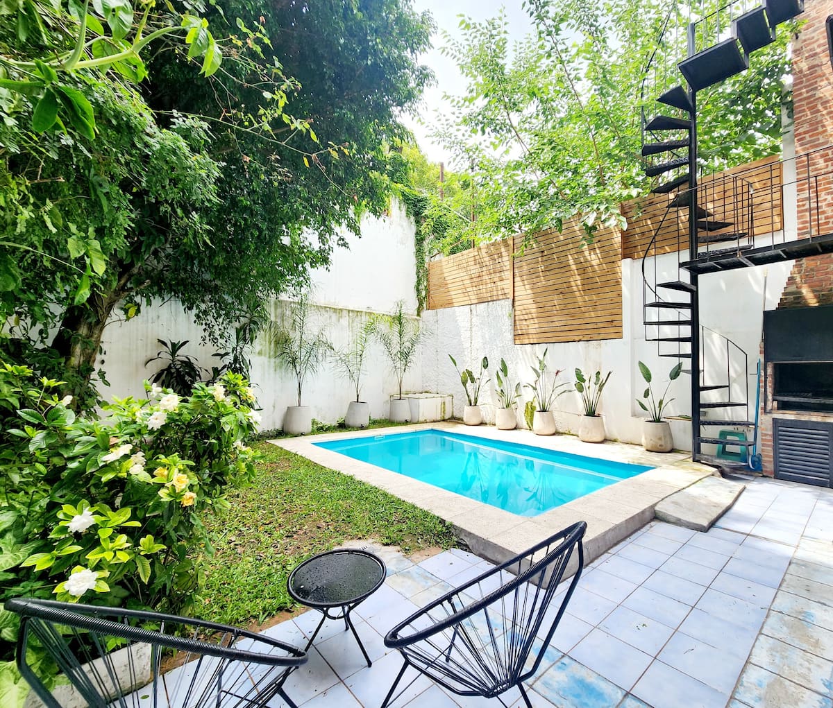 Casa tipo sobrado em Palermo Soho, com piscina, jardim e pátio. Tem 5 dormitórios, 4 banheiros e capacidade para 10 pessoas. Inclui sala com TV a cabo, área de jantar com mesa grande, cozinha e um dormitório no térreo com sala de jogos. O imóvel tem terraço e área de churrasco (BBQ); a piscina tem bomba automática. Não é adequada para festas ou eventos, nem para música alta. Devem ser respeitados horários de silêncio em dias de semana das 23:00 às 8:00 e em fins de semana ou feriados, sem ultrap