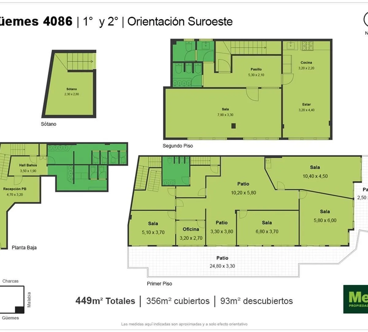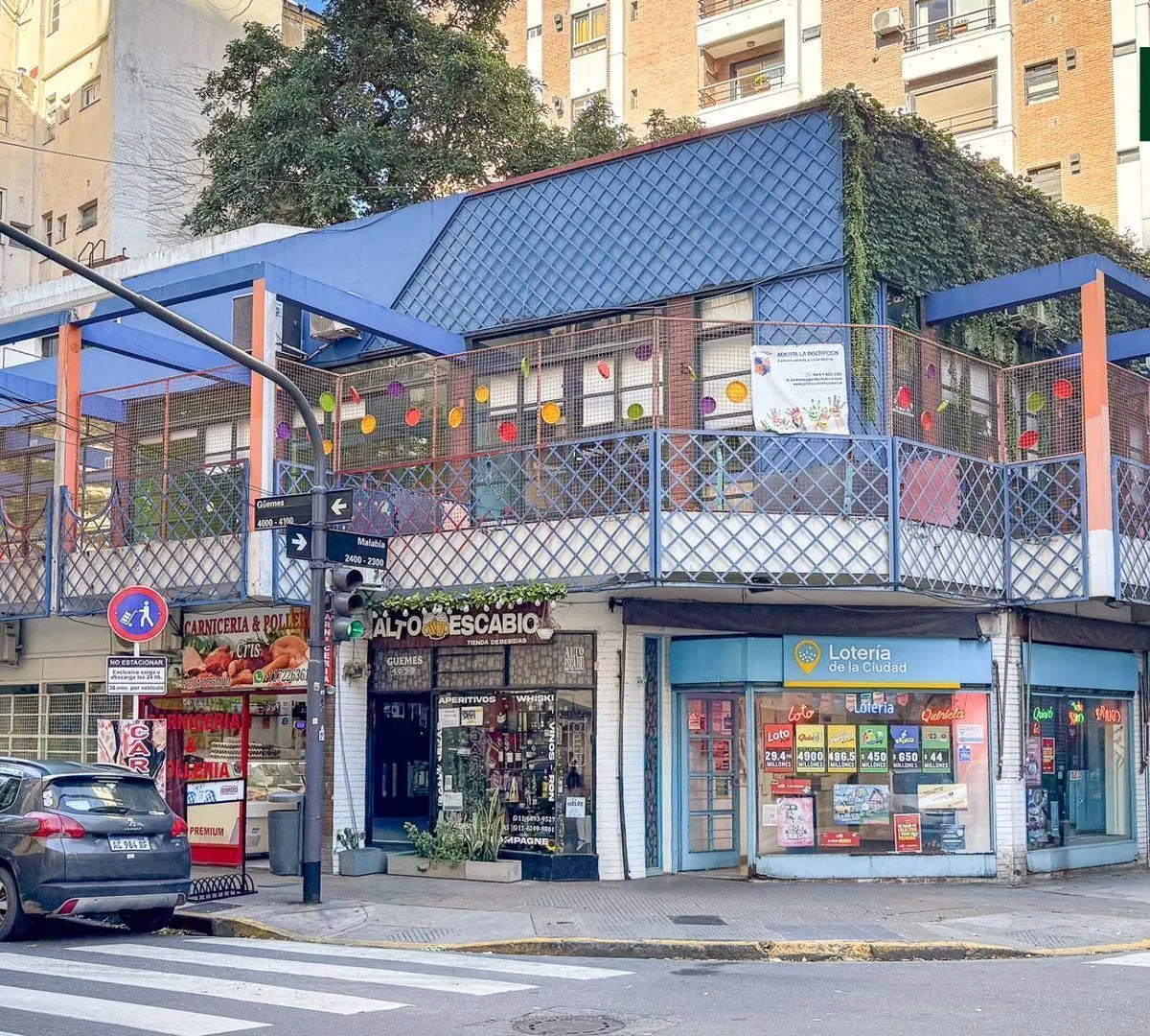PH em Palermo, em esquina, desenvolvido em 1º e 2º piso, com aproximadamente 450 m² totais. Unidade de uso comercial, com salas para trabalho ou aulas, áreas administrativas, cozinha independente e núcleo de serviços com banheiros múltiplos. Conta com pátio descoberto, balcões e terraços próprios, com ventilação cruzada. Situa-se na interseção de Güemes e Malabia, perto de Av. Scalabrini Ortiz.