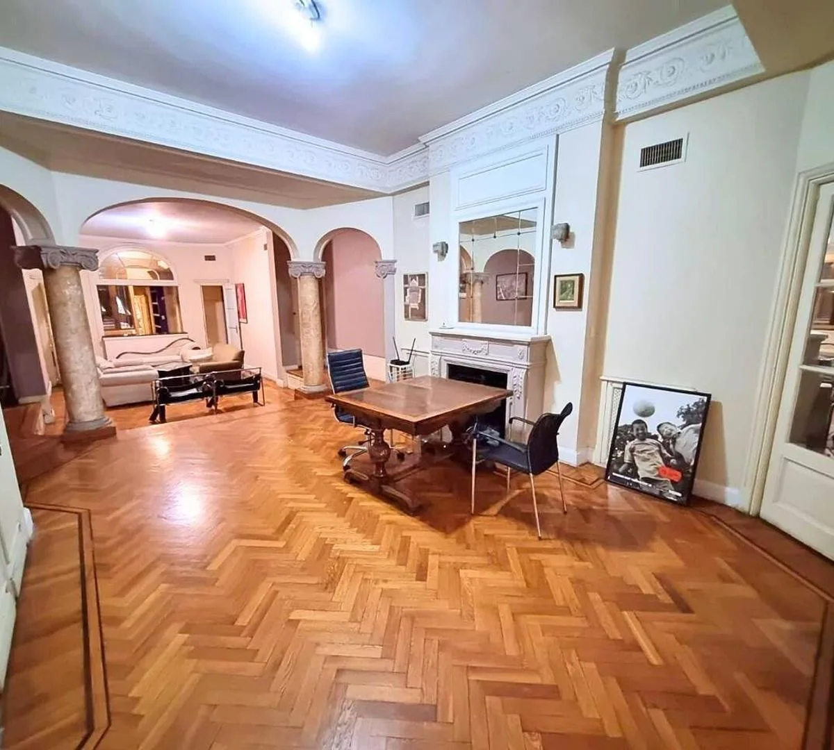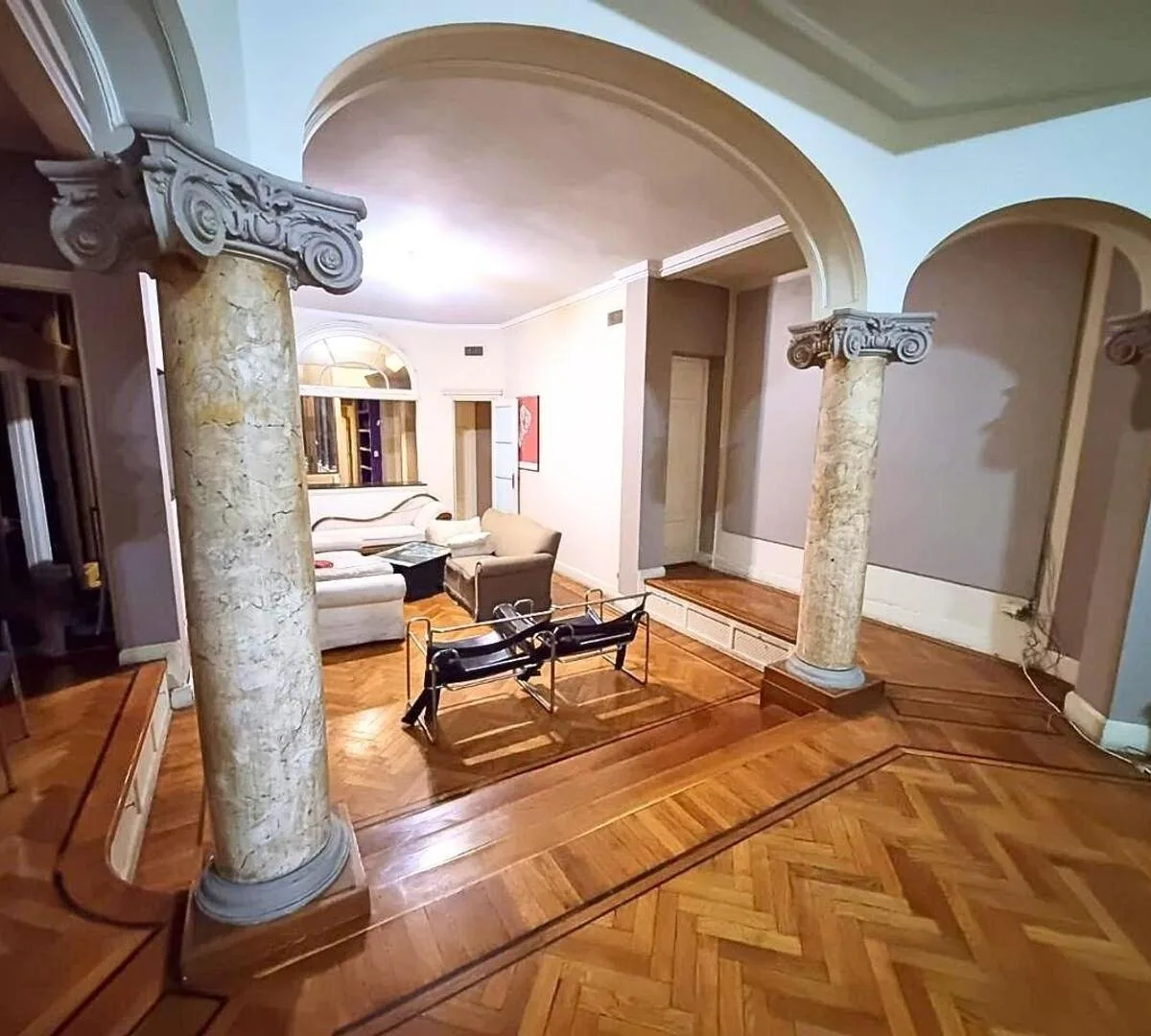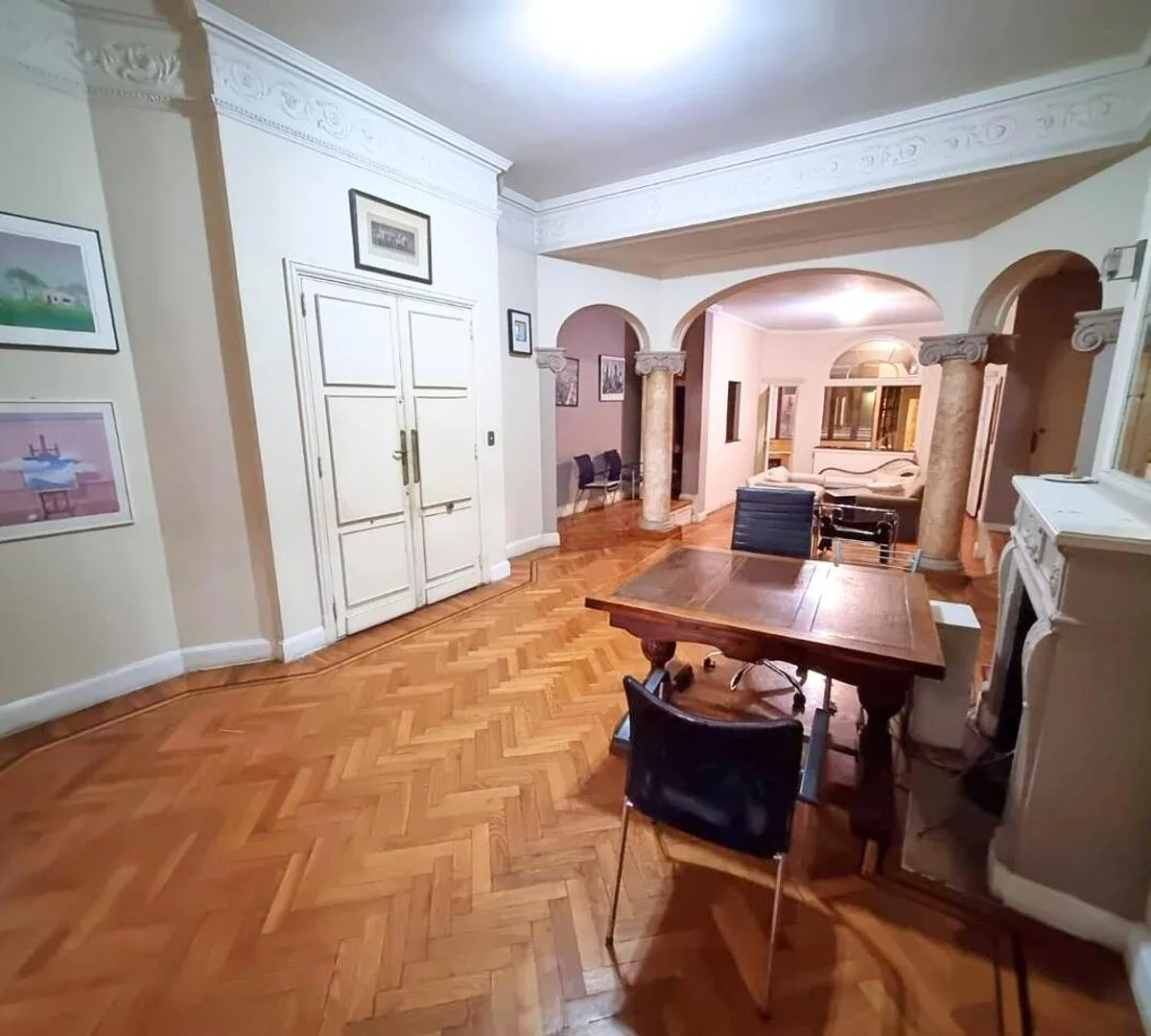Apartamento em edifício antigo, com 310 m² no 4º andar, entre as ruas Suipacha e Carlos Pellegrini, com frente e fundos. Conta com hall privativo. A unidade tem 5 quartos, sendo 3 suítes, lavabo de recepção, sala de estar com lareira e colunas, sala de jantar em desnível para a rua, escritório contíguo com saída para varanda, cozinha, quarto de serviço e setor de lavanderia.