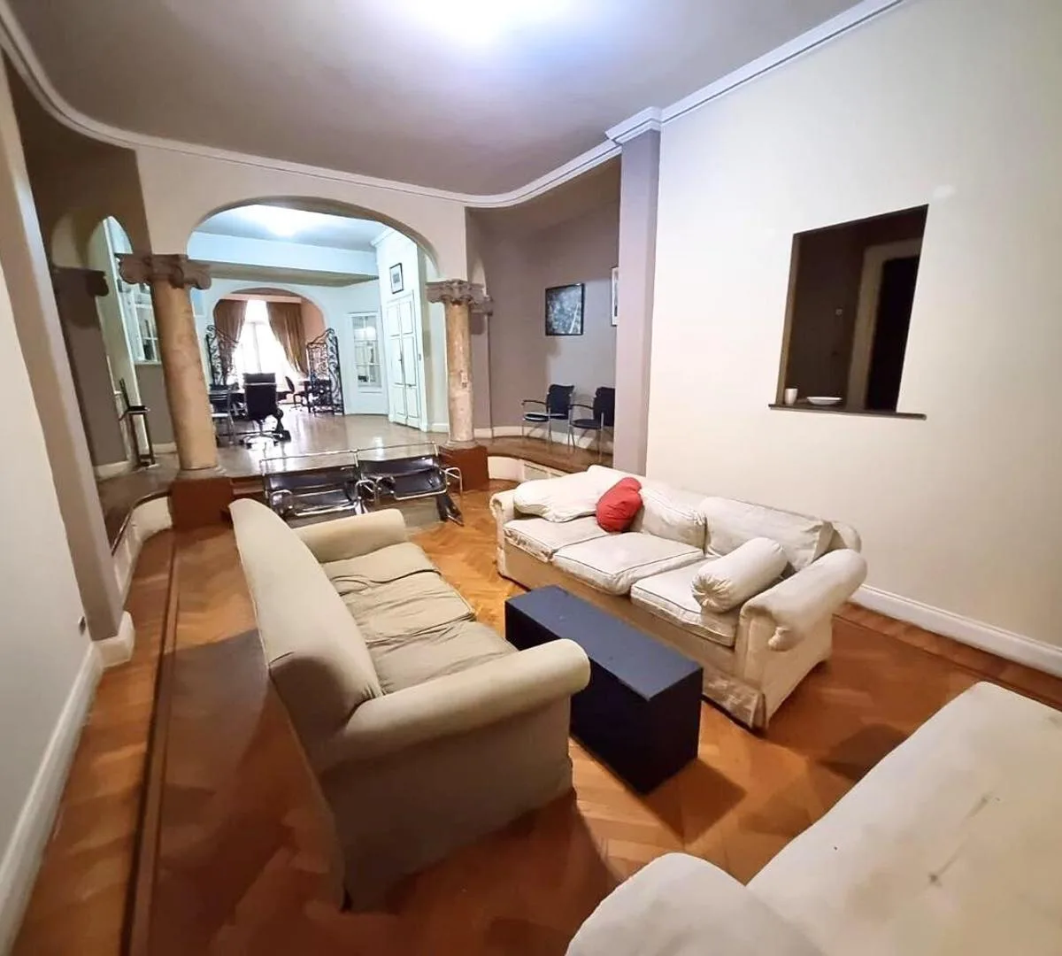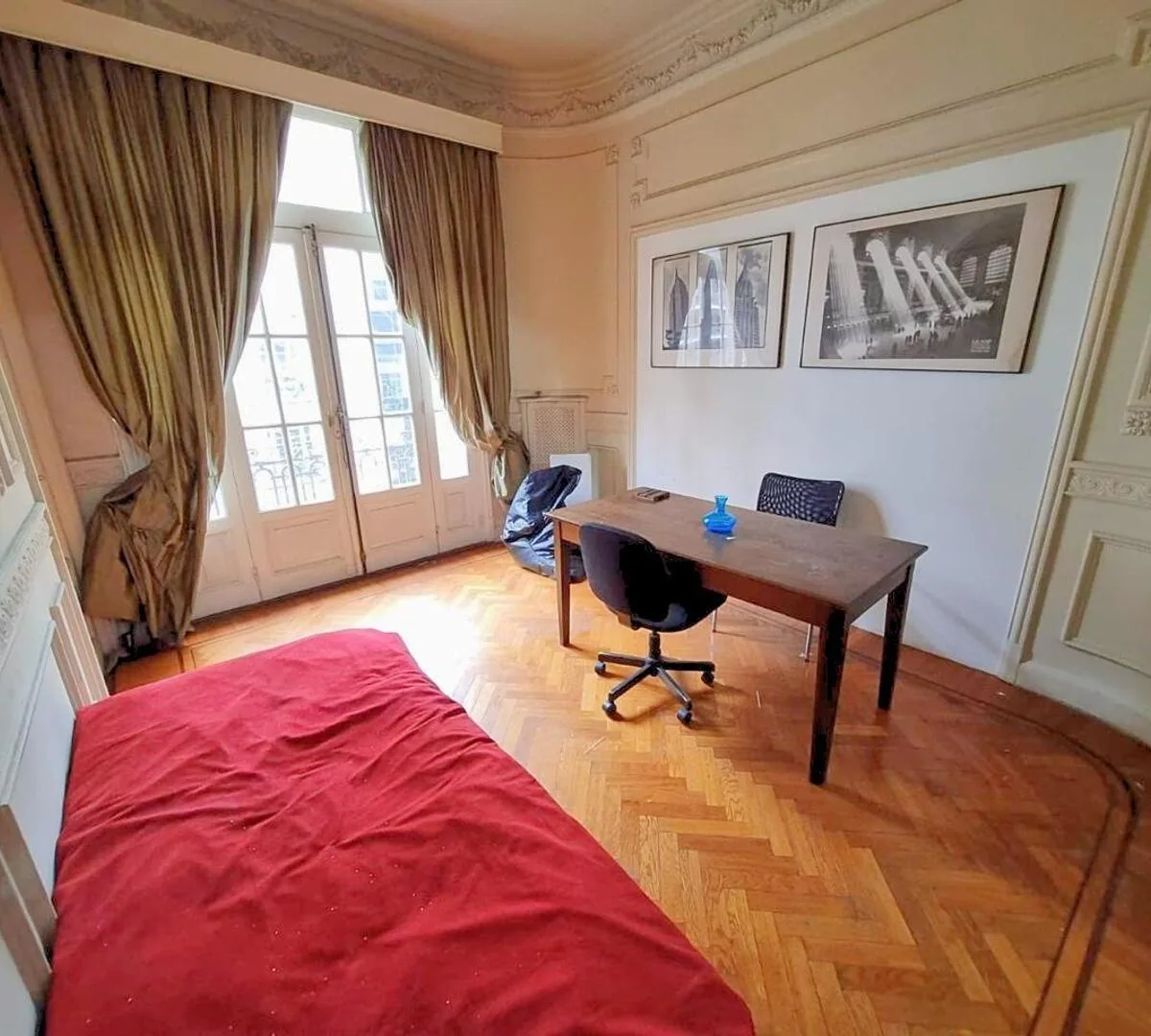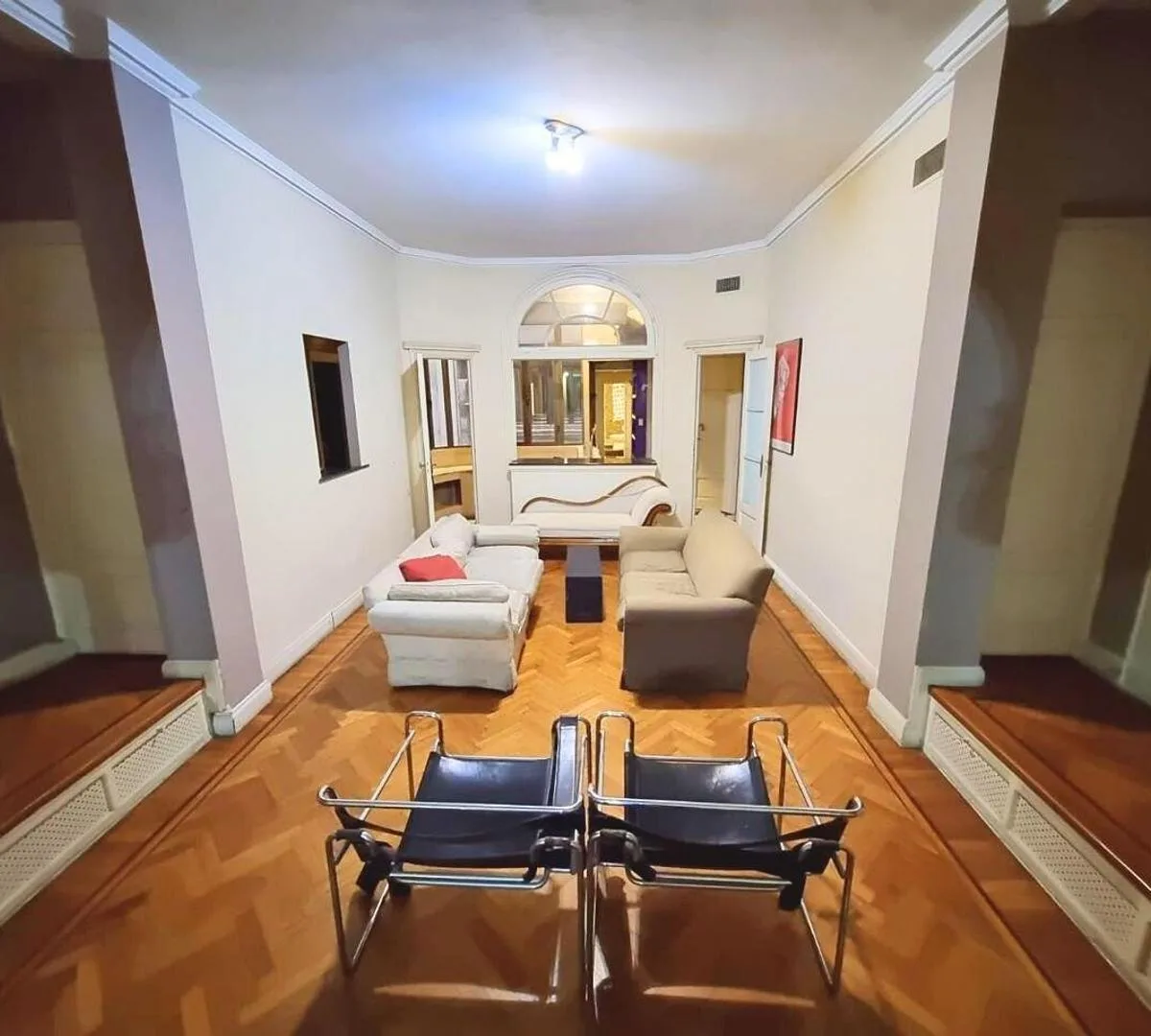 Apartamento em edifício antigo, com 310 m² no 4º andar, entre as ruas Suipacha e Carlos Pellegrini, com frente e fundos. Conta com hall privativo. A unidade tem 5 quartos, sendo 3 suítes, lavabo de recepção, sala de estar com lareira e colunas, sala de jantar em desnível para a rua, escritório contíguo com saída para varanda, cozinha, quarto de serviço e setor de lavanderia.