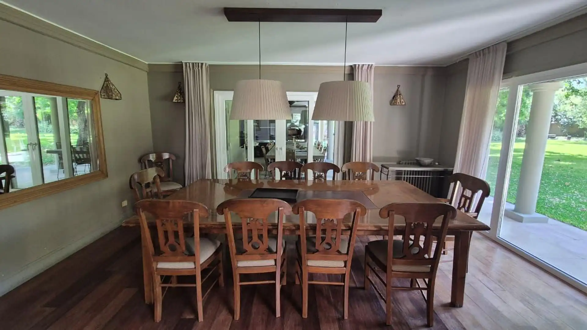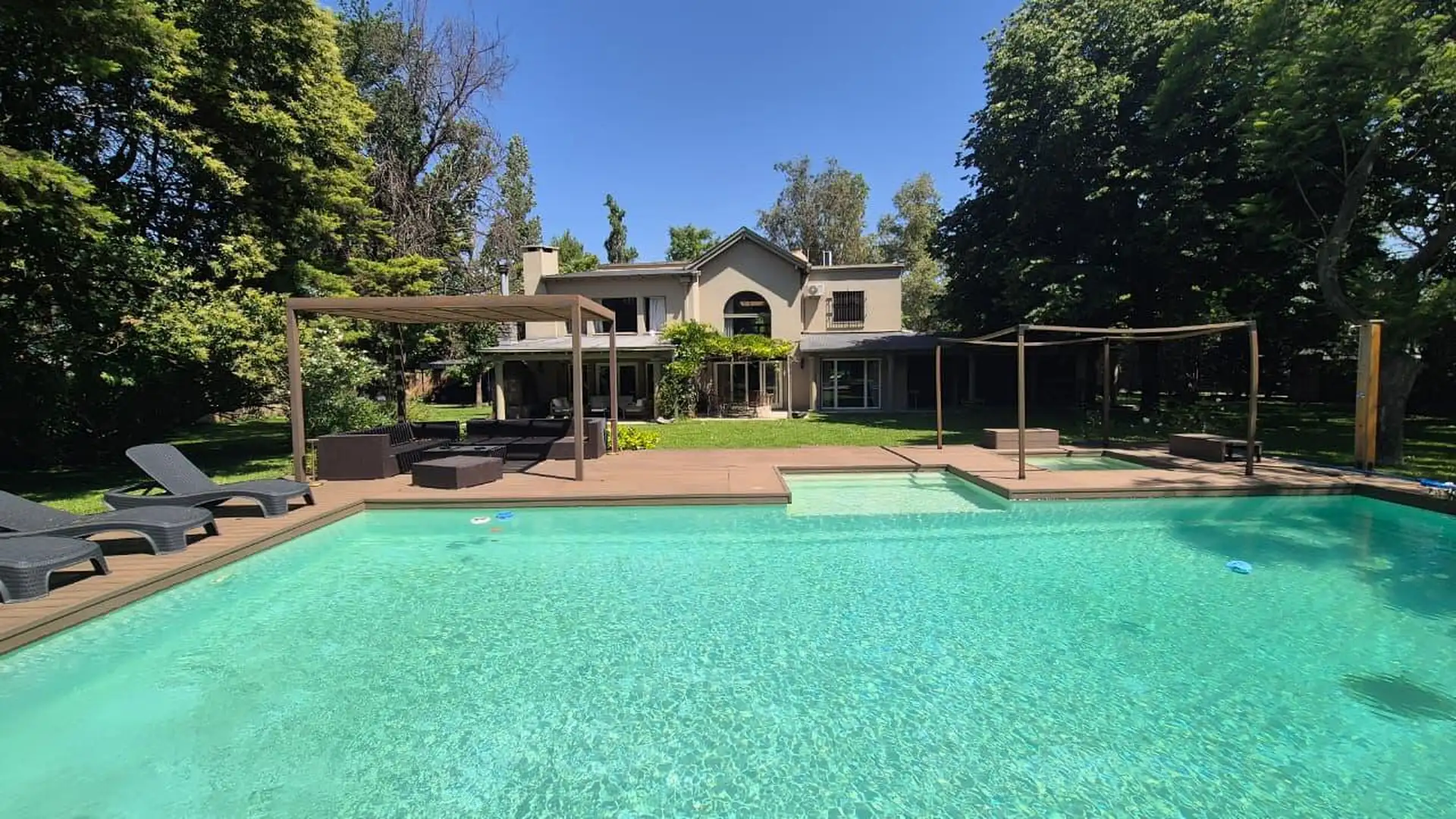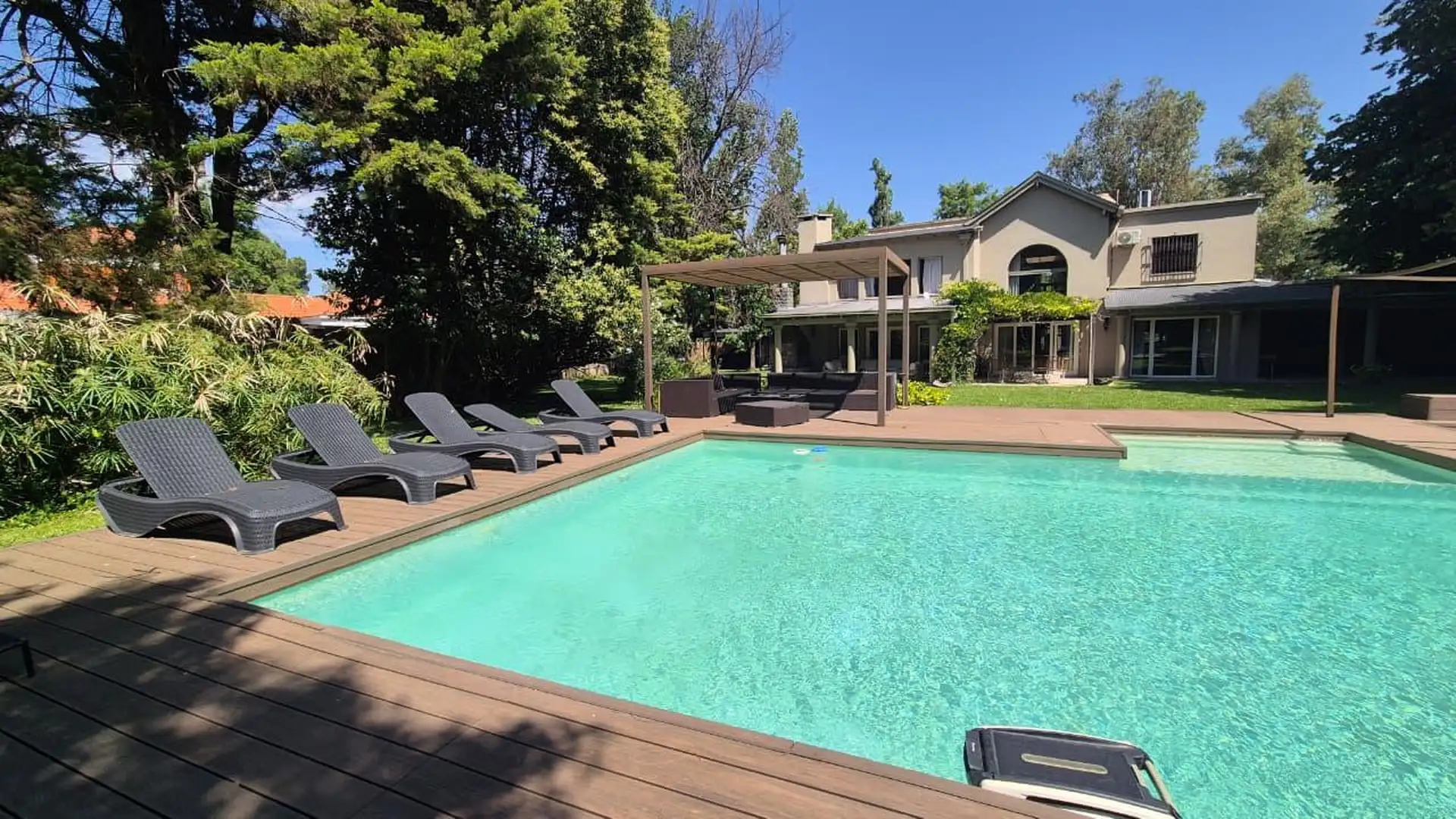 Casa em General Pacheco, Tigre, sobre lote de 3.000 m², com 520 m². Distribuída em 2 plantas. No térreo há hall de entrada, living, sala de jantar, microcine, lavabo, cozinha, sala de jantar diária, lavanderia, playroom, 2 dormitórios com banheiro completo para convidados e dependência de serviço com banheiro completo. No andar superior há hall de distribuição, escritório-biblioteca, suíte principal com banheiro completo e jacuzzi com teto de vidro, além de 2 dormitórios amplos com banheiro comp