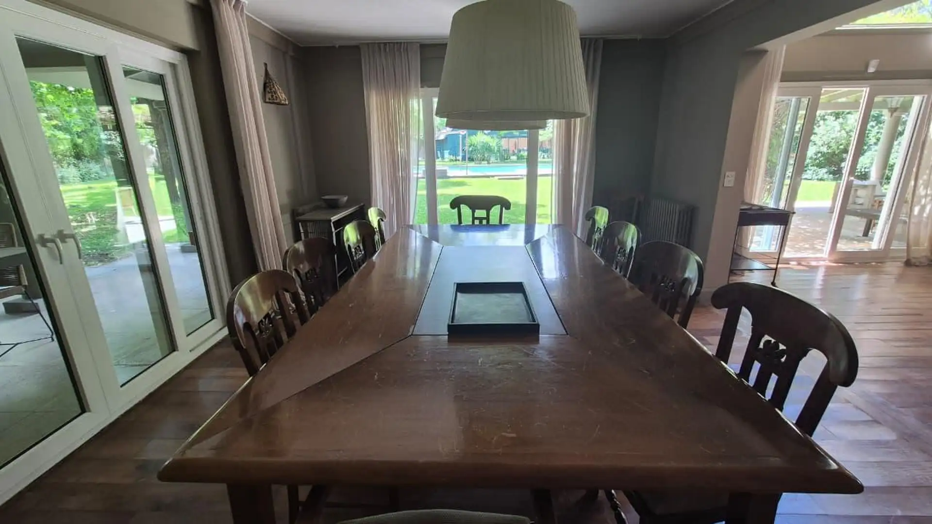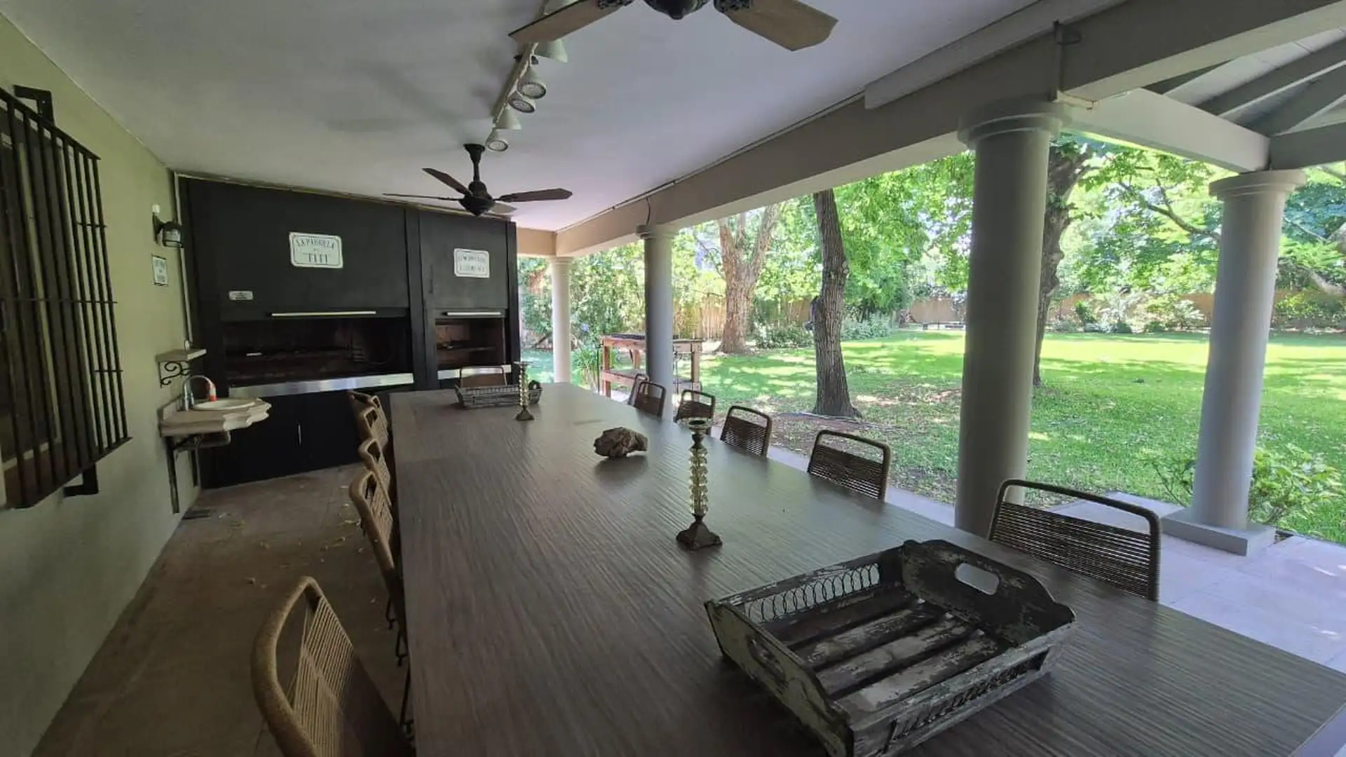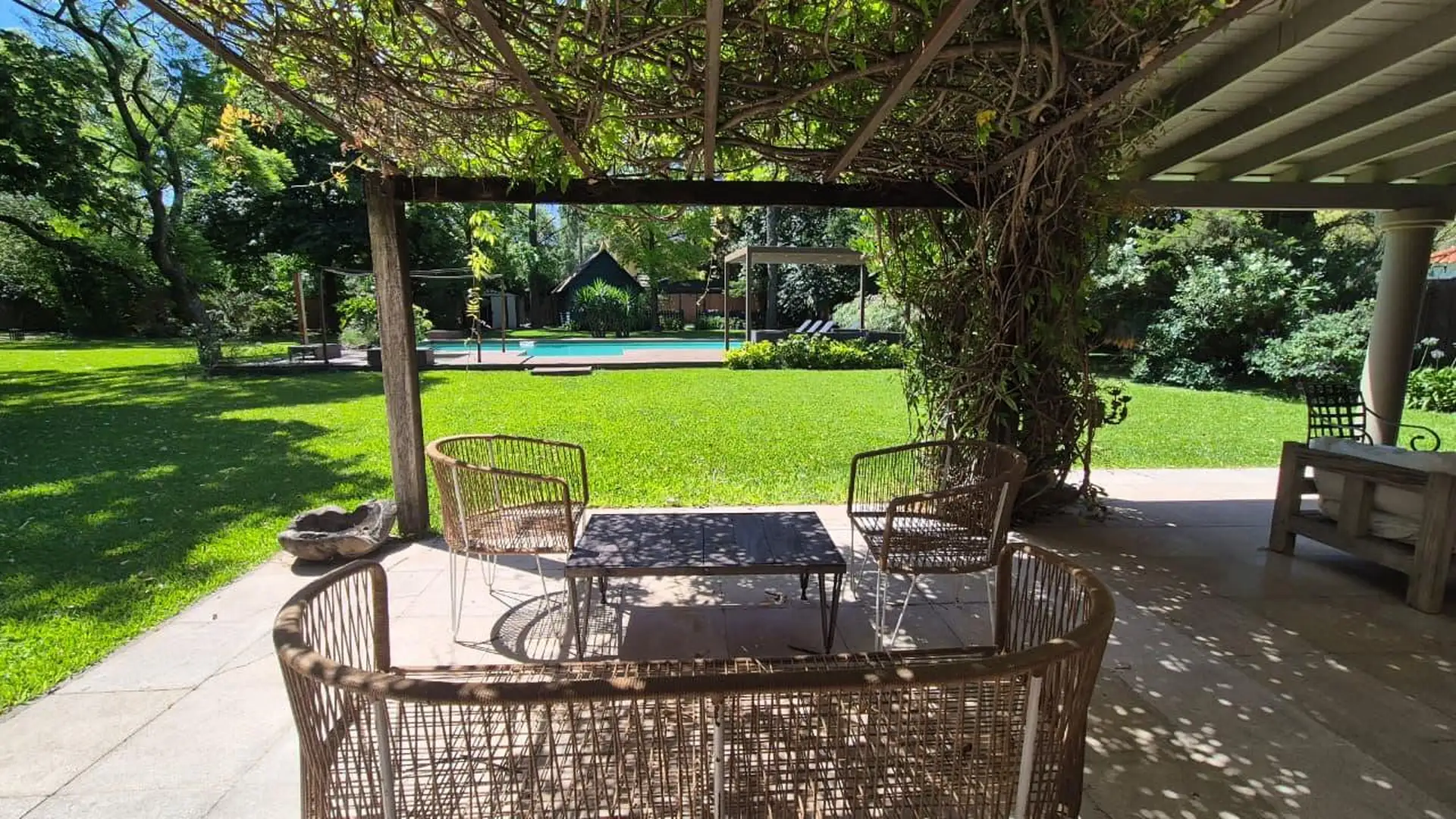 Casa em General Pacheco, Tigre, sobre lote de 3.000 m², com 520 m². Distribuída em 2 plantas. No térreo há hall de entrada, living, sala de jantar, microcine, lavabo, cozinha, sala de jantar diária, lavanderia, playroom, 2 dormitórios com banheiro completo para convidados e dependência de serviço com banheiro completo. No andar superior há hall de distribuição, escritório-biblioteca, suíte principal com banheiro completo e jacuzzi com teto de vidro, além de 2 dormitórios amplos com banheiro comp