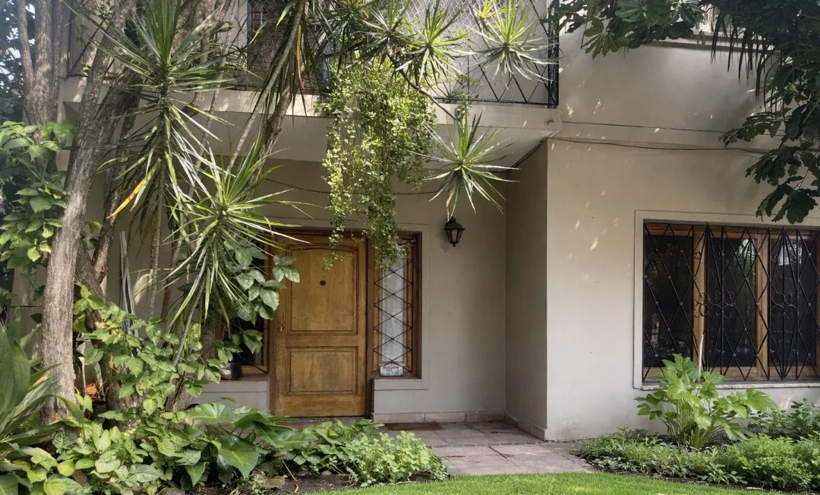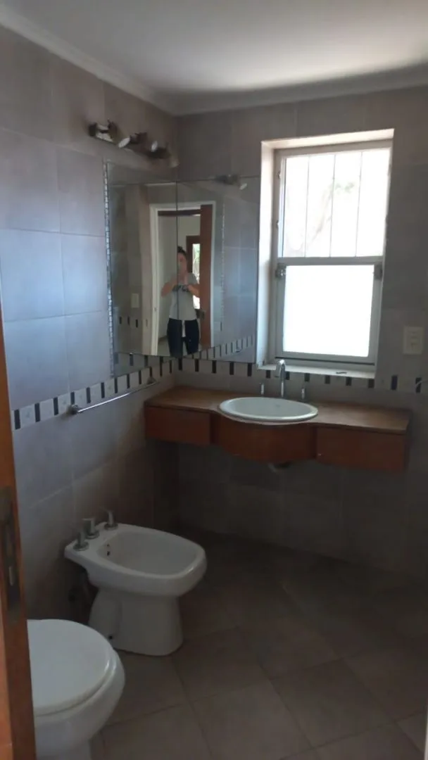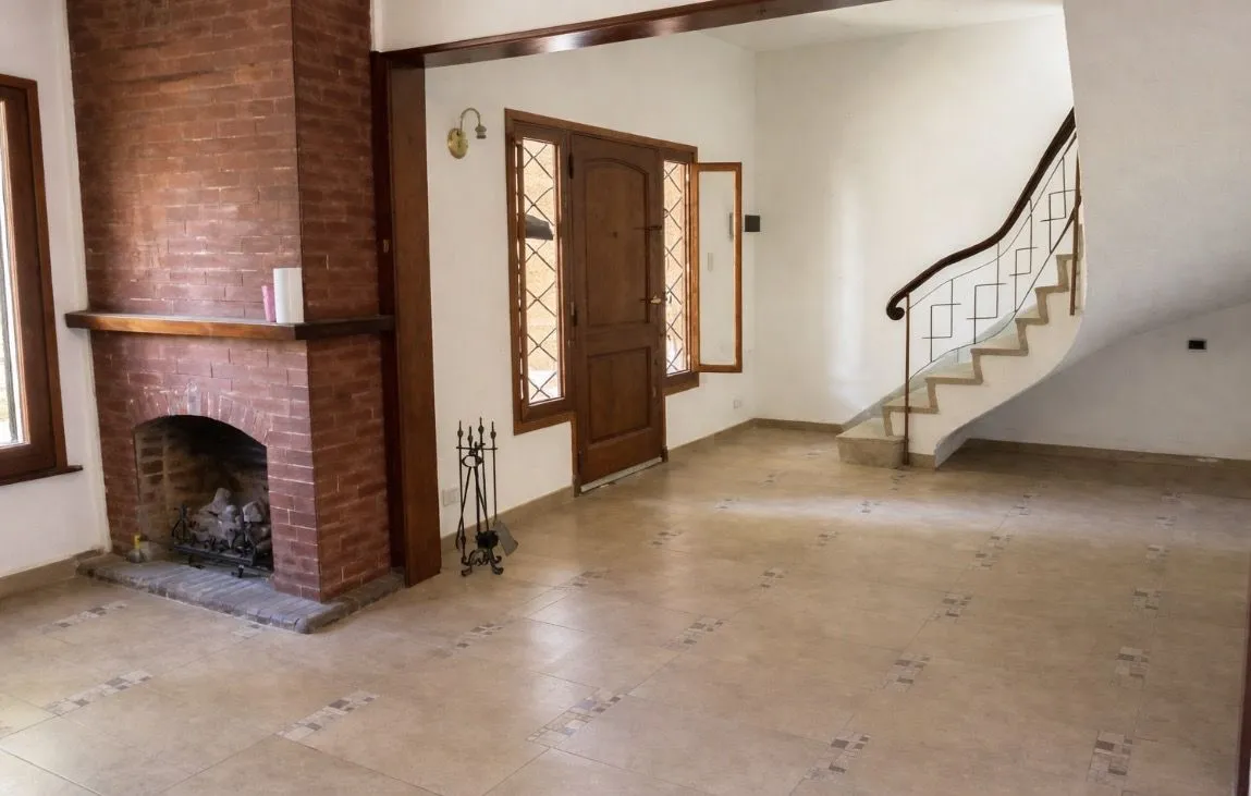Casa para aluguel em Ciudad Jardín Lomas del Palomar, com jardim de frente e 2 vagas de garagem (fixas). Possui living com comedor e lareira, 1 dormitório no térreo, banheiro completo com banheira e cozinha com comedor, ampla, com armário e base, fogão cooktop e forno embutido. O acesso ao pátio posterior é feito pelo comedor; no andar superior há 4 dormitórios com armários, 2 banheiros completos (um com box/ducha) e 1 dormitório com acesso à varanda/terraço. O aluguel tem reajuste trimestral co