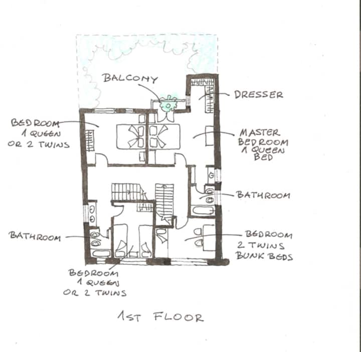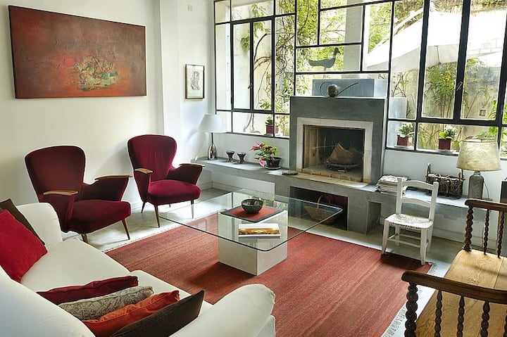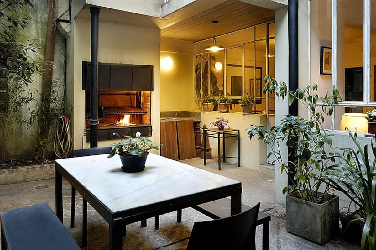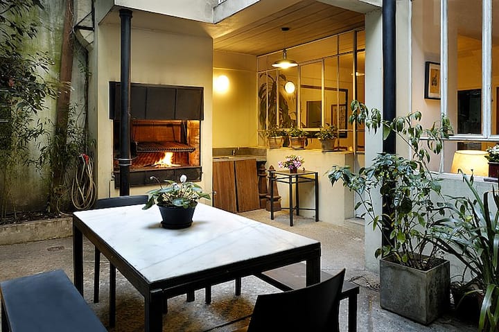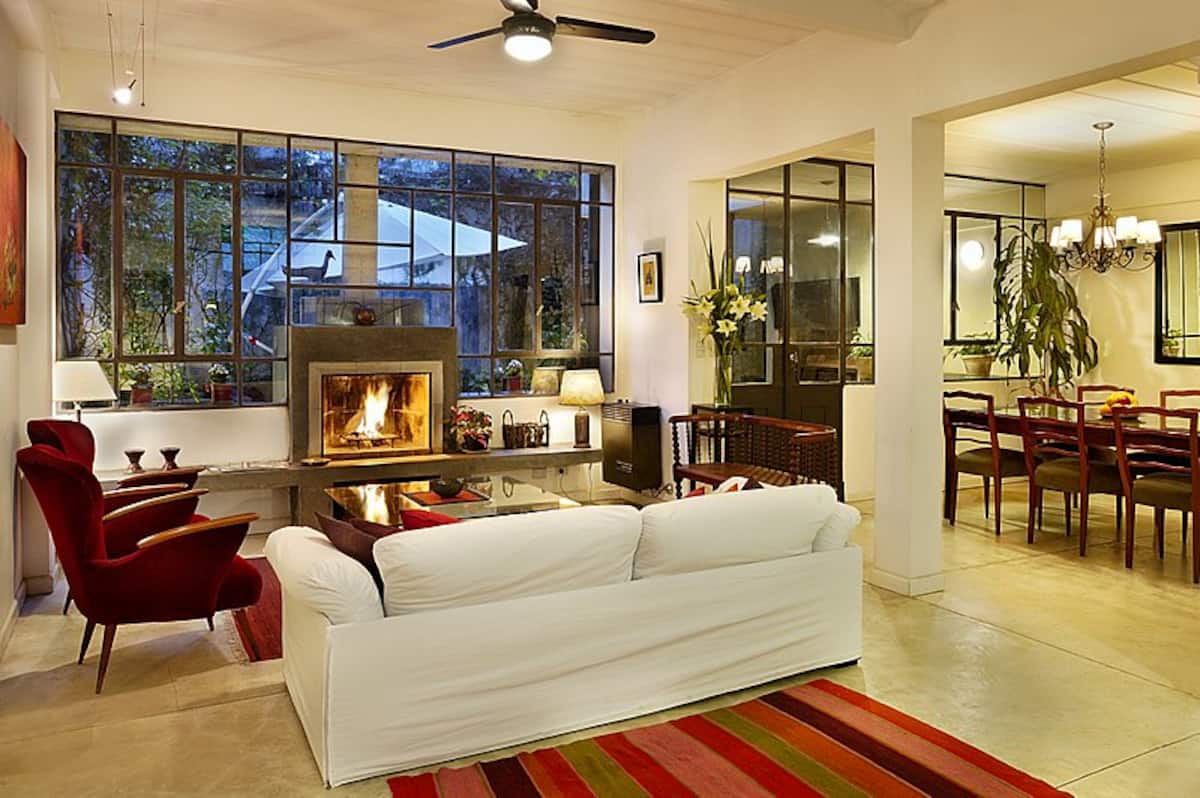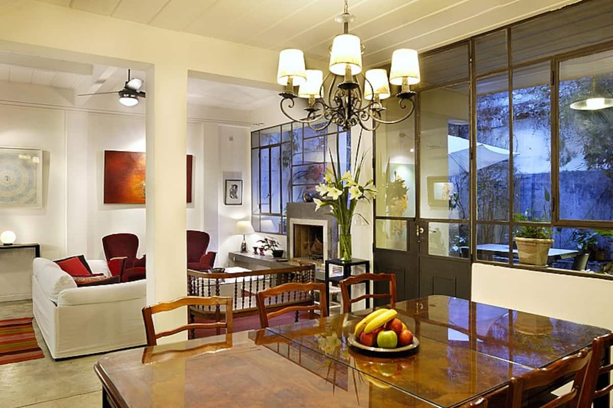 Casa em Villa Crespo com 5 quartos, 3,5 banheiros e 2 andares, com entrada térrea para hall e sala de estar com lareira e sala de jantar voltadas para um pátio interno com plantas e área de churrasco. Cozinha e lavabo no piso térreo, com escada para os dormitórios; no 1º andar há quarto principal com cama queen e banheiro privativo completo com banheira, mais mais 2 dormitórios com opções de cama queen ou 2 camas de solteiro, além de outro banheiro completo com antecâmara aberta, 2 lavatórios e