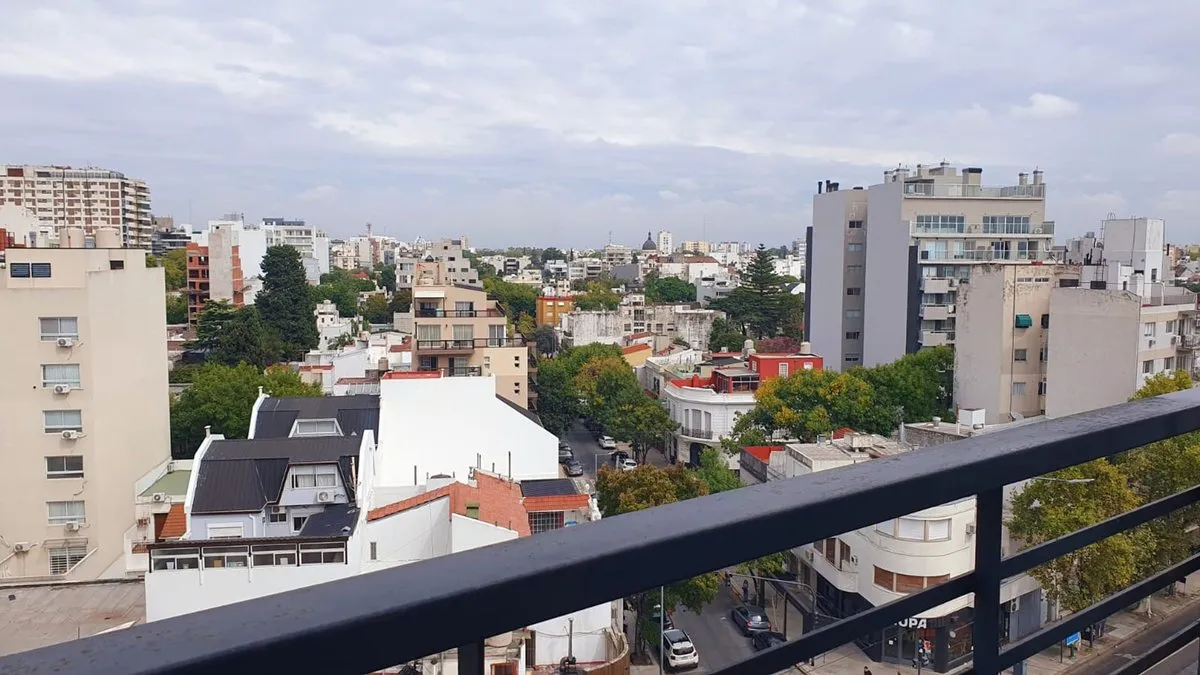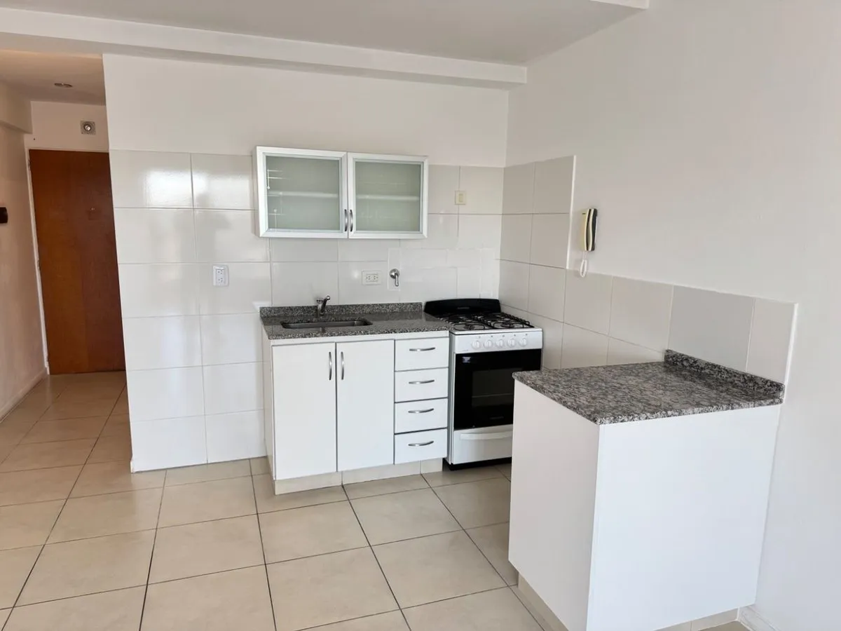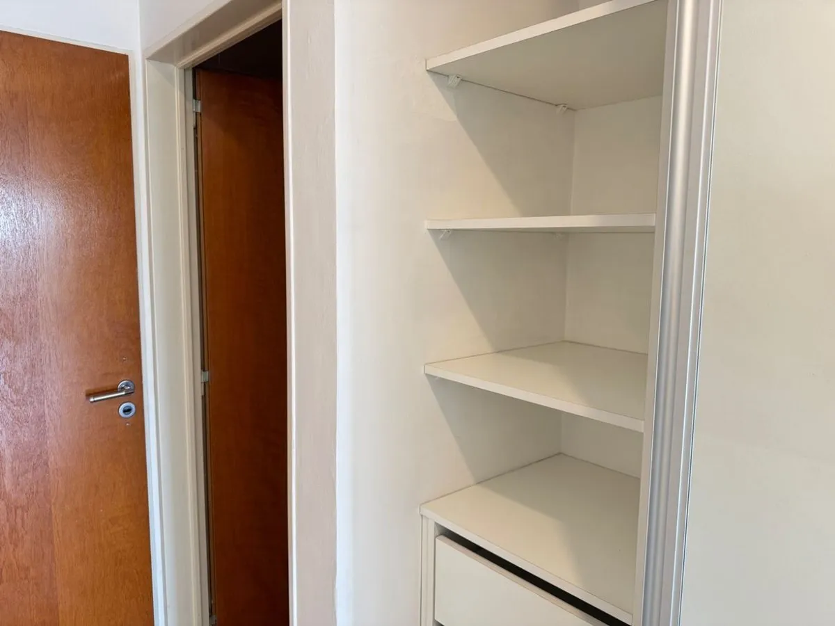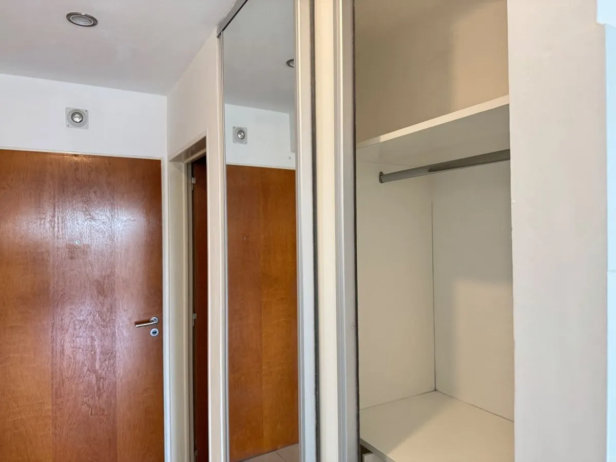 Kitnet no 8º andar, de frente para a rua, com 33 m² totais. Cozinha semi integrada ao ambiente principal, banheiro completo com banheira e box, e varanda com vista panorâmica. Ar-condicionado frio-calor, espaço para lavadora e terraço com área de churrasco.