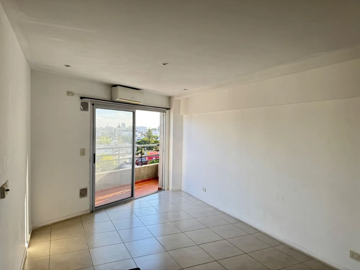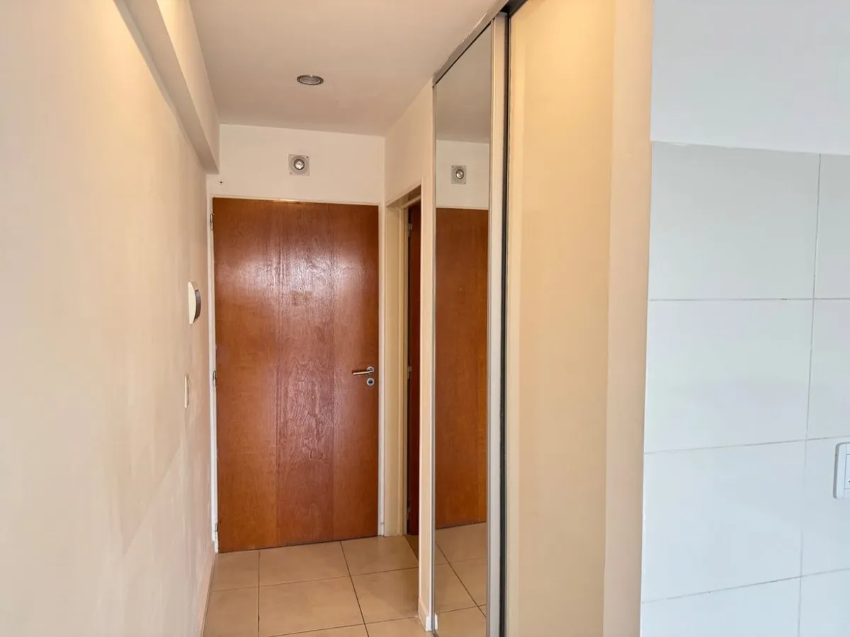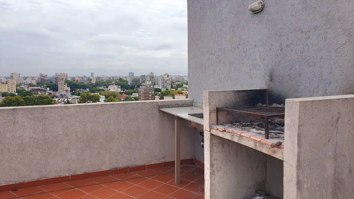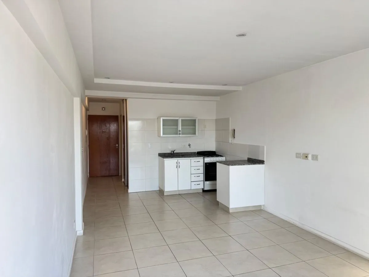 Kitnet no 8º andar, de frente para a rua, com 33 m² totais. Cozinha semi integrada ao ambiente principal, banheiro completo com banheira e box, e varanda com vista panorâmica. Ar-condicionado frio-calor, espaço para lavadora e terraço com área de churrasco.