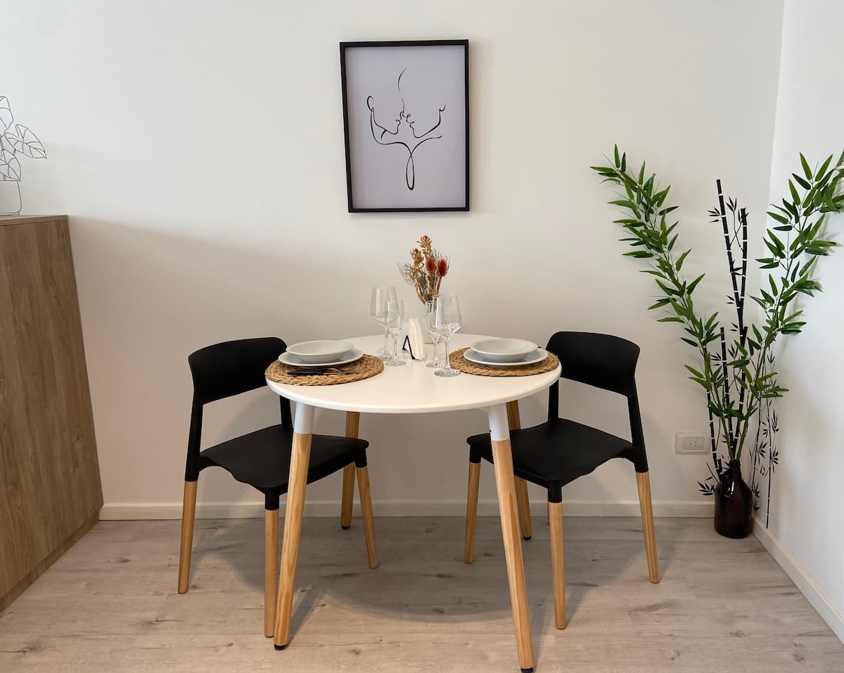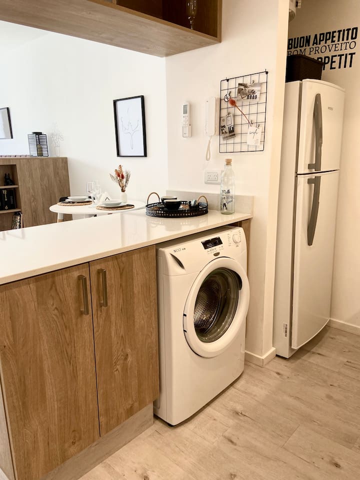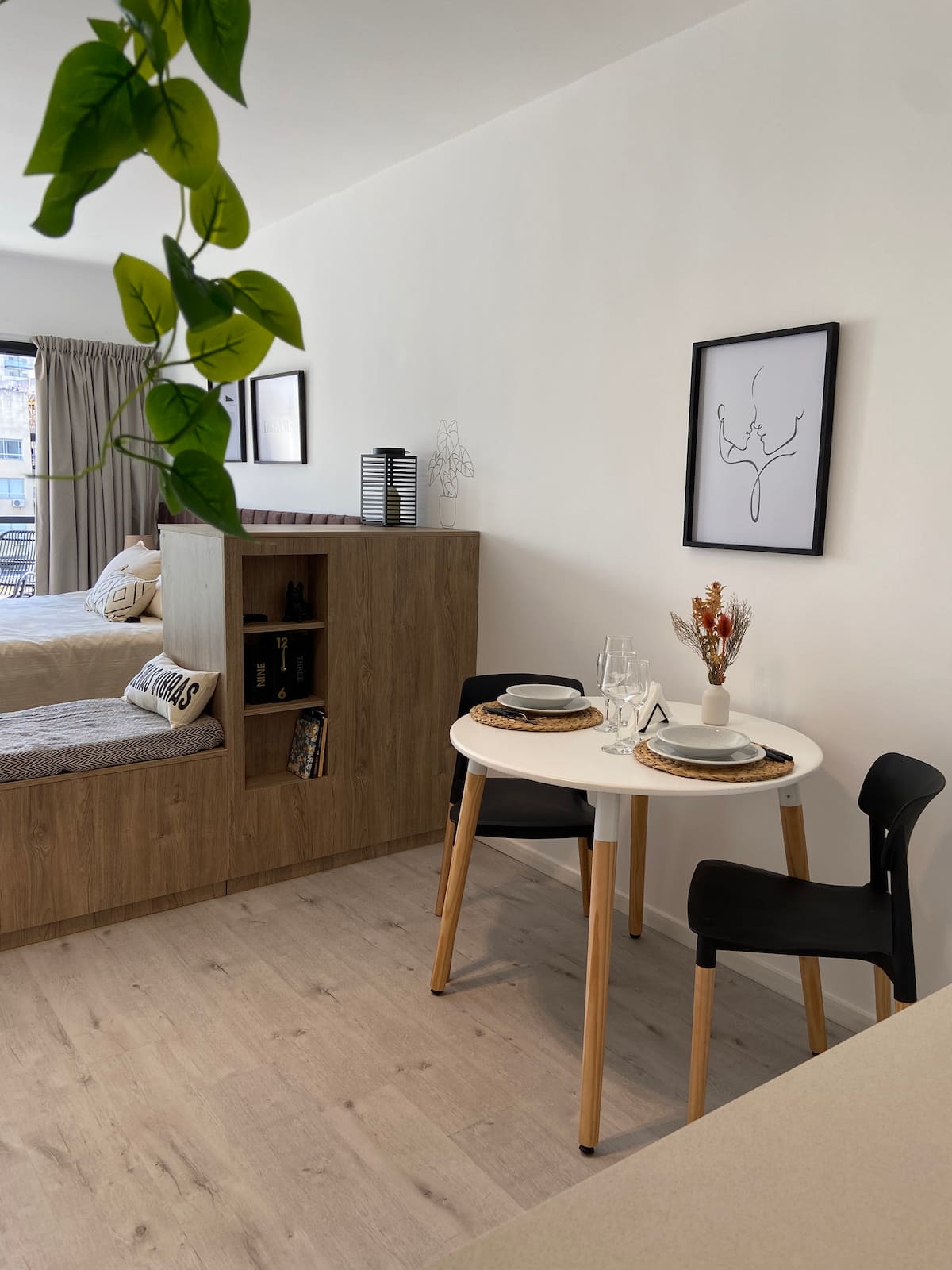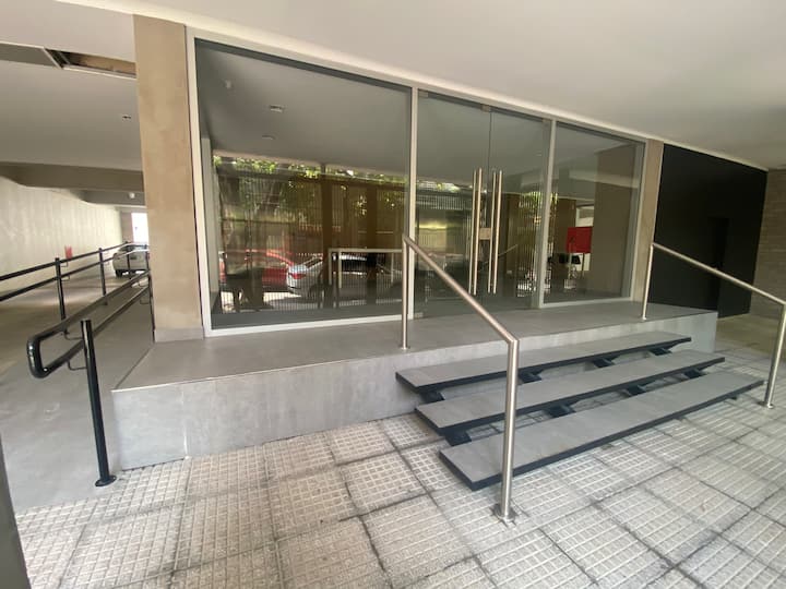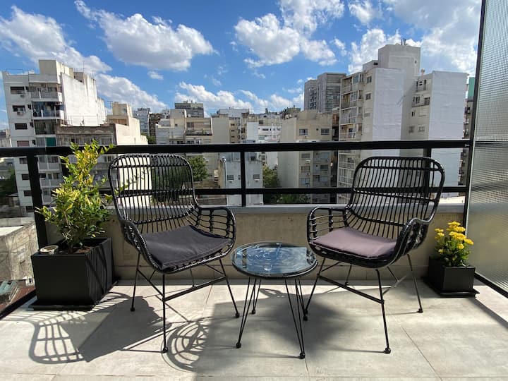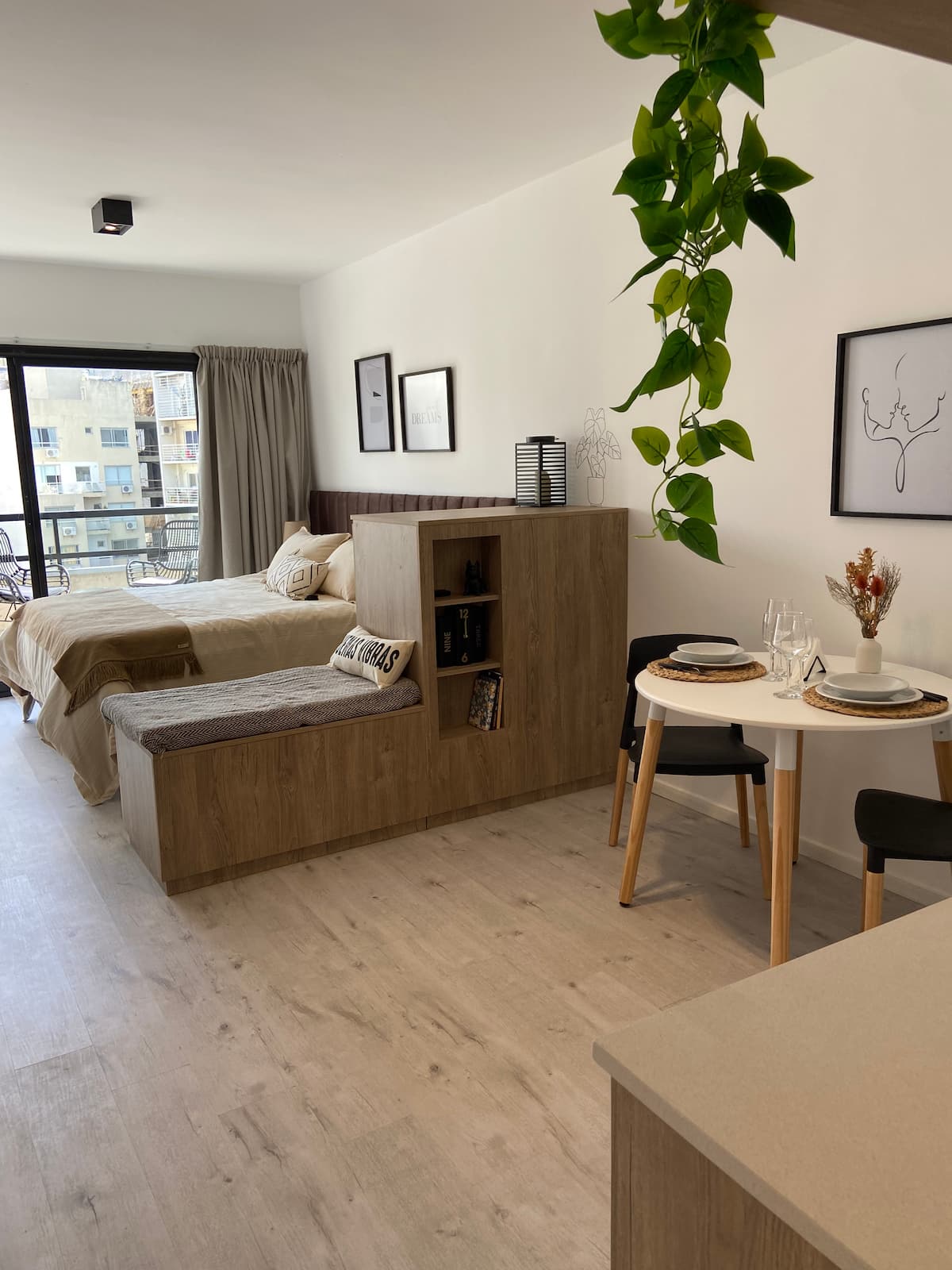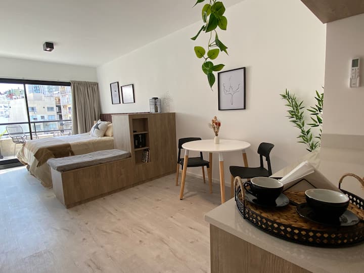 Apartamento tipo studio em Almagro. Unidade nova, com acabamentos e projeto recentes. O texto informa que há destaque para a iluminação natural.