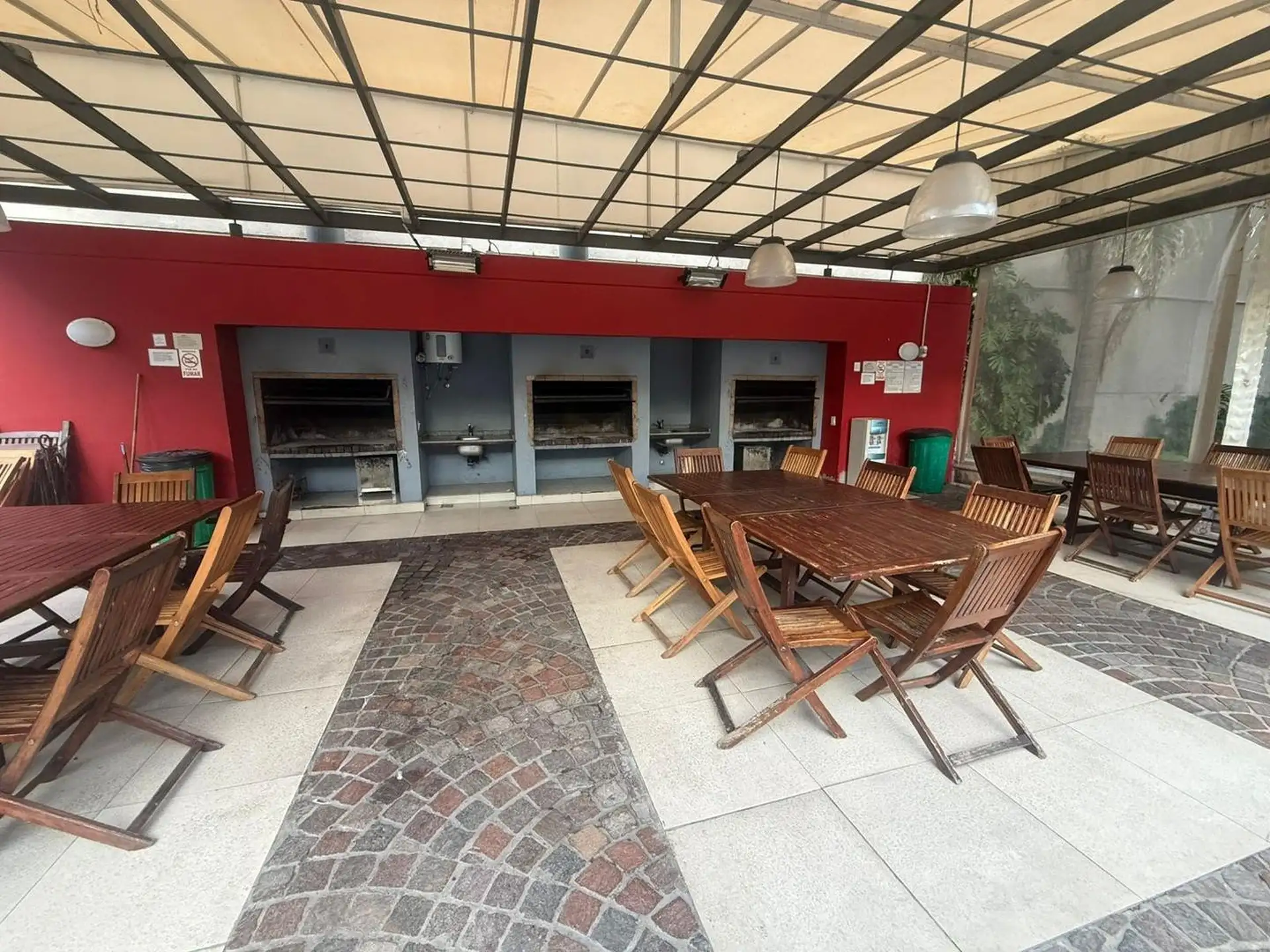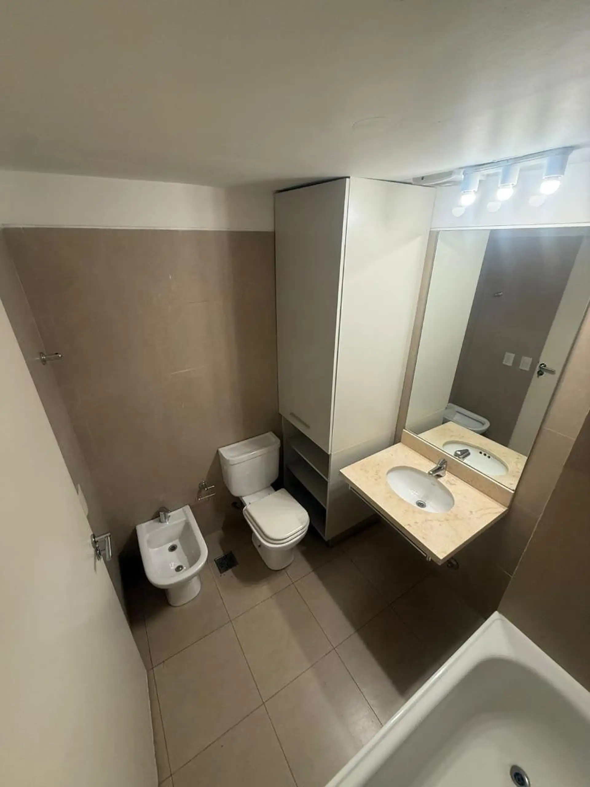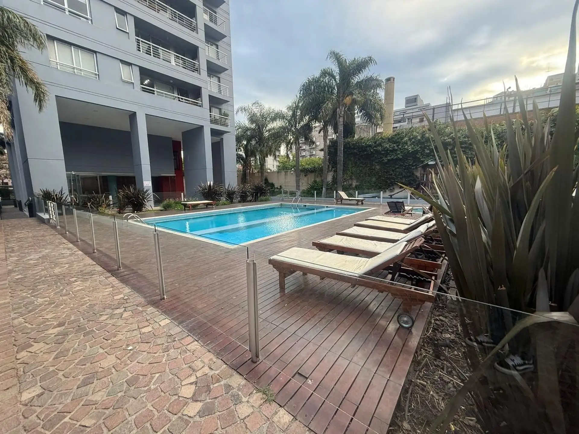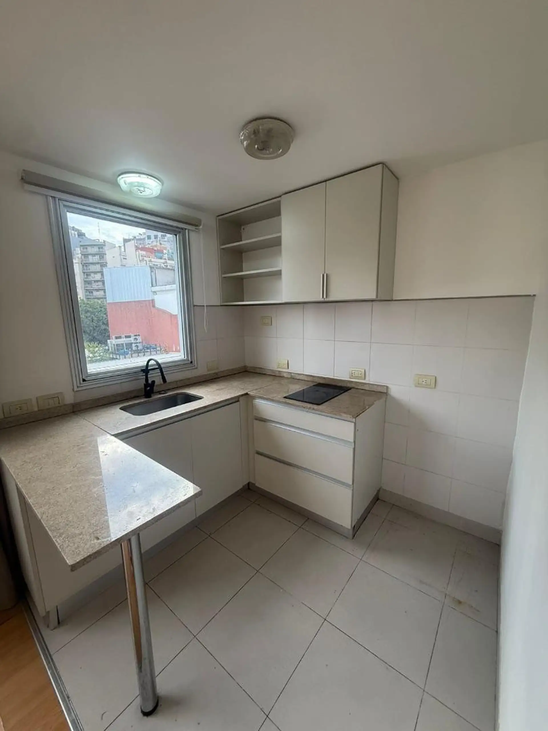 Kitnet (1 ambiente) com varanda, cozinha integrada e 1 banheiro com banheira em Almagro. Há ar-condicionado e aquecedor de água (termotanque) individual. O edifício tem salão de festas (SUM), piscina, academia e segurança.