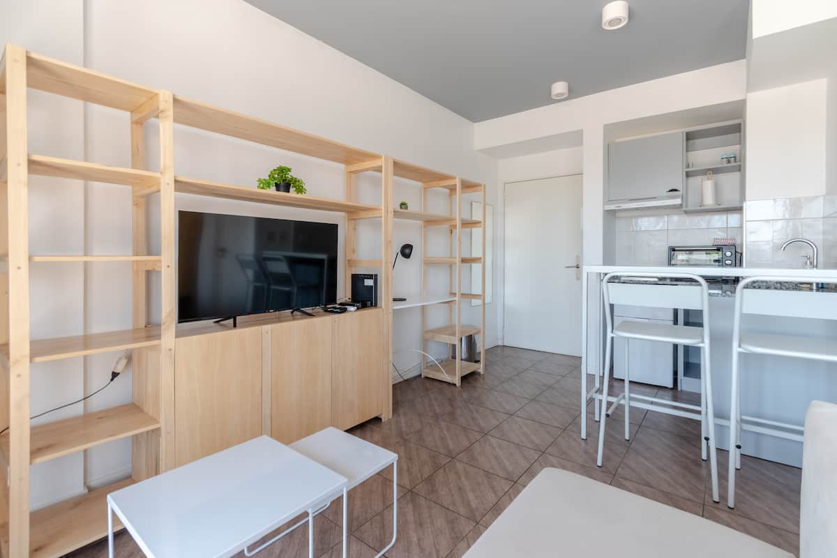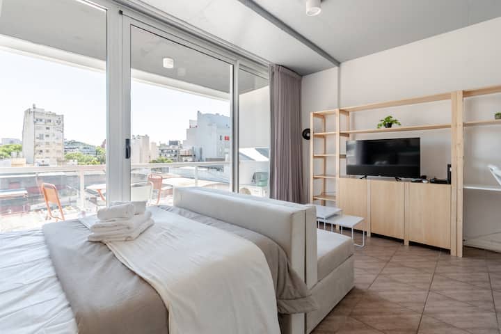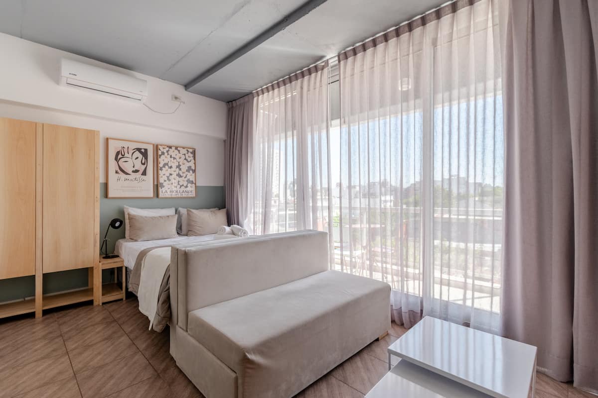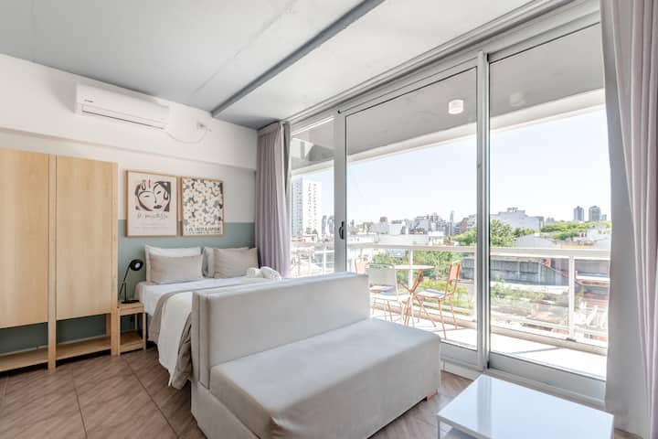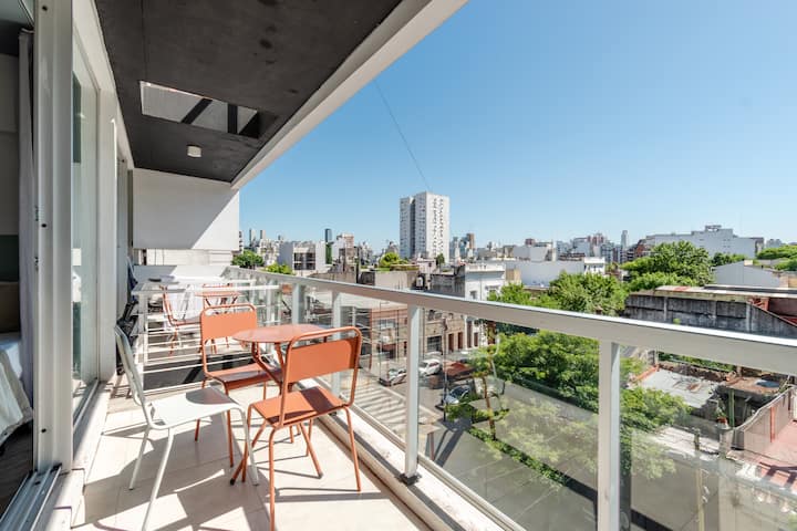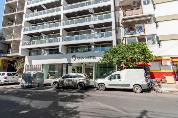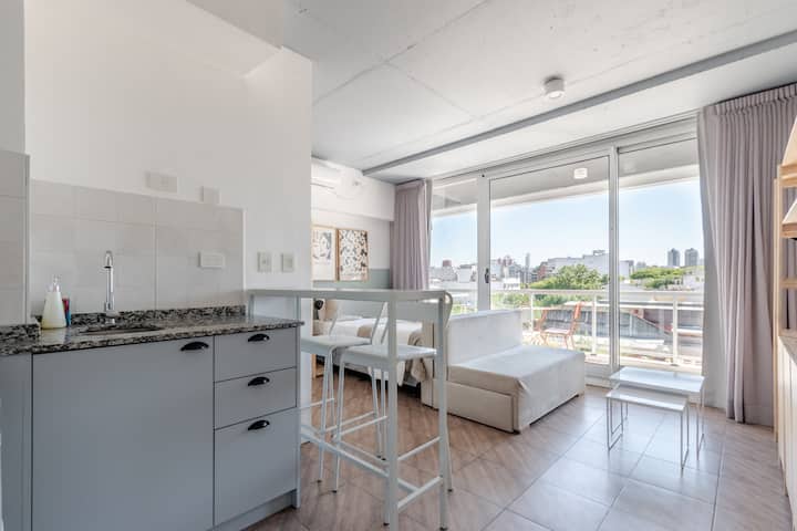 Kitnet em Almagro, com estúdio. Há varanda e o imóvel recebe luz natural. O prédio oferece piscina e lavanderia compartilhada.
