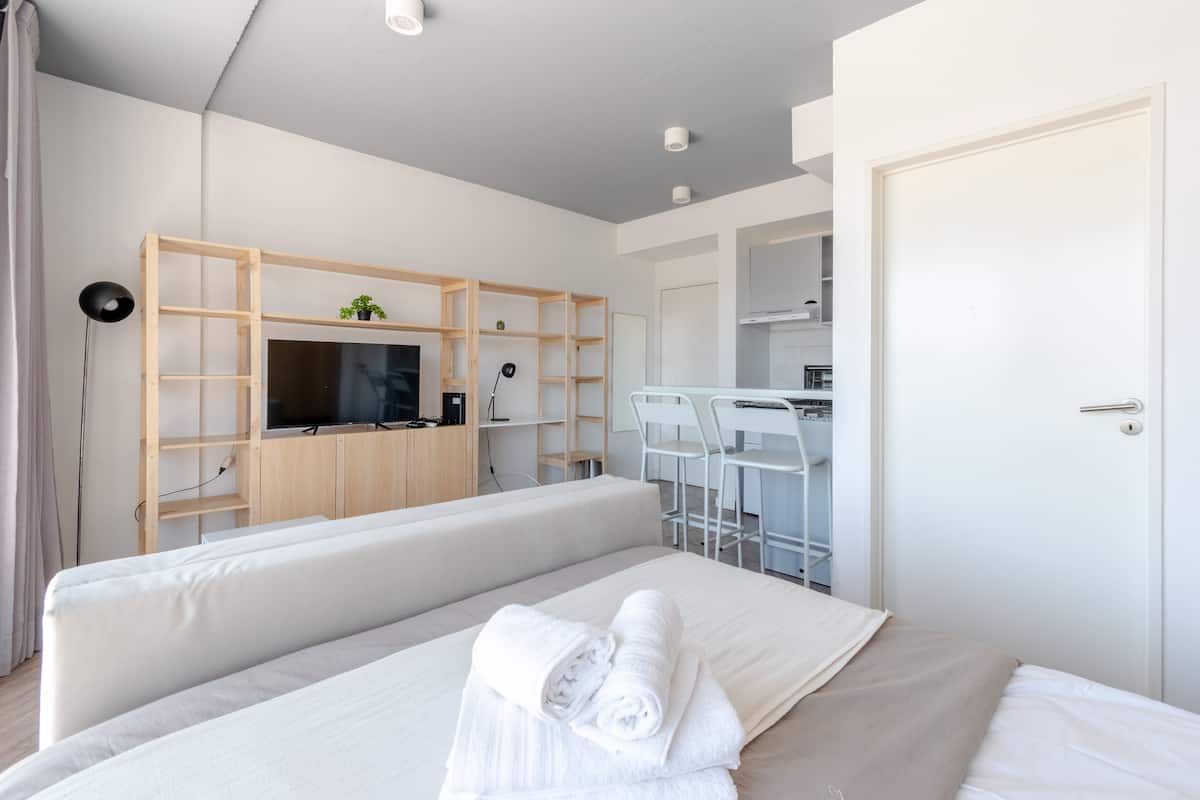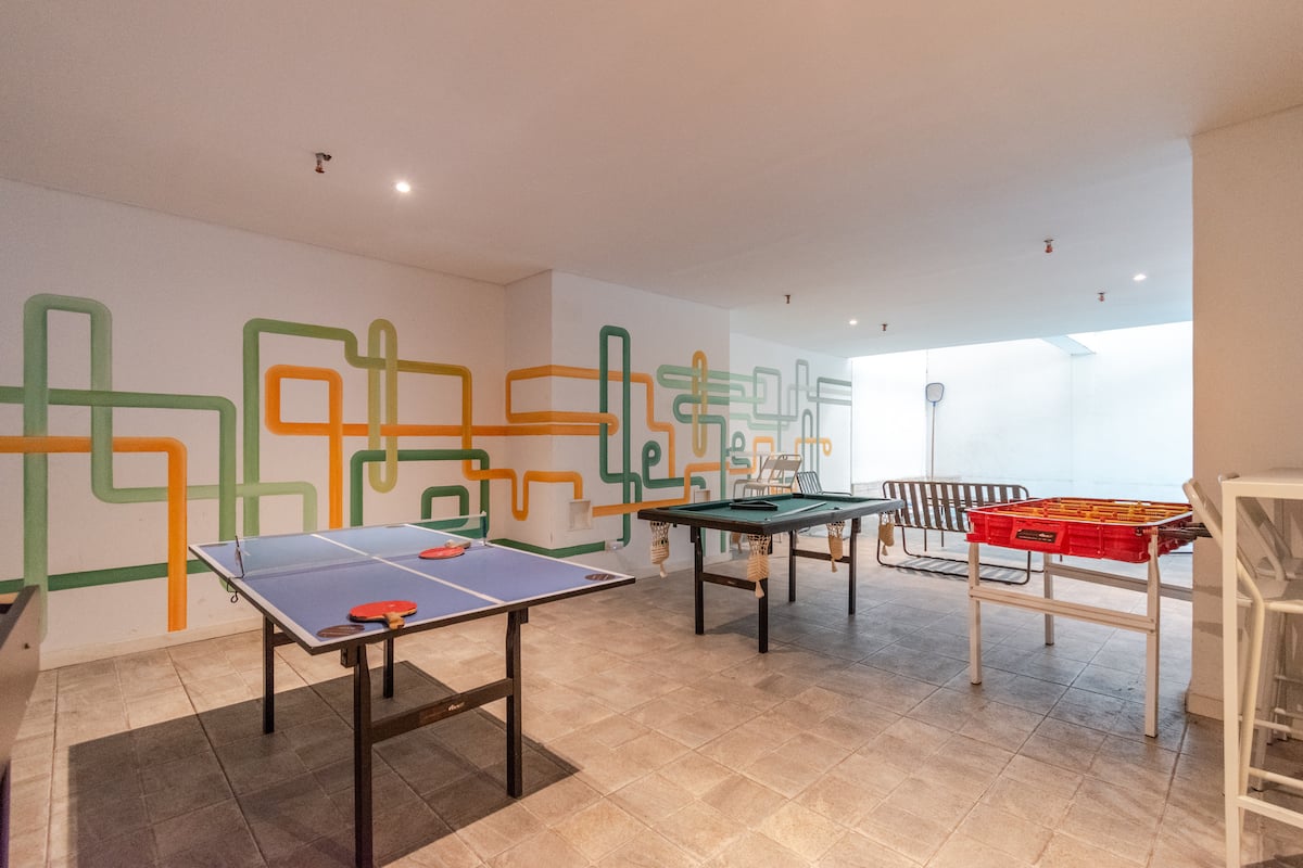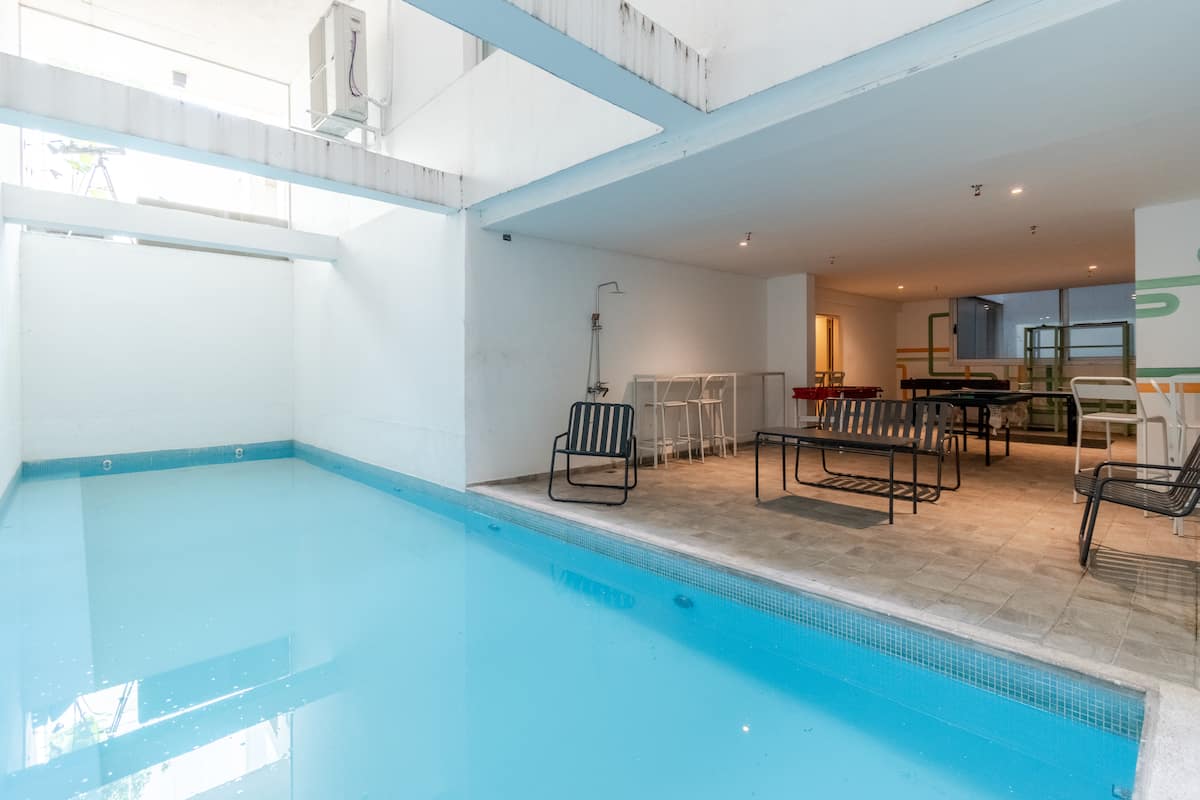 Kitnet em Almagro, com estúdio. Há varanda e o imóvel recebe luz natural. O prédio oferece piscina e lavanderia compartilhada.