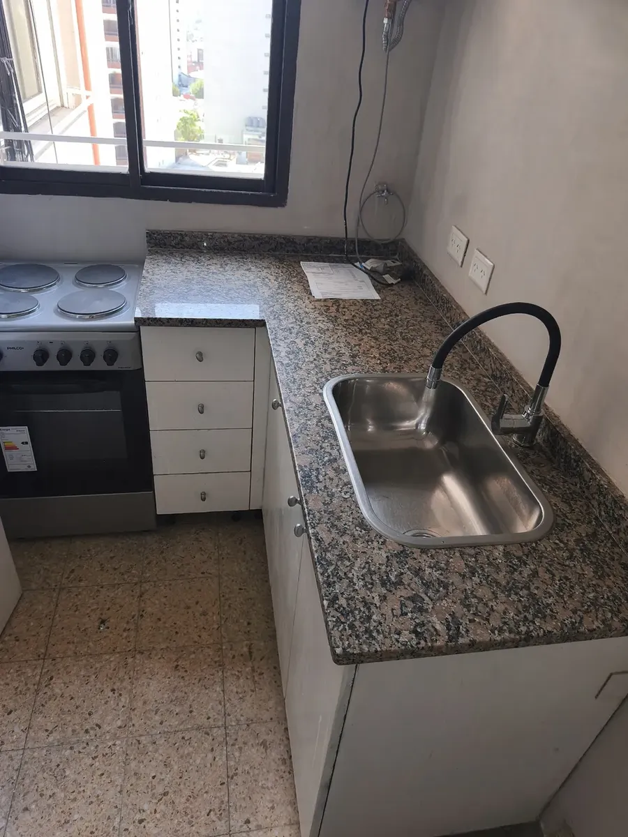 Kitnet de 1 ambiente em Avellaneda, no 10º andar “C”, com vista lateral para a Av. Mitre. O ambiente mede 5 x 3 metros, com piso de madeira, dois armários embutidos e janela voltada para a lateral da avenida. Cozinha separada (1,70 x 2,70 m) com móveis na parte inferior, roupeiro, bancada de granito com cuba de aço inox, misturador monocomando, fogão e janela com vista lateral; banheiro completo com ducha. O apartamento é totalmente elétrico, sem gás natural. O aluguel é de $400.000 mensais, com