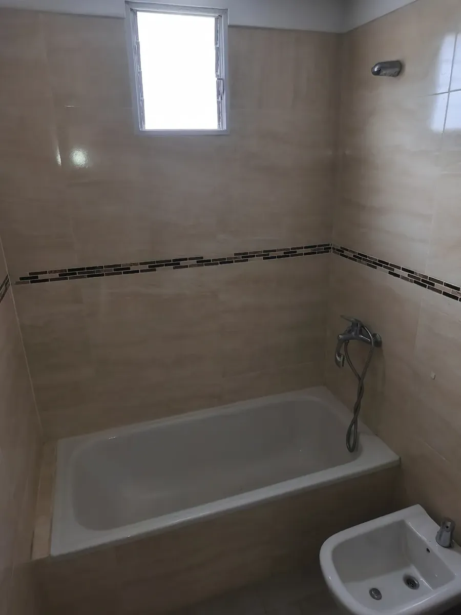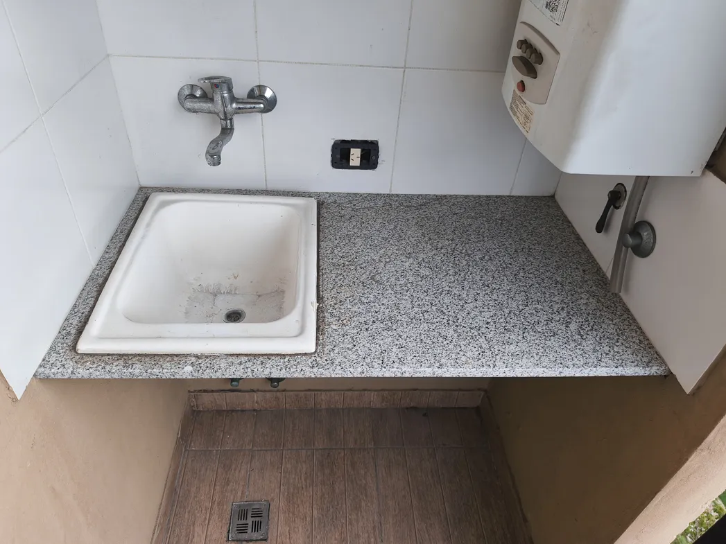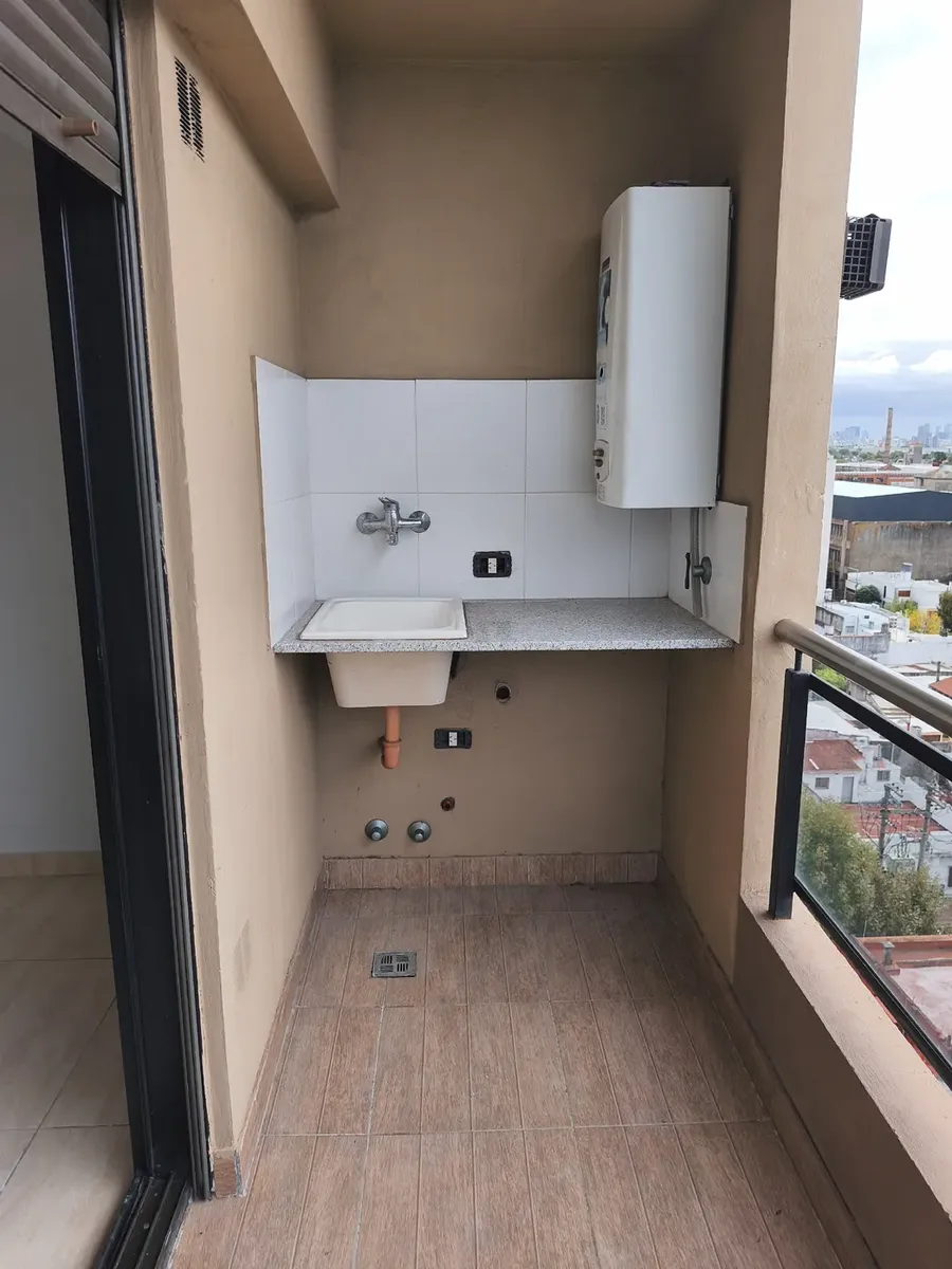 Kitnet de 1 ambiente com 10º andar em Av. Mitre 1660, Avellaneda, com frente para o miolo de quadra (contrafrente). Área principal de 7,50 x 4,30 m com piso de porcelanato, estufa de tiro balanceado Orbis Calorama e janela com persiana. Cozinha integrada com móveis sob a bancada e alacena; entrega sem fogão. Varanda com área de lavanderia independente, cuba em granito, torneira monocomando e pré-instalação para máquina de lavar, além de aquecedor a gás Orbis. Banheiro completo com banheira, armá