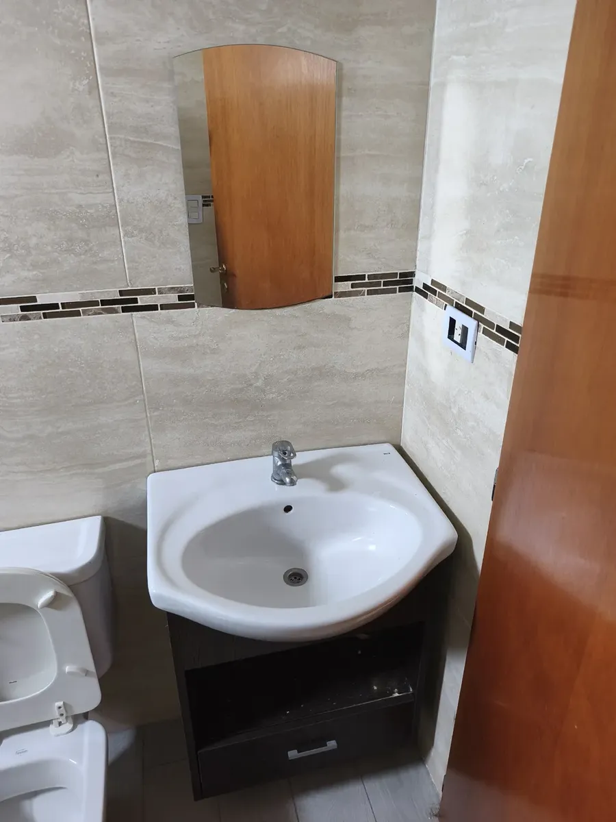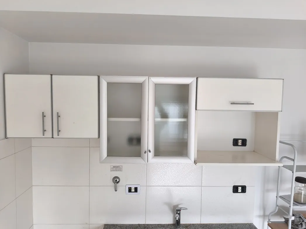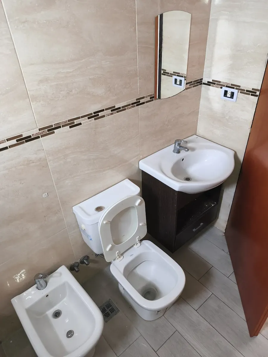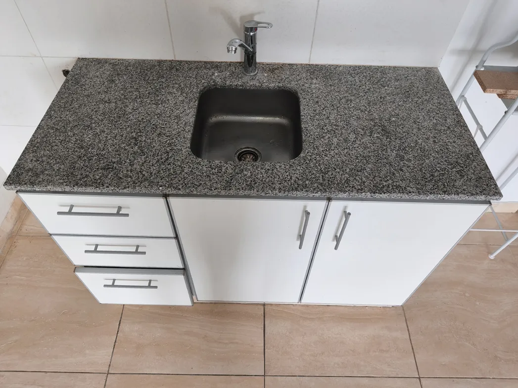 Kitnet de 1 ambiente com 10º andar em Av. Mitre 1660, Avellaneda, com frente para o miolo de quadra (contrafrente). Área principal de 7,50 x 4,30 m com piso de porcelanato, estufa de tiro balanceado Orbis Calorama e janela com persiana. Cozinha integrada com móveis sob a bancada e alacena; entrega sem fogão. Varanda com área de lavanderia independente, cuba em granito, torneira monocomando e pré-instalação para máquina de lavar, além de aquecedor a gás Orbis. Banheiro completo com banheira, armá