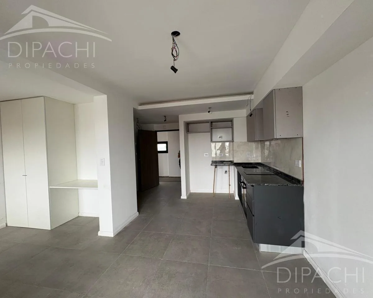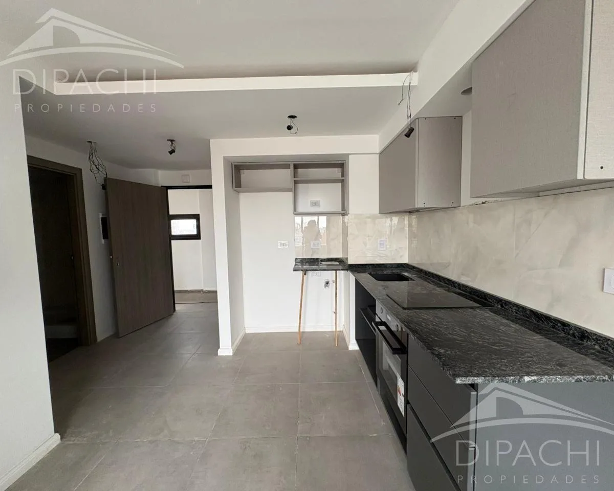 Apartamento tipo kitnet e meio novo para locação, com 40 m² totais, no 14º andar do edificio Palaá Green Tower, em Avellaneda. Entrada com cozinha integrada e bancada de granito negro, armários inferiores e aéreos em tom cinza-escuro, cuba de aço inox Mi Pileta e torneiras Ferrum. Espaço para geladeira, lavadora e lava-louças; equipado com fogão cooktop e forno elétricos Orbis e ar-condicionado instalado. Quarto com armário embutido em melamina branca; banheiro completo com ducha e varanda de ap