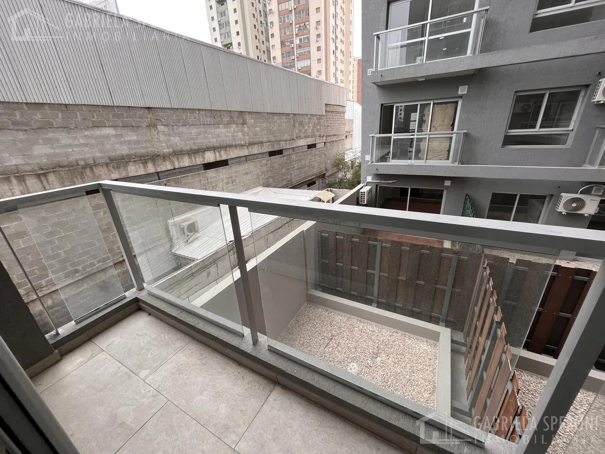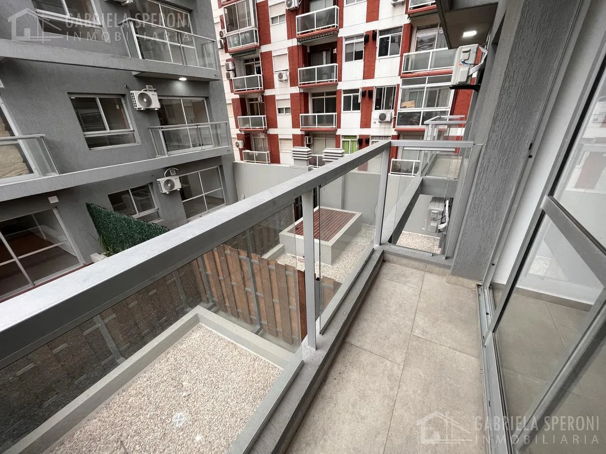 Kitnet em Avellaneda, no complexo Terrazas de Avellaneda, em edifício com duas torres de 14 andares e elevadores. O apartamento dispõe de living integrado com ar-condicionado frio/quente e piso de porcelanato rústico; cozinha independente com bancada de granito cinza e fogão Domec, pia de aço inox, torneira preta FV e espaço para máquina de lavar. Banheiro completo com box para chuveiro e ventilação natural, com louças Ferrum ou Roca e torneiras FV. Possui água quente central; o prédio oferece p