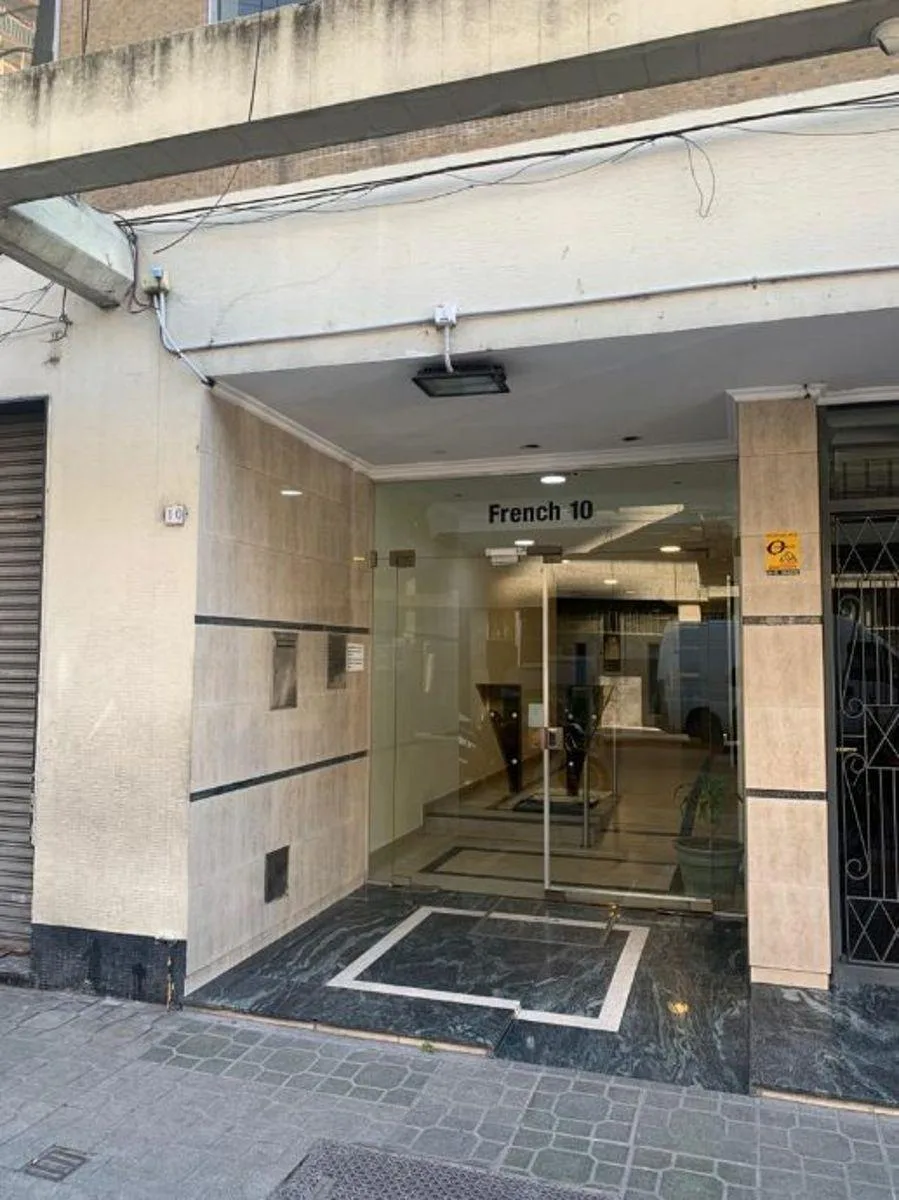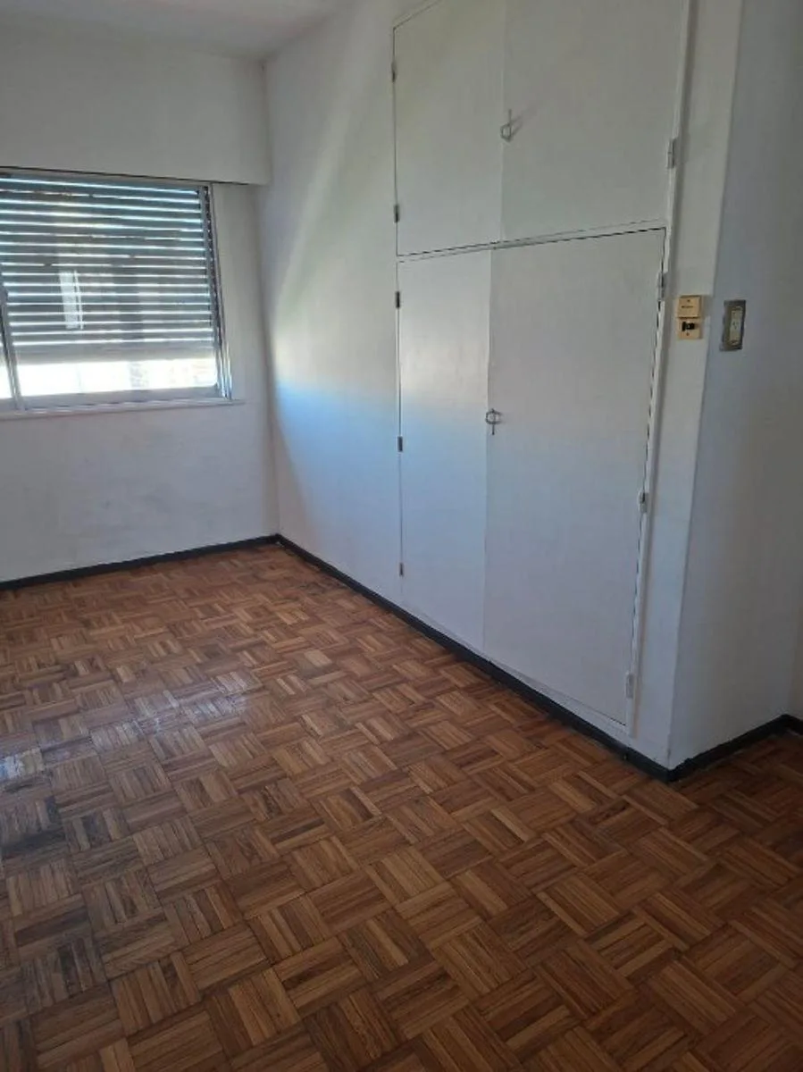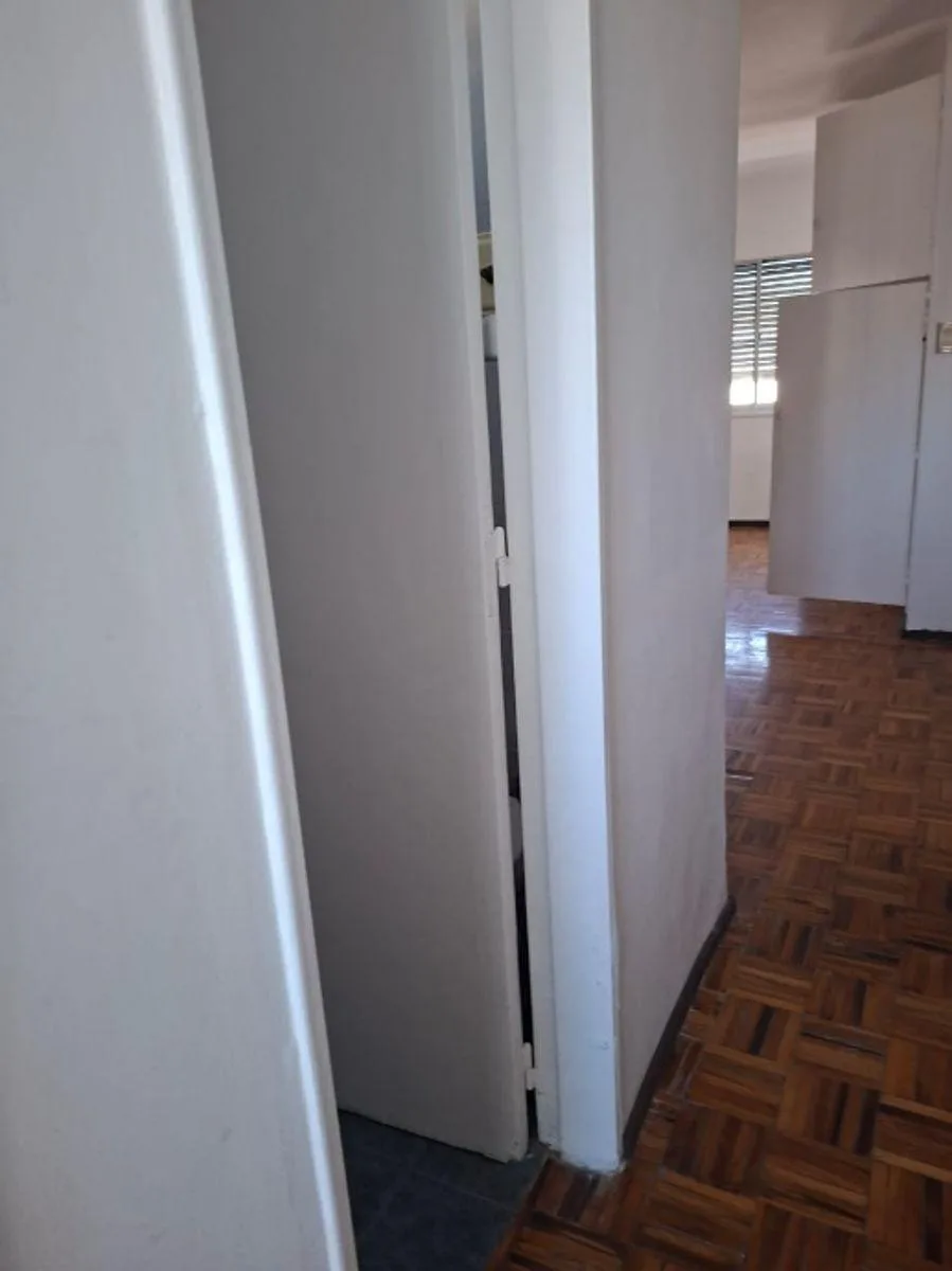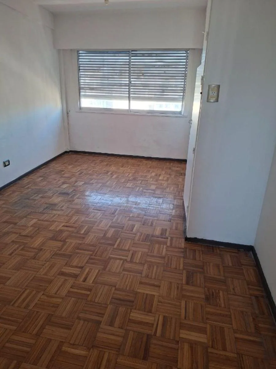 Apartamento de 1 ambiente divisível, de frente, com cozinha pequena e banheiro completo com banheira. O ambiente pode ser dividido em sala e dormitório separados, com piso de parquet e armário embutido. Condomínio cerca de $130.000, além de TSG, AYSA, eletricidade e gás.