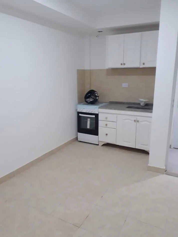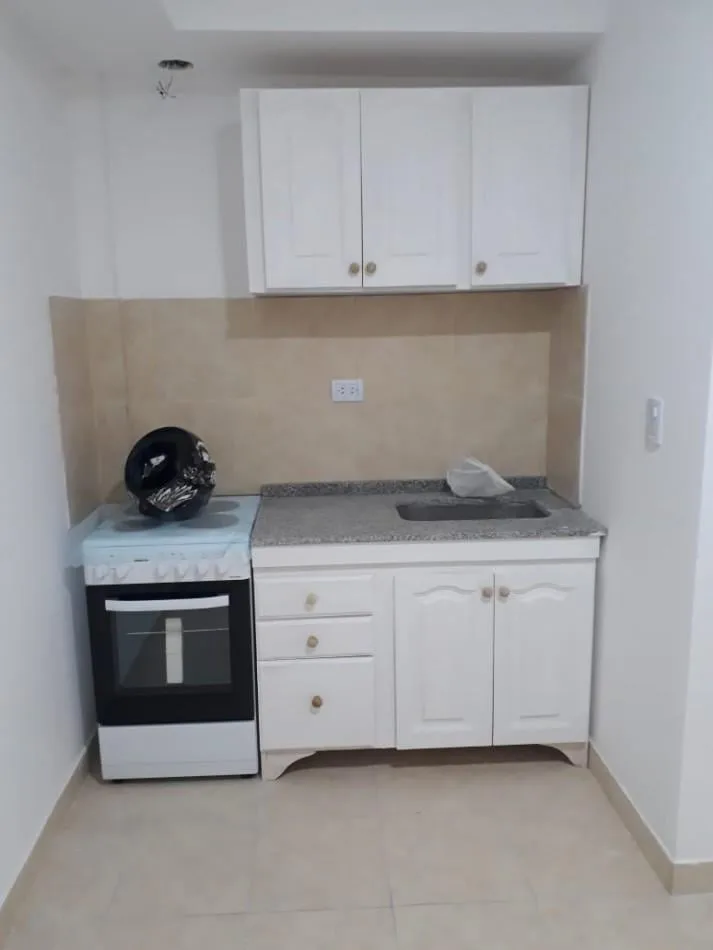 Kitnet dividida em 3º andar, de frente, com varanda. Área de cozinha e sala de jantar com bancada, pia e torneira; armário sob a bancada com gavetas e despensa; área de dormitório na parte da frente com varanda e banheiro. Água quente por caldeira central. Superfície coberta e total de 21 m². Condomínio de aproximadamente $ 60.000. Contrato de 24 meses; garantia a combinar; atualização trimestral pelo índice IPC.