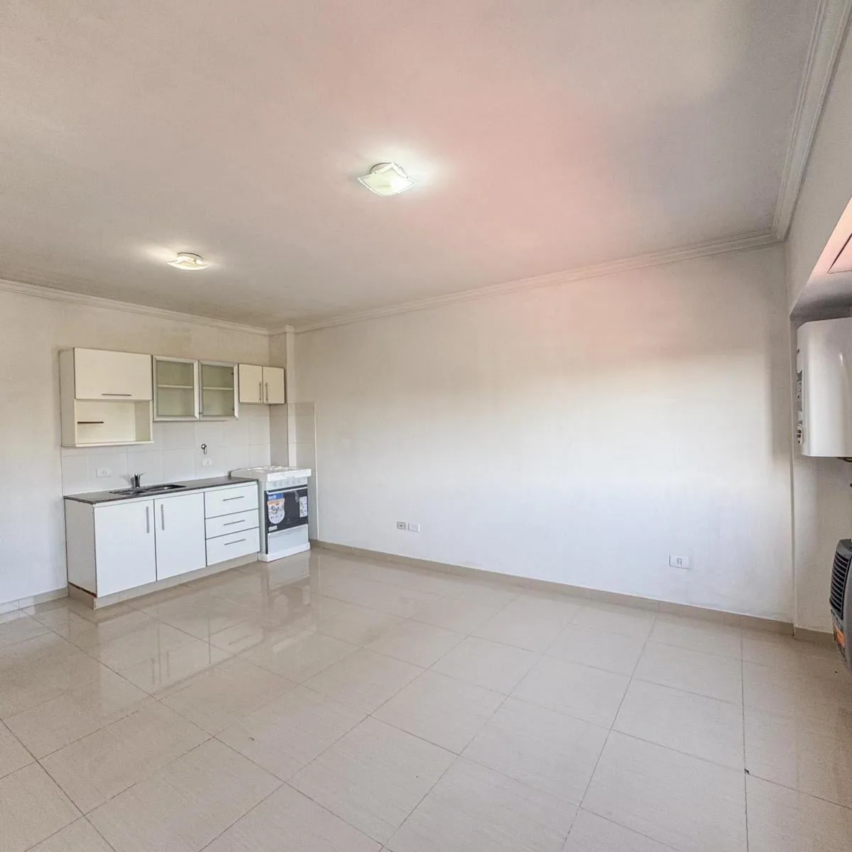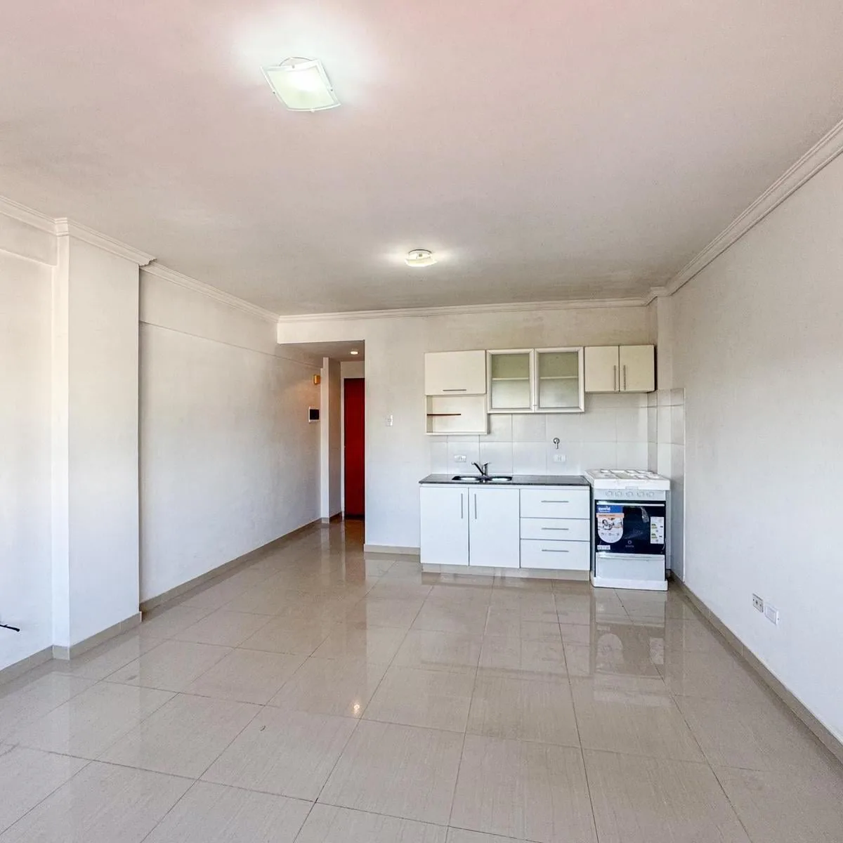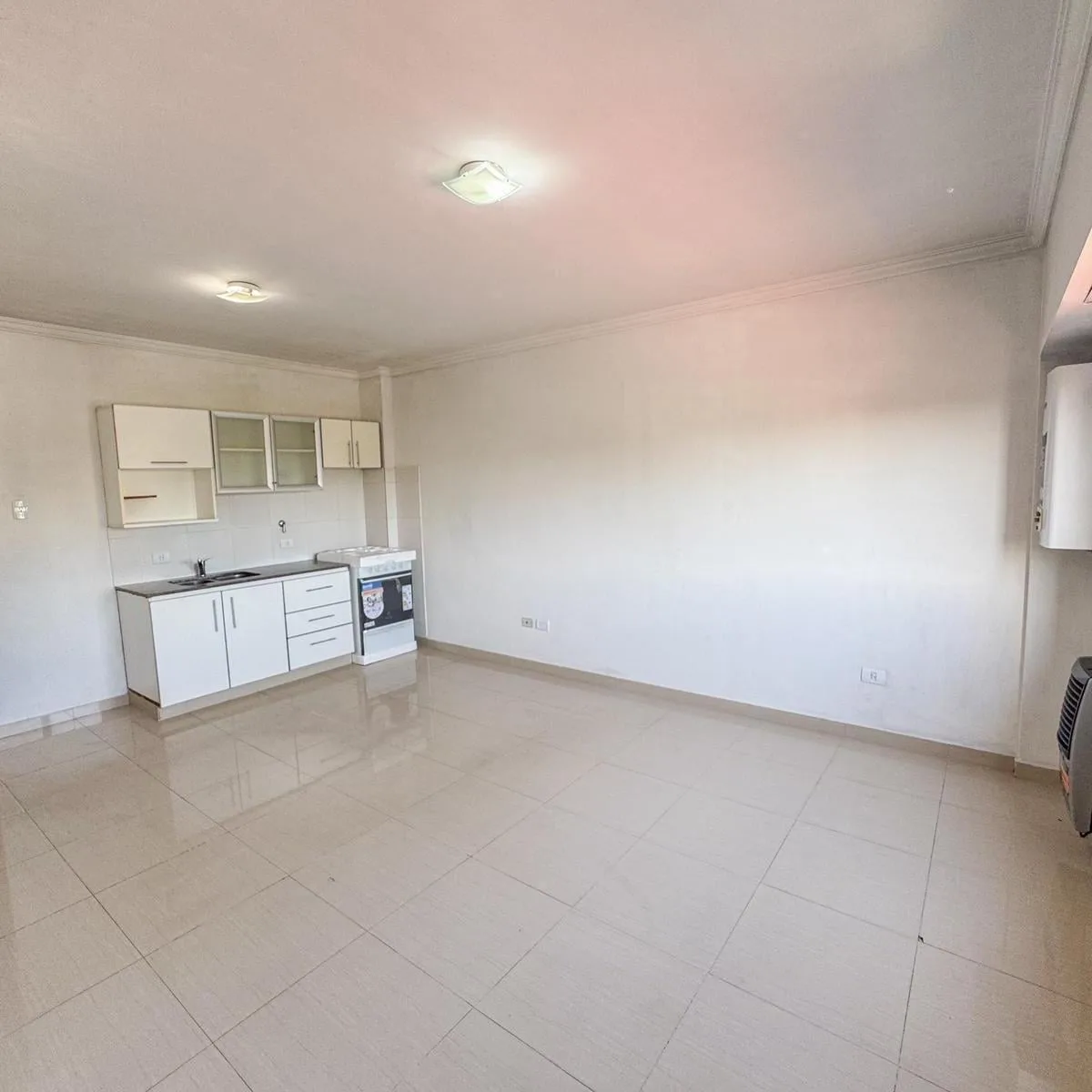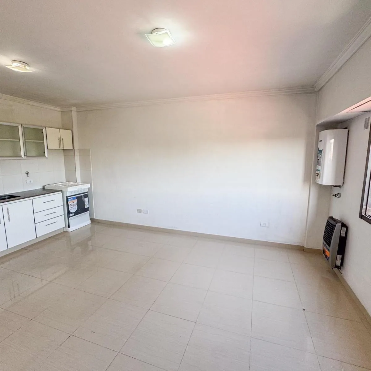 Kitnet de 1 ambiente para aluguel em Avellaneda. Possui 1 banheiro completo com banheira, piso de porcelanato e cozinha integrada com móveis planejados (alto e baixo) e fogão novo (a estrenar). Há janela com persianas, orientação suroeste, ventilação e iluminação natural.