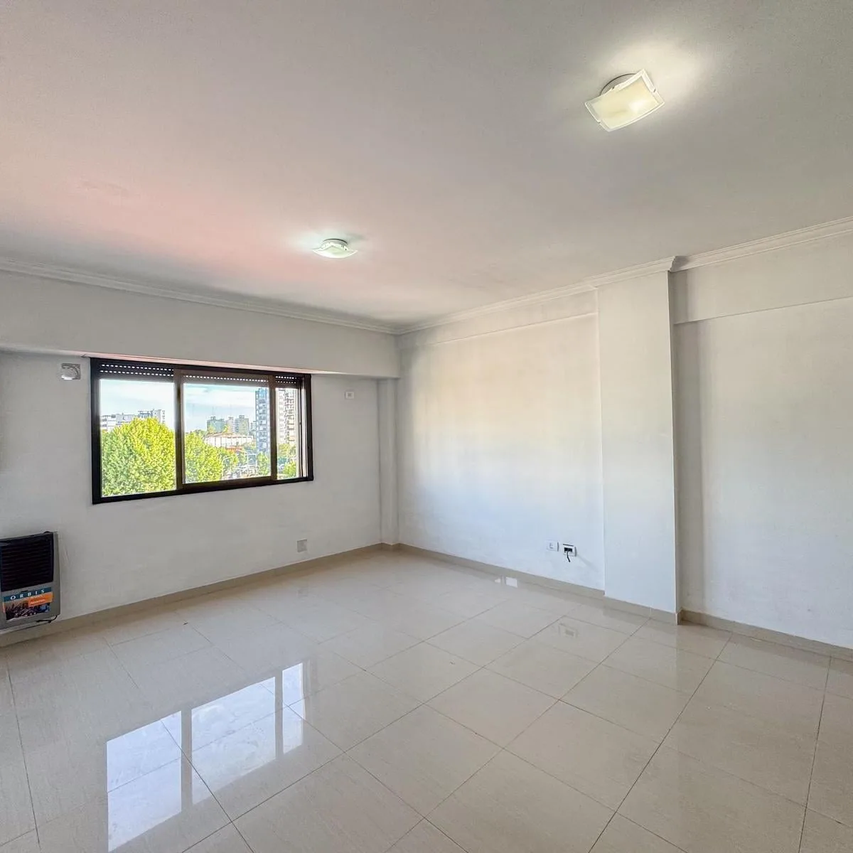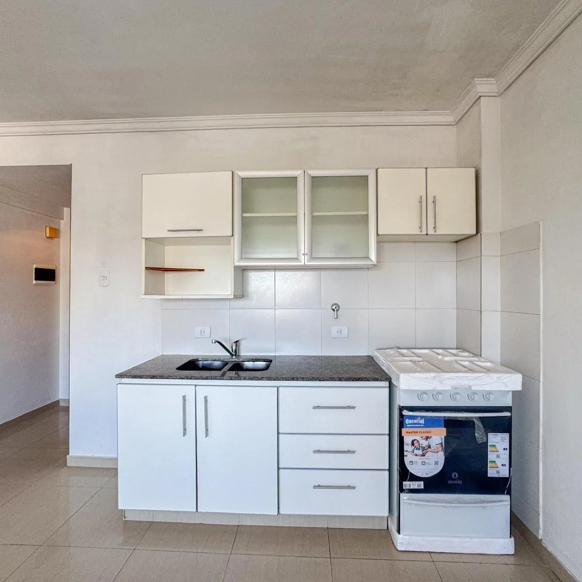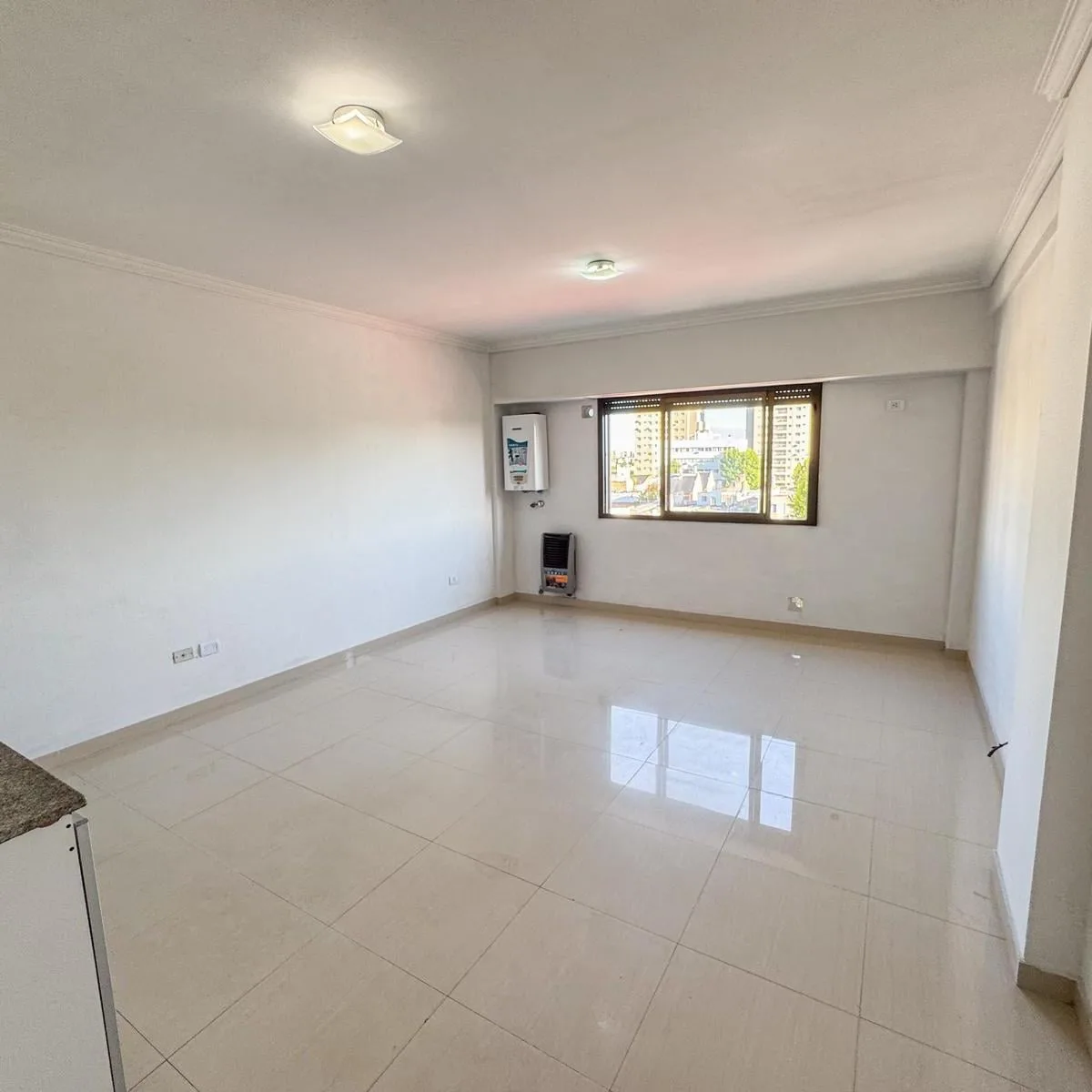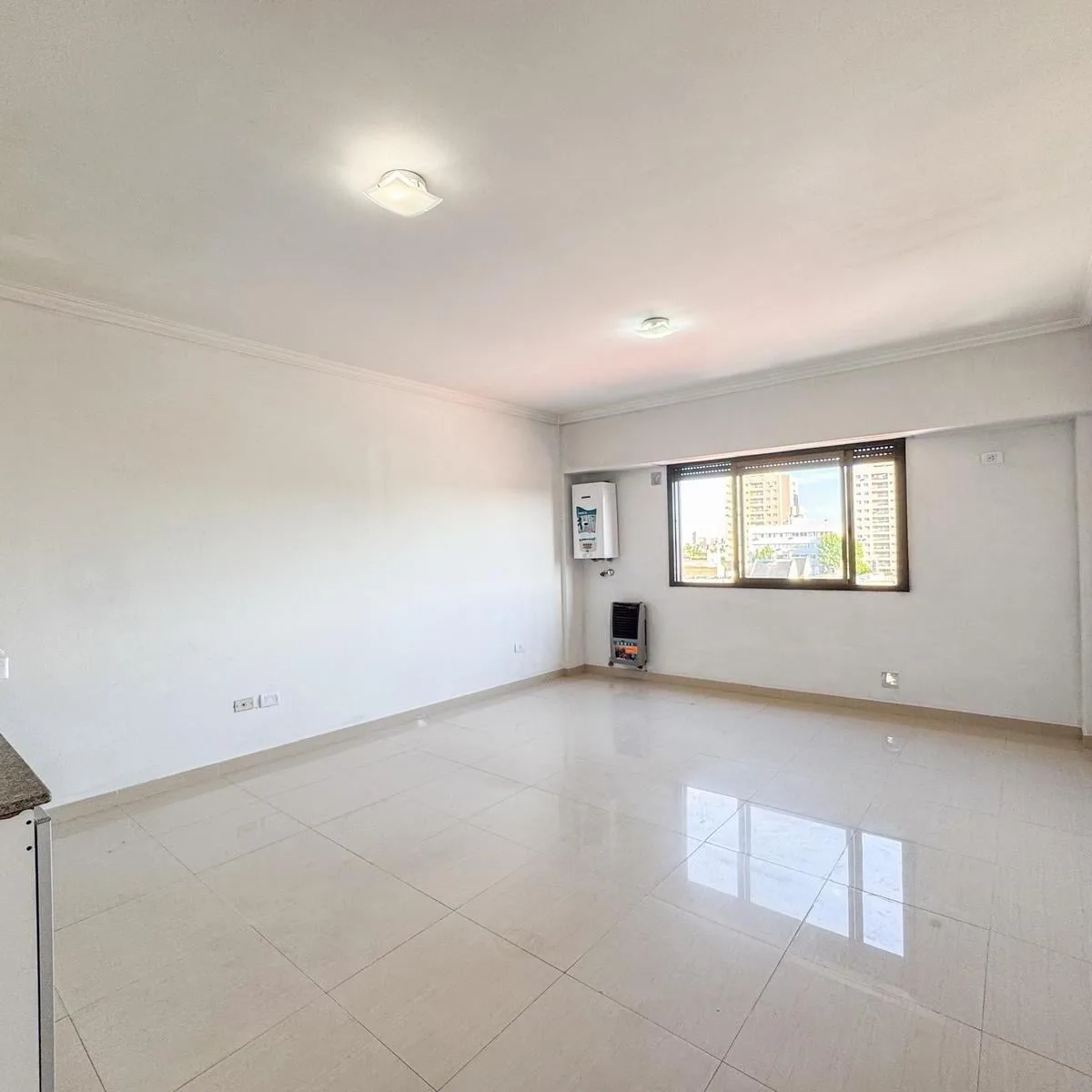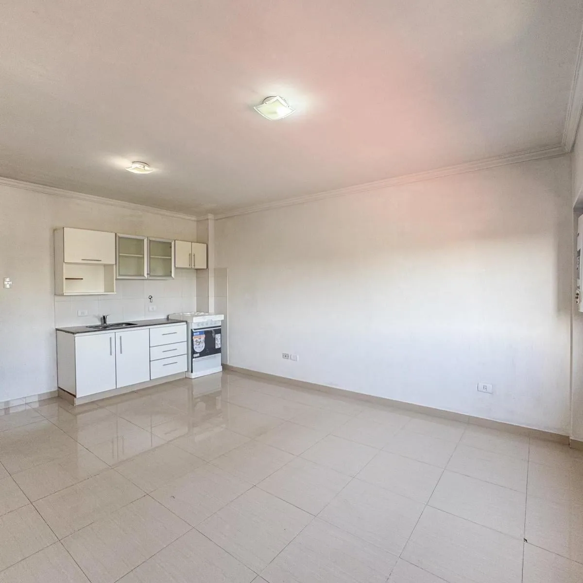 Kitnet de 1 ambiente para aluguel em Avellaneda. Possui 1 banheiro completo com banheira, piso de porcelanato e cozinha integrada com móveis planejados (alto e baixo) e fogão novo (a estrenar). Há janela com persianas, orientação suroeste, ventilação e iluminação natural.