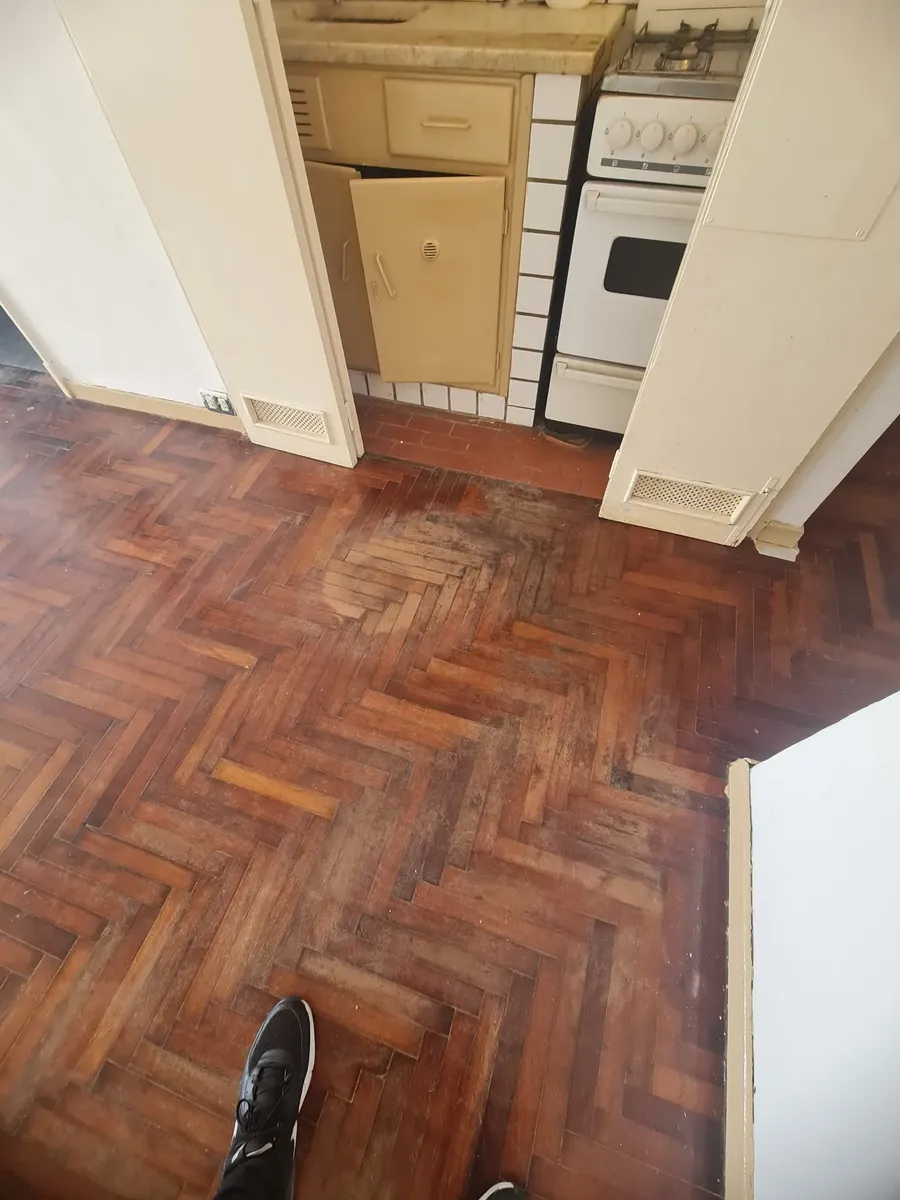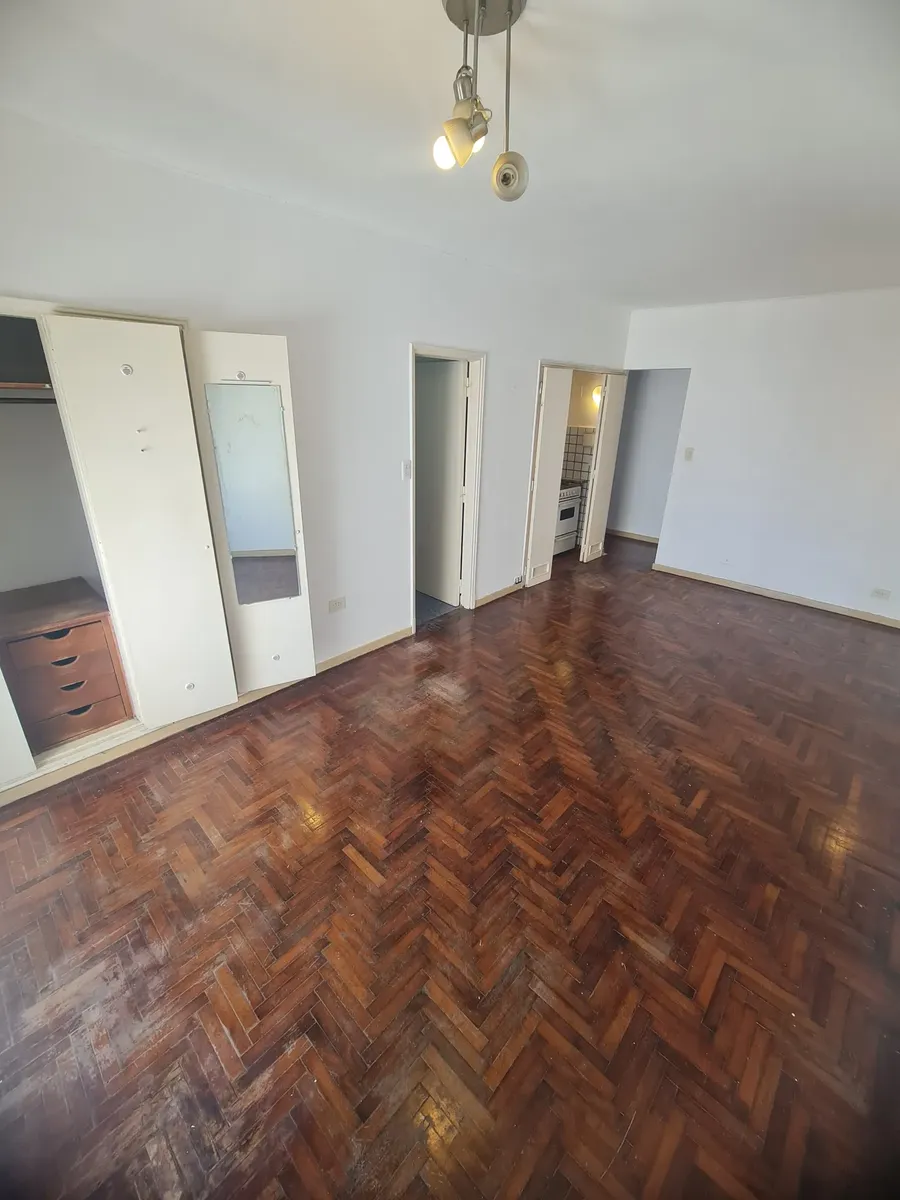 Kitnet (monoambiente) de 30 m² totais e 30 m² cobertos, em prédio urbano. Possui um ambiente principal integrado com piso de madeira e janelão com acesso a uma varanda com vista para a cidade. Cozinha independente com móveis sob a bancada e fogão a gás. Banheiro tradicional com box de ducha, vaso sanitário, bidê e lavatório, com revestimento cerâmico em tons de azul.