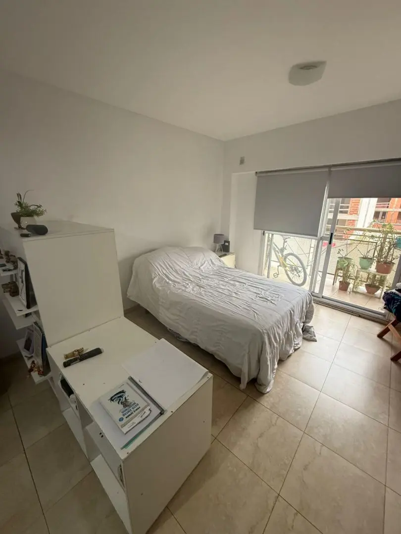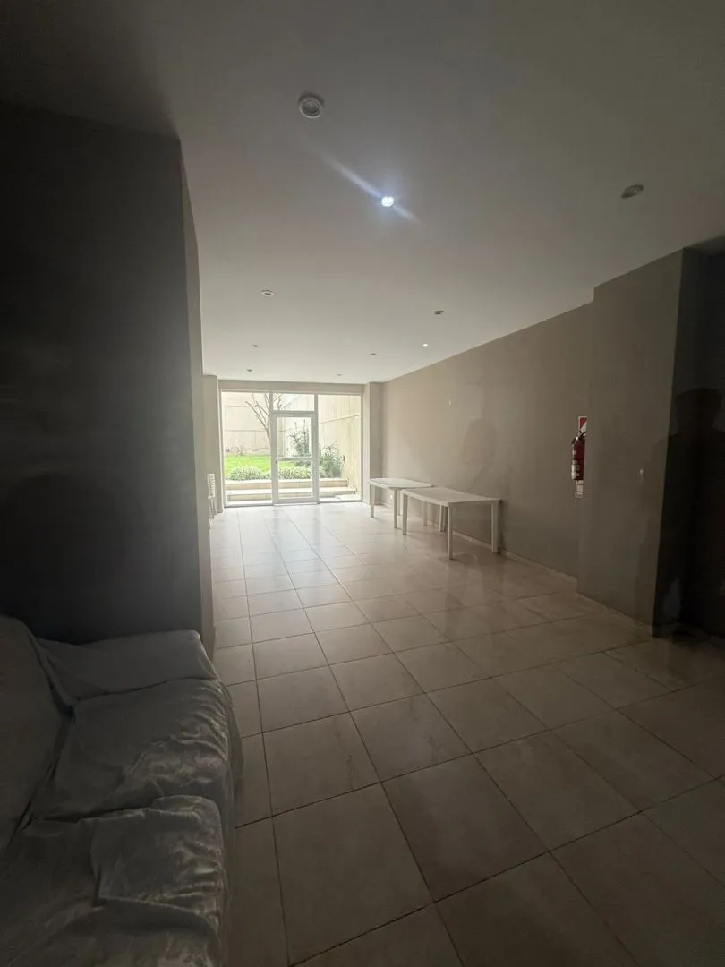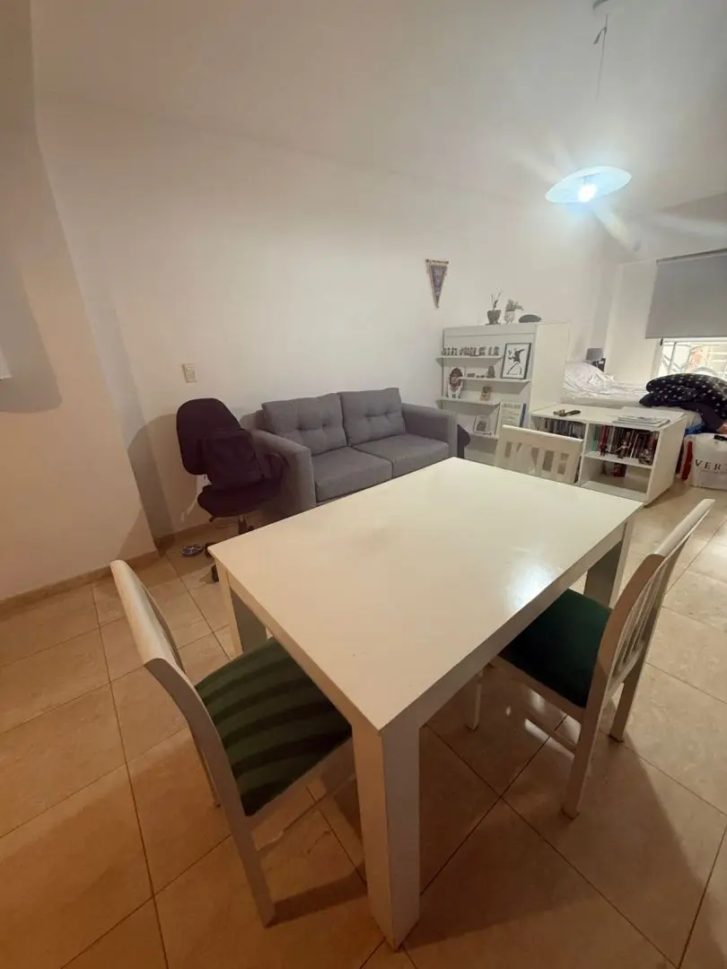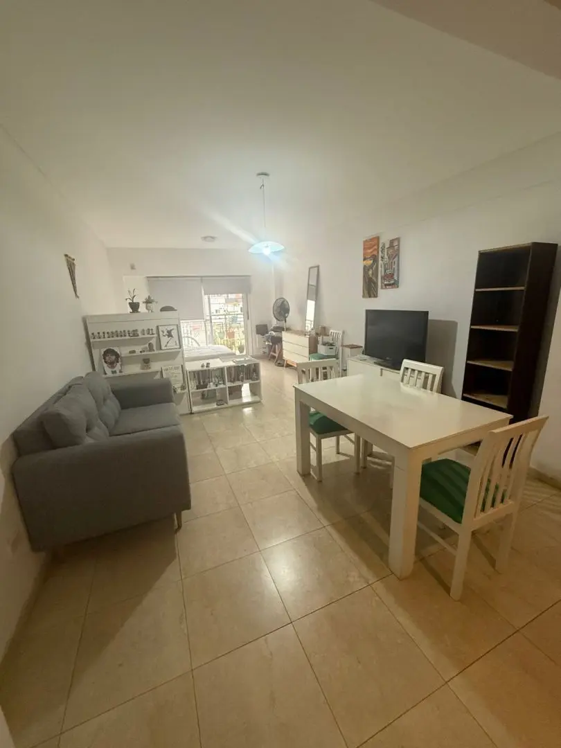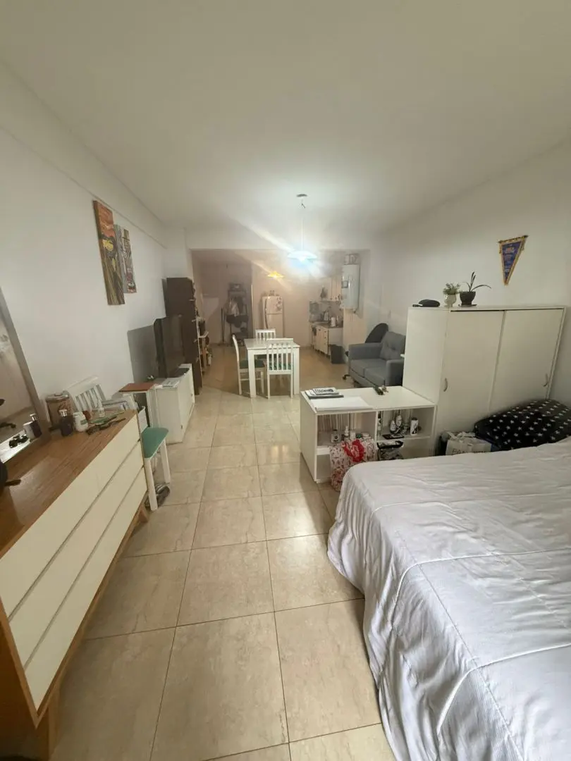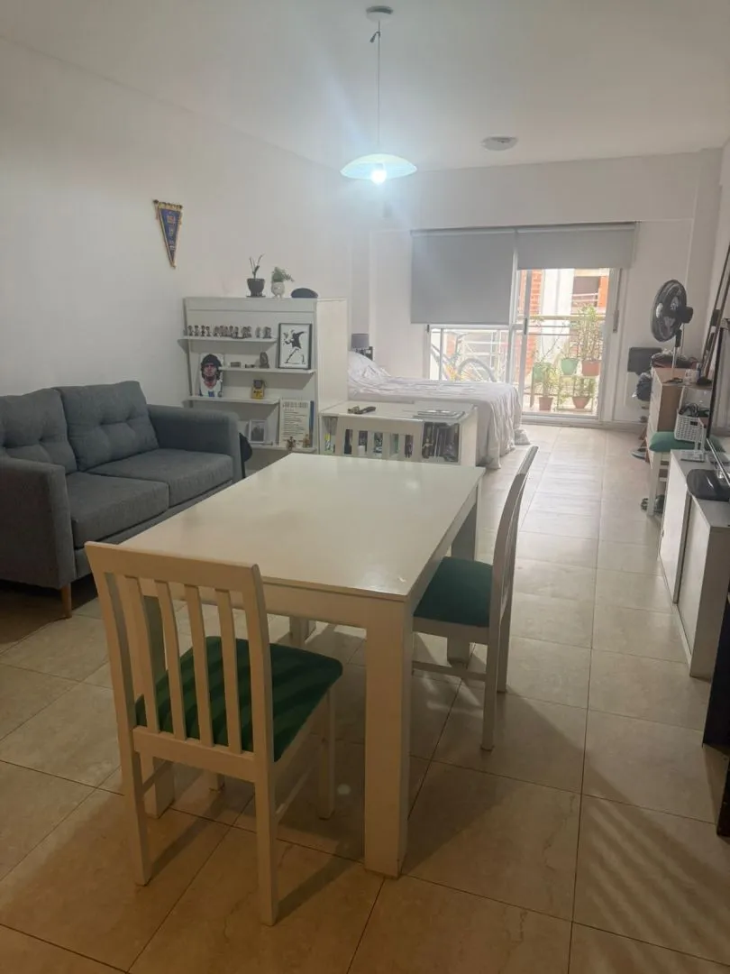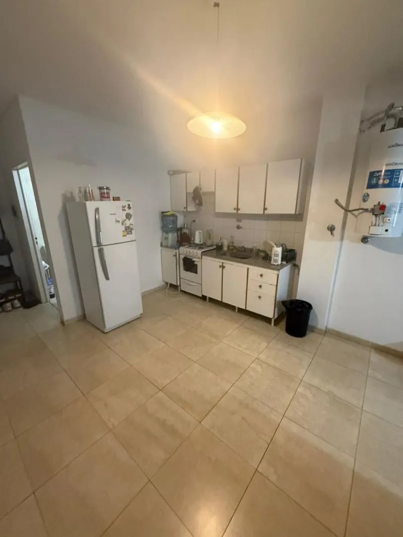 Kitnet (monoambiente) para alugar em Barracas, Buenos Aires. Unidade com ambiente único e cozinha integrada mobiliada com armários aéreos e módulos inferiores, além de banheiro completo com banheira. O prédio tem SUM e área verde na planta baixa.