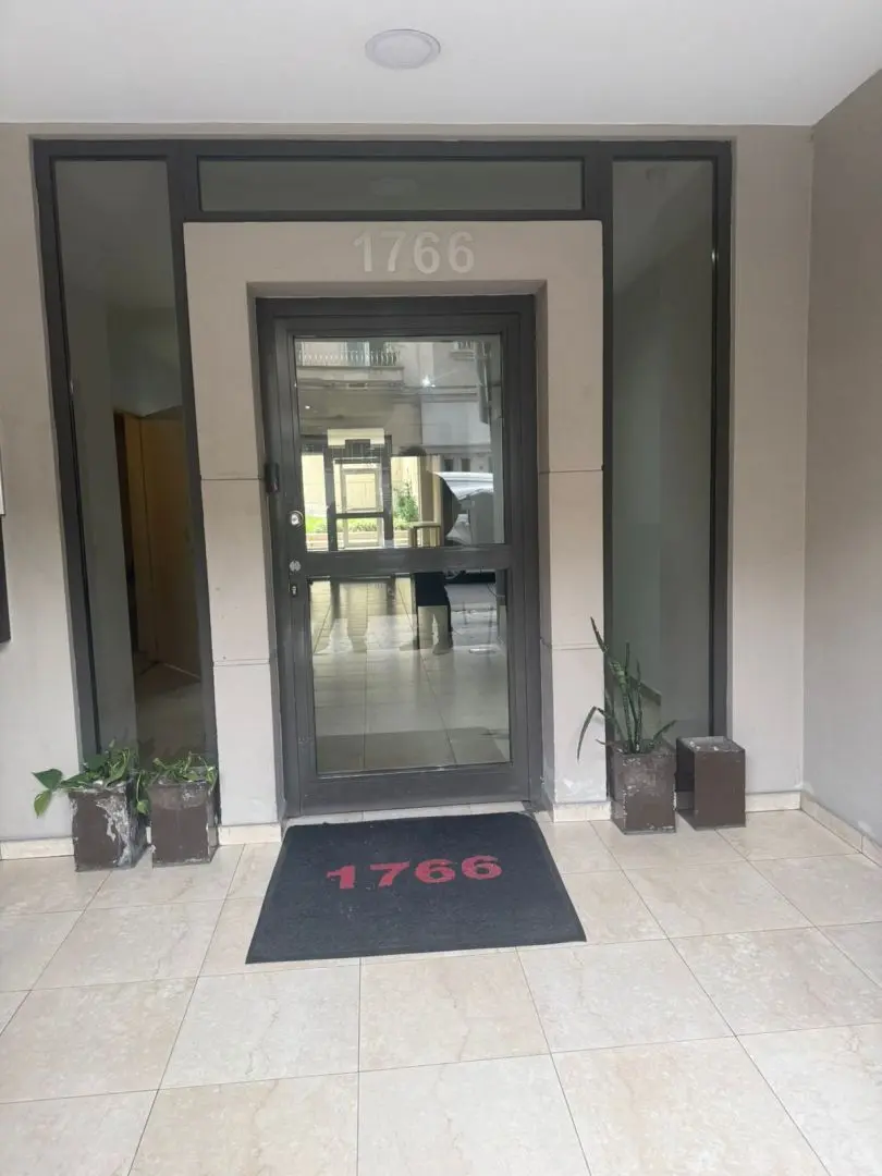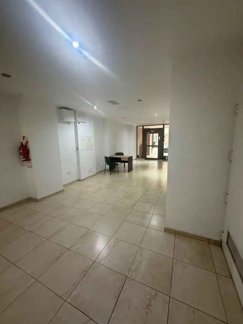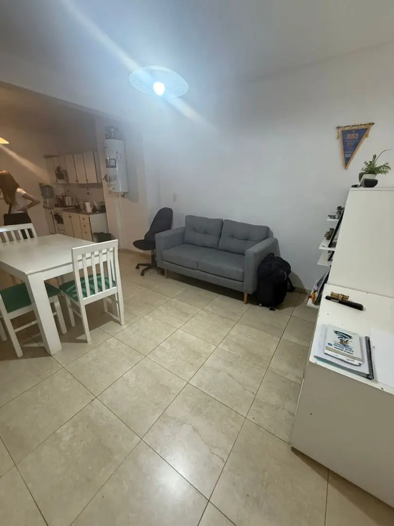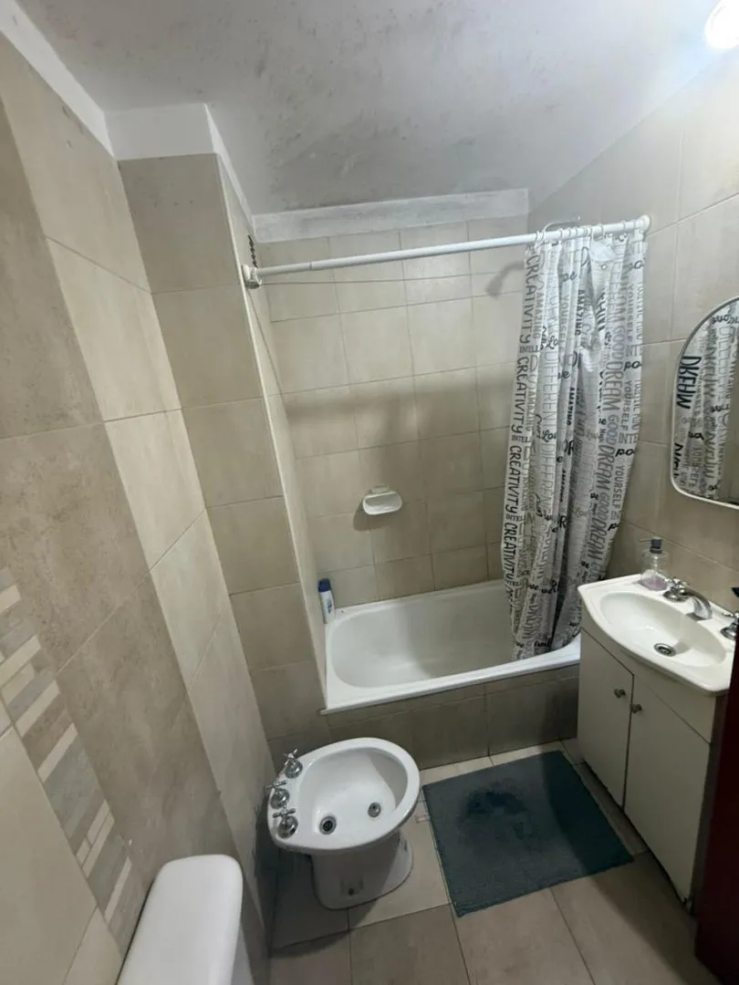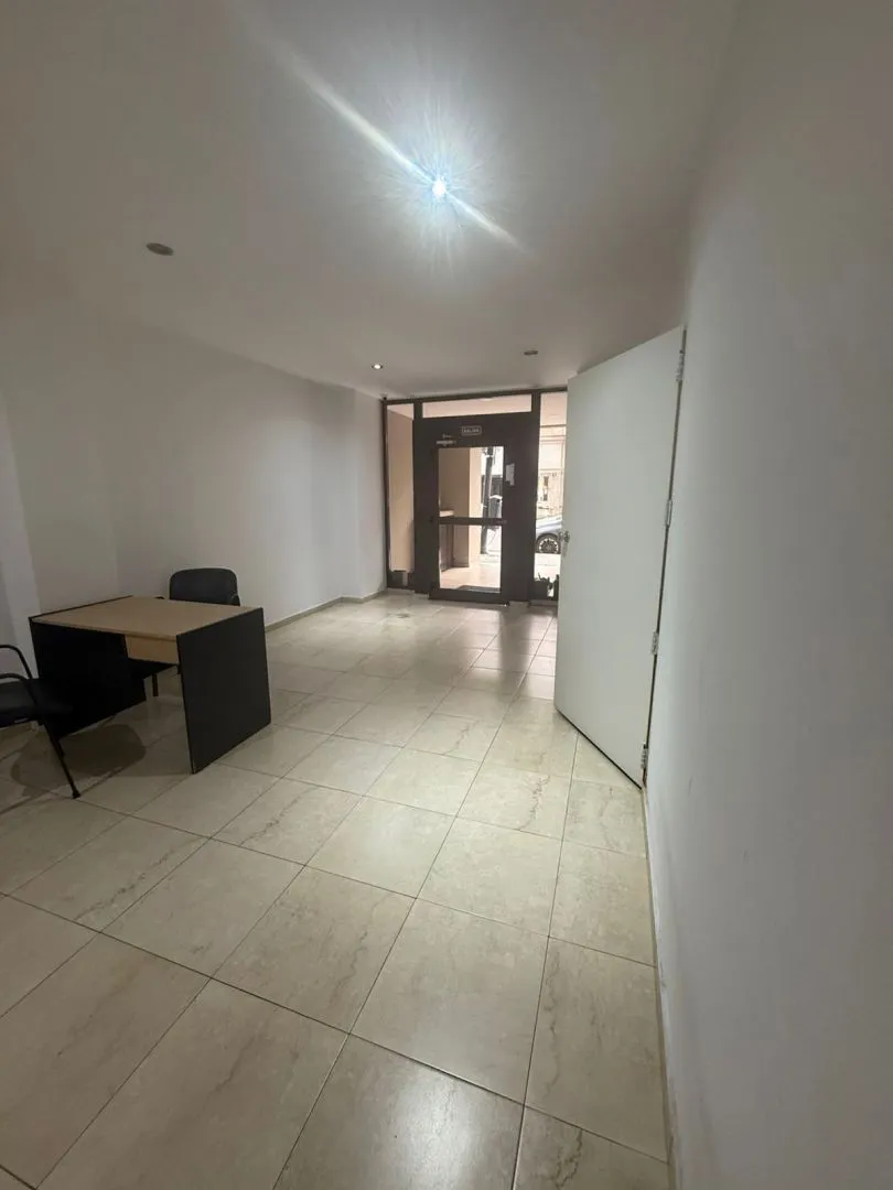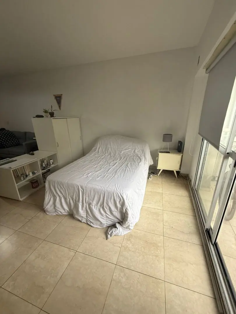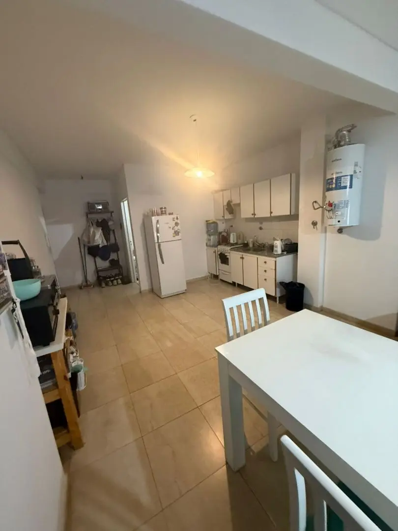 Kitnet (monoambiente) para alugar em Barracas, Buenos Aires. Unidade com ambiente único e cozinha integrada mobiliada com armários aéreos e módulos inferiores, além de banheiro completo com banheira. O prédio tem SUM e área verde na planta baixa.